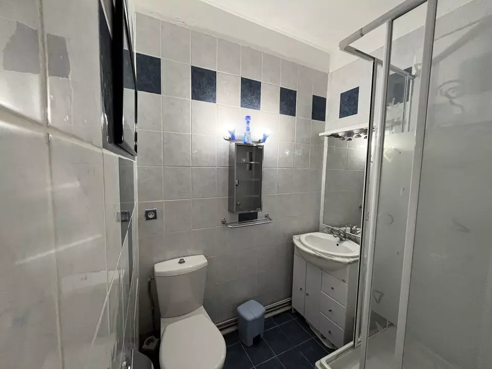 A bathroom (shower, sink, WC).