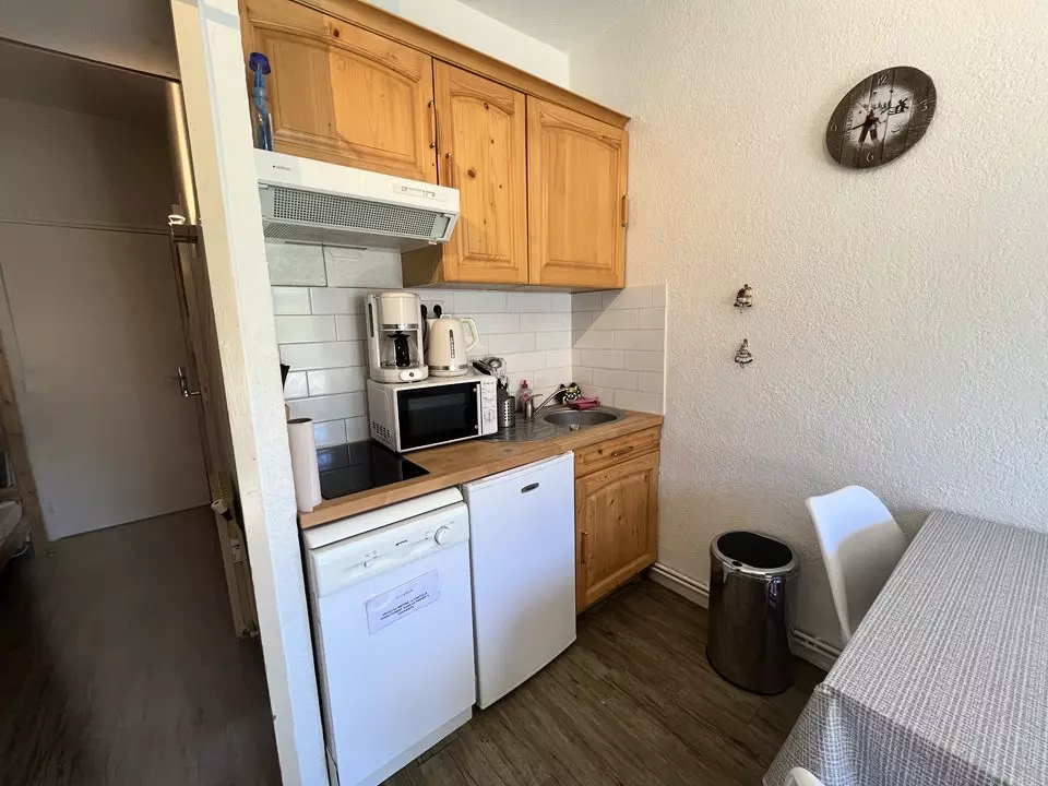 A fully equipped kitchenette: electric hob x 2, top fridge, microwave oven, dishwasher, filter coffee maker, kettle, toaster and mixed raclette/fondue machine.