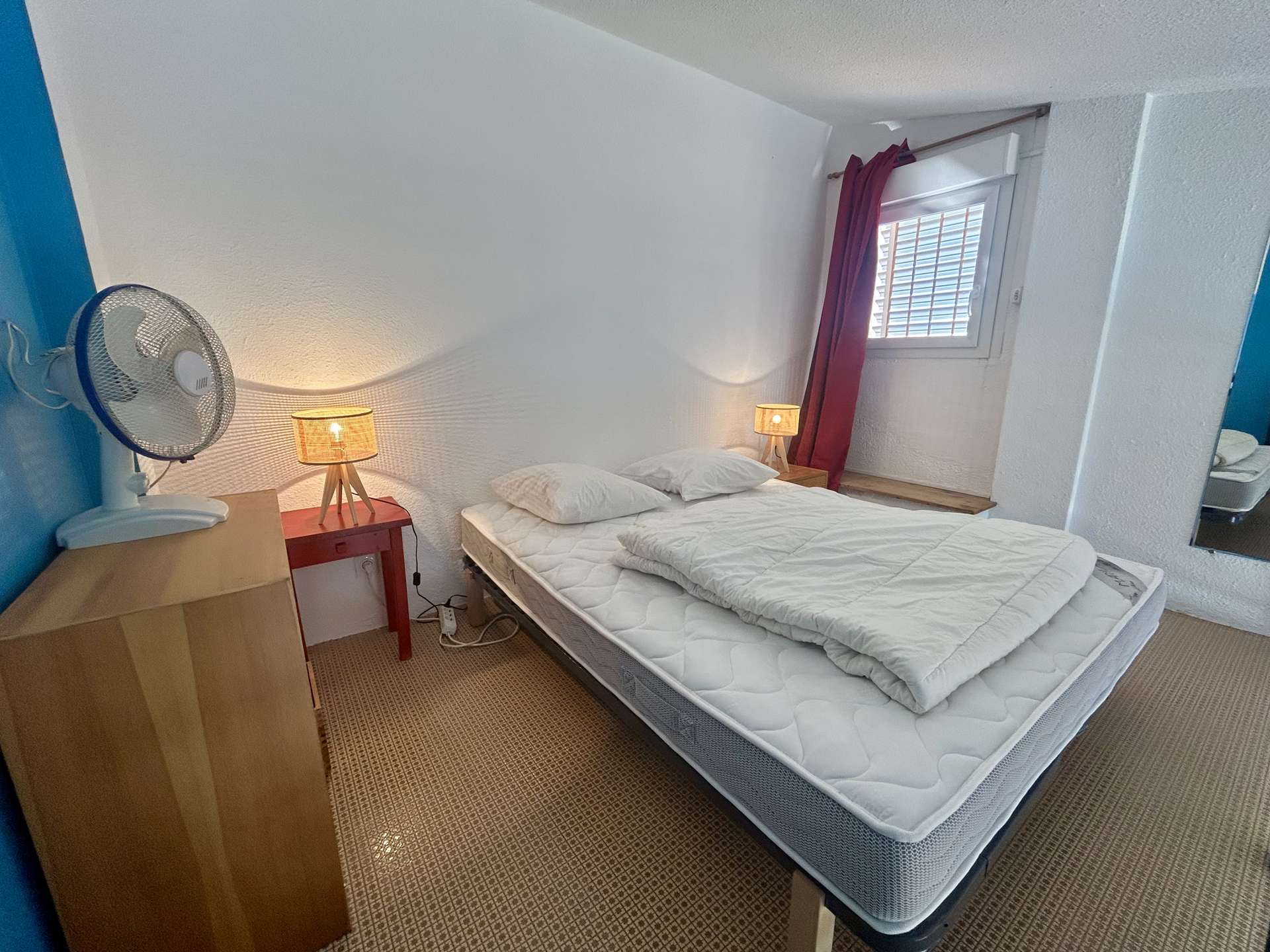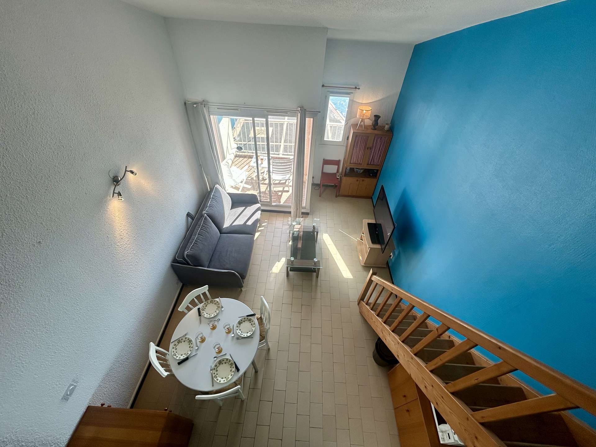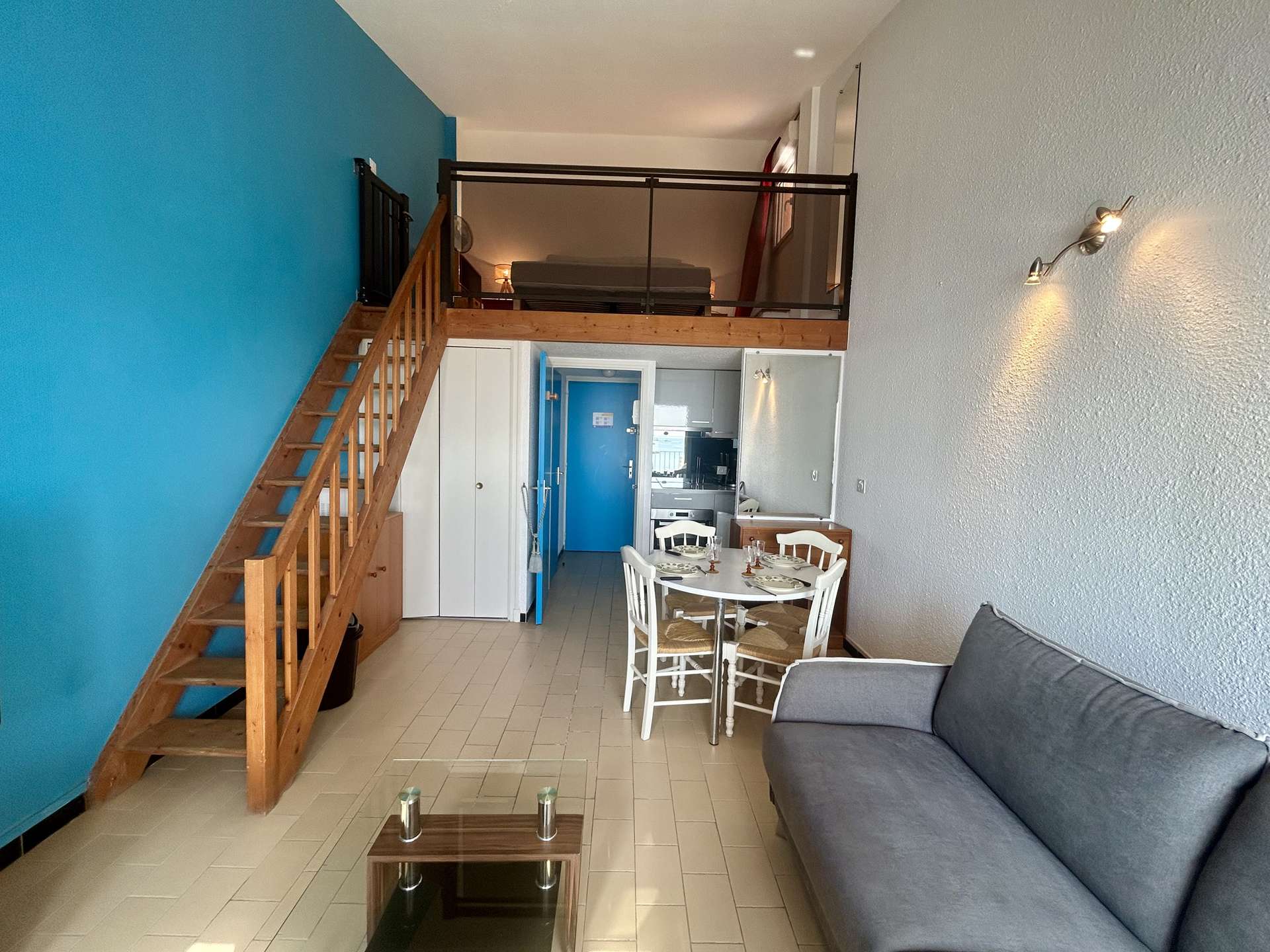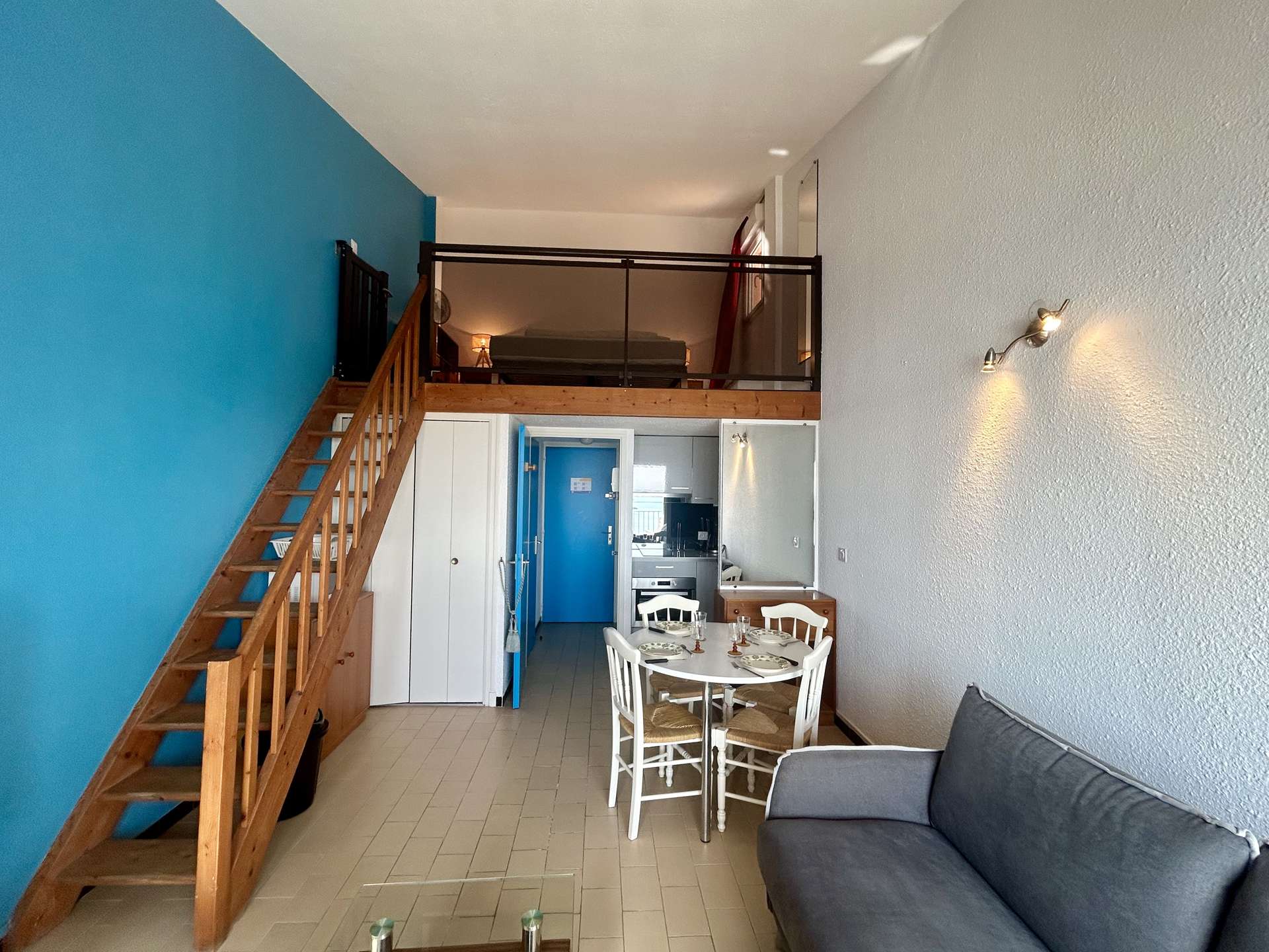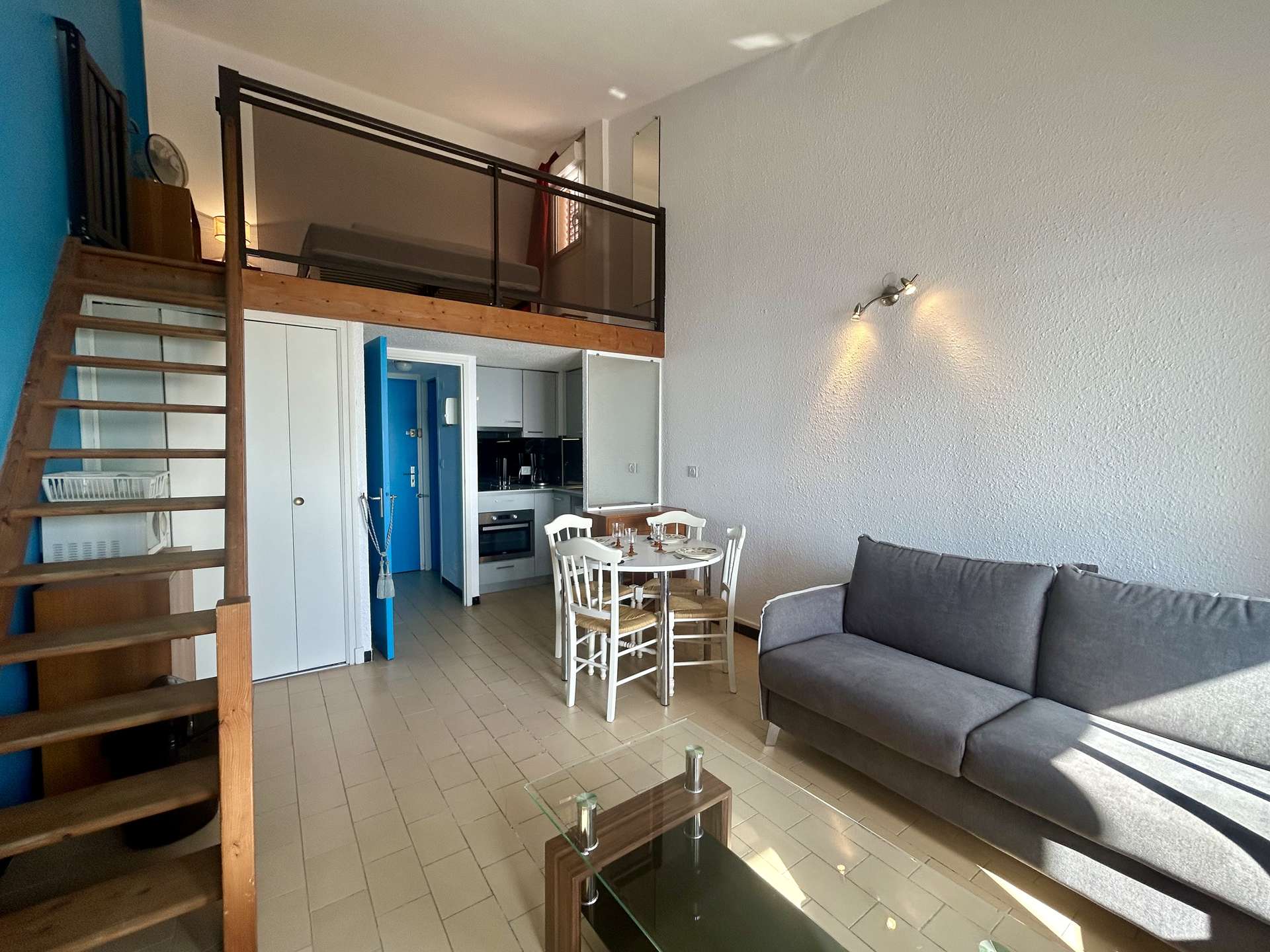 This seaside apartment rental, located on the 4th floor with elevator, includes a living room with a 140 cm sofa bed, a flat-screen TV, and a shower room. On the mezzanine, you will find a 140 cm double bed. You will also enjoy a beautiful terrace with a stunning view of the harbor.