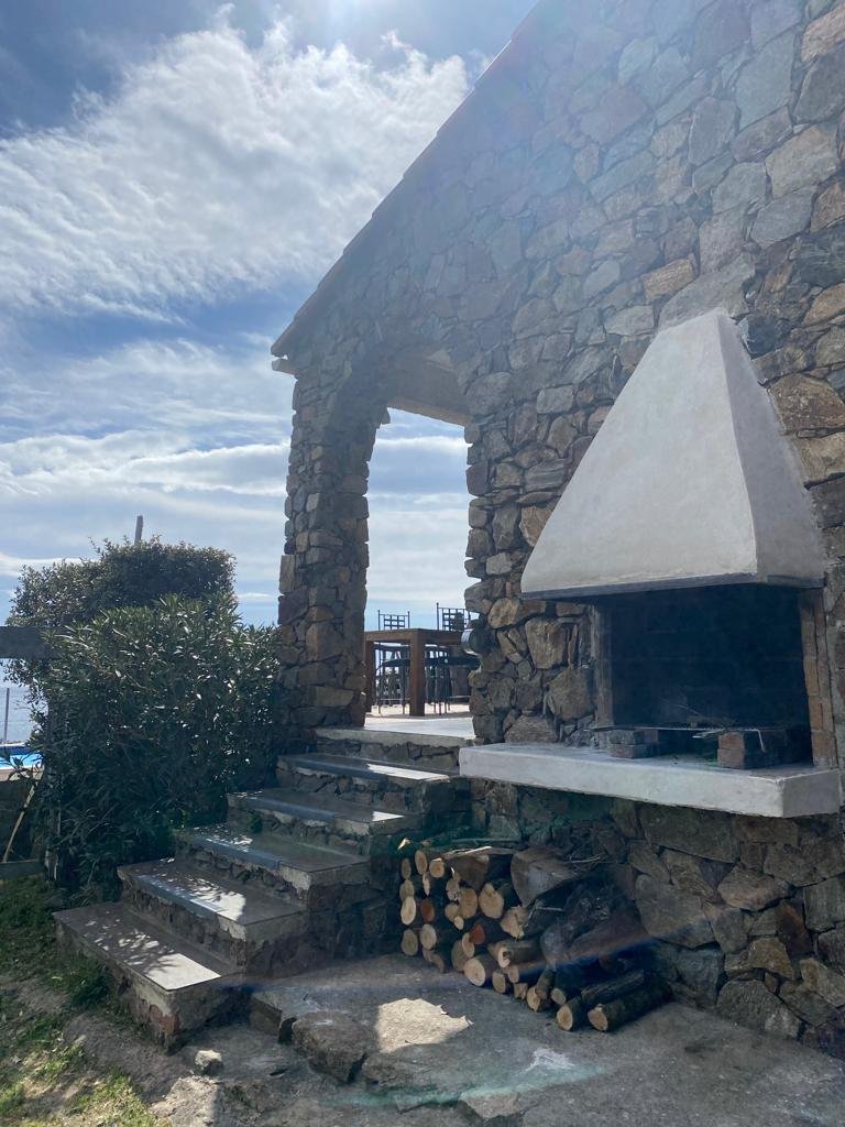 Covered terrace facing the sea: garden furniture, sun loungers, parasol, barbecue