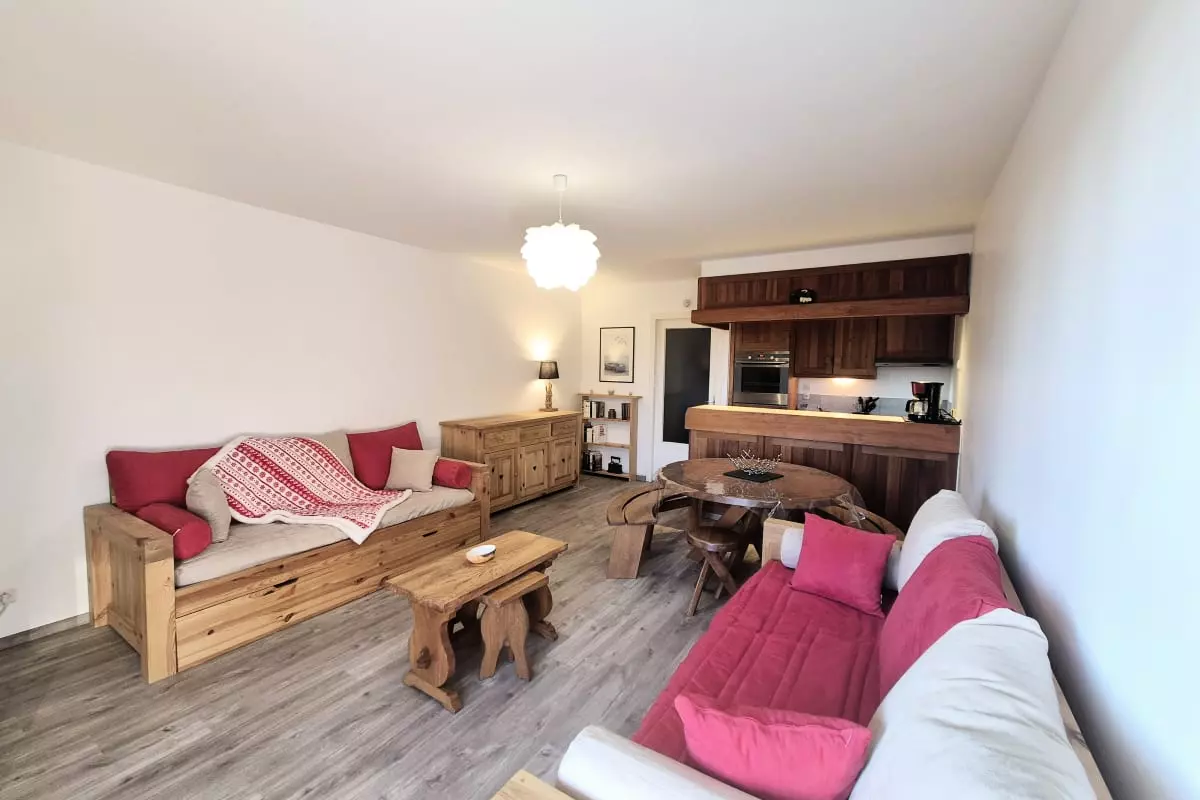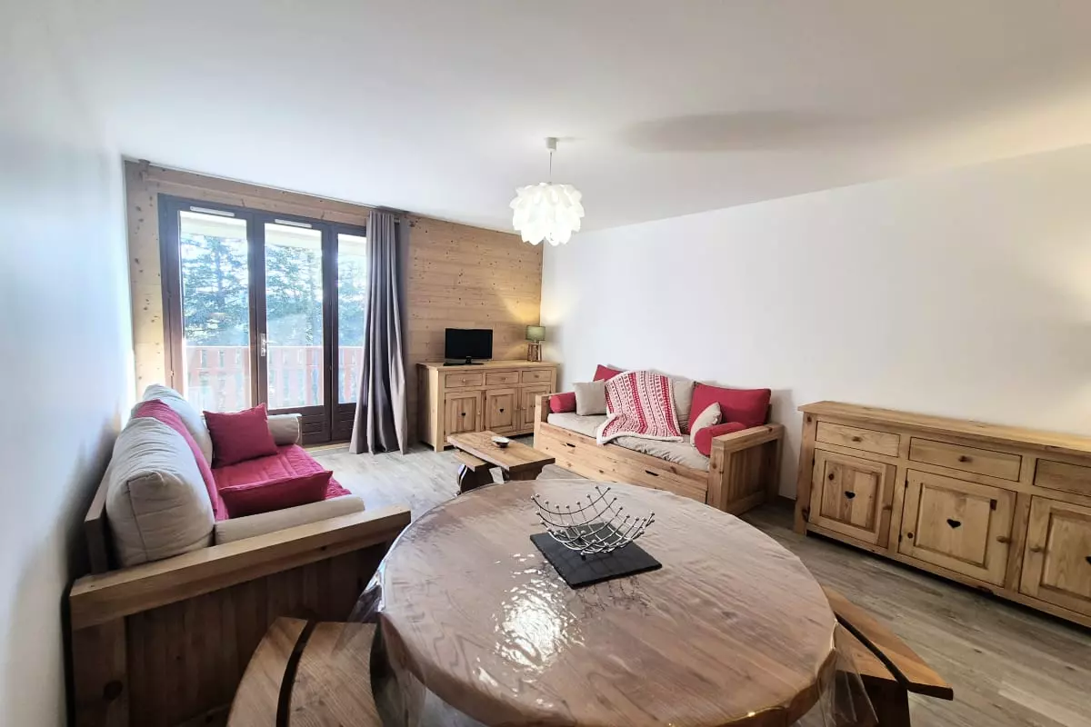 Apartment at the foot of the slopes, with a south-facing terrace, equipped kitchen, sleeping area, and ski-in/ski-out access. Ideal for a family vacation combining skiing, hiking, and nature. At an altitude of 1,500 m, enjoy breathtaking views and numerous activities in both summer and winter!