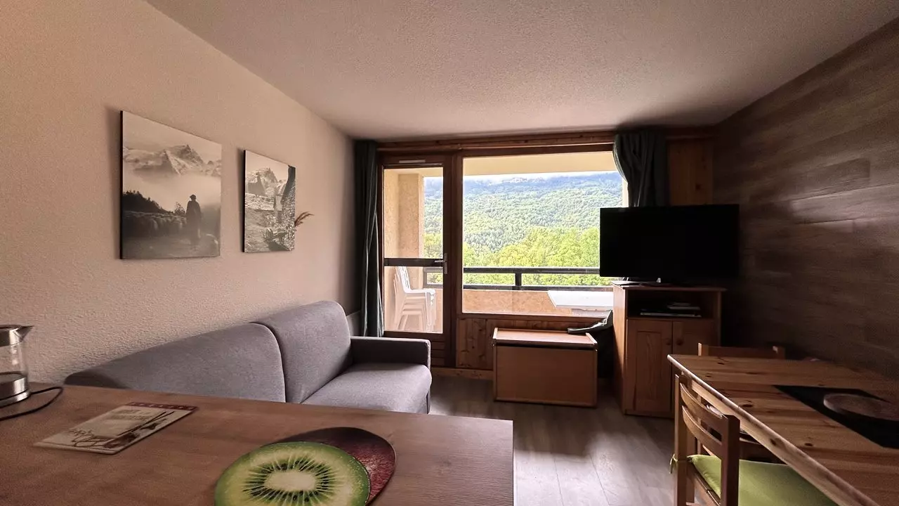 Mountain apartment, 4 adults and 2 children. It consists of an entrance with a large closet, a bedroom with a double bed (140x200), a mountain corner with a bunk bed separated by a curtain (90x200), a bathroom with bathtub, a separate toilet. The living room with a two-seater sofa bed (140x200), the kitchen is equipped with a refrigerator, microwave, ceramic hob, washing machine... A pleasant south-facing balcony, to enjoy a meal or a relaxing moment in the sun. A ski locker. Parking is located opposite the residence.