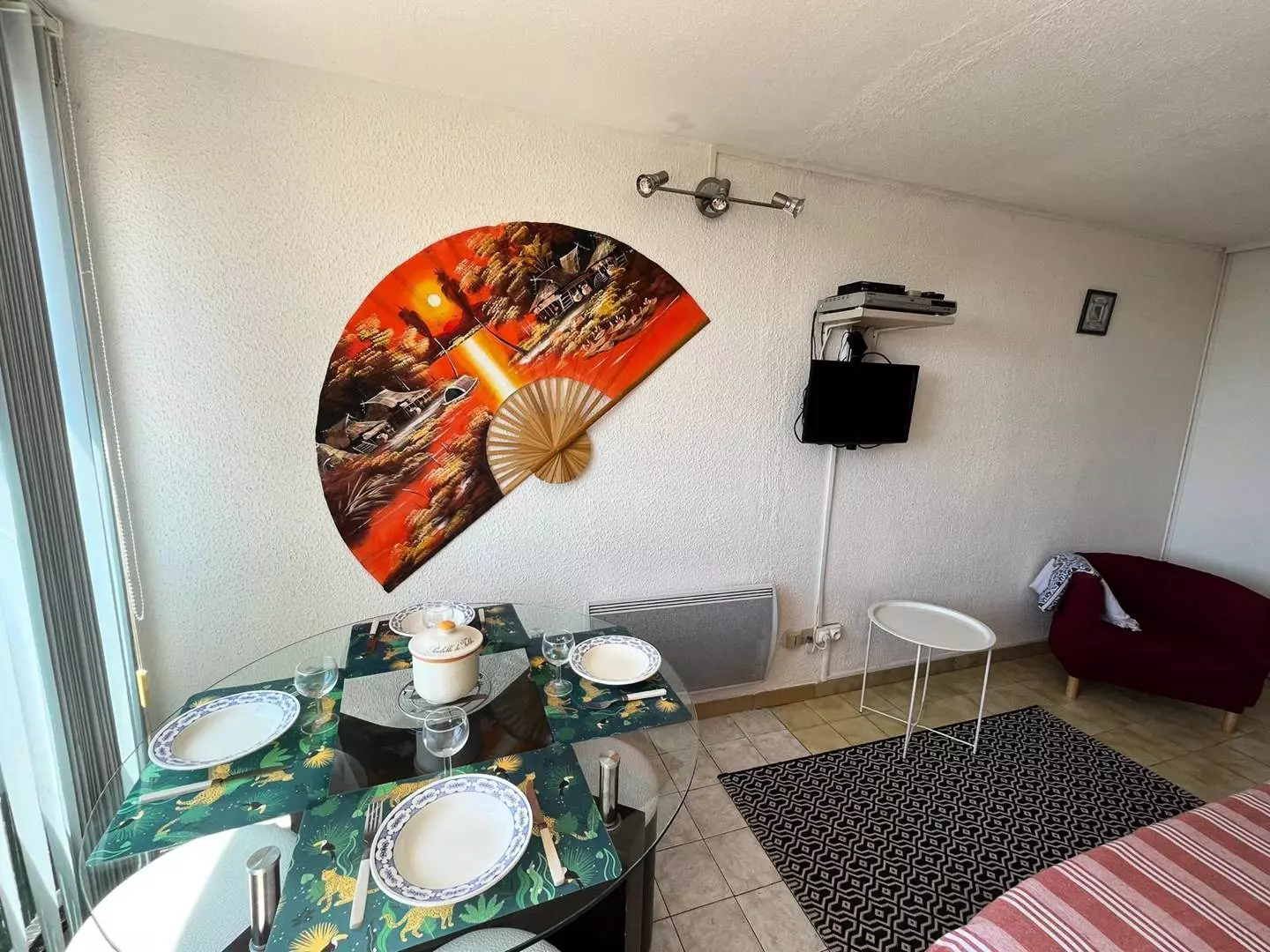 Located on the second floor of Building B, it comprises an entrance hall leading to a kitchen equipped with a hob, a refrigerator, a microwave, and a dining area. A living room with a sofa bed and a television, and a bedroom with a 140cm double bed and storage.