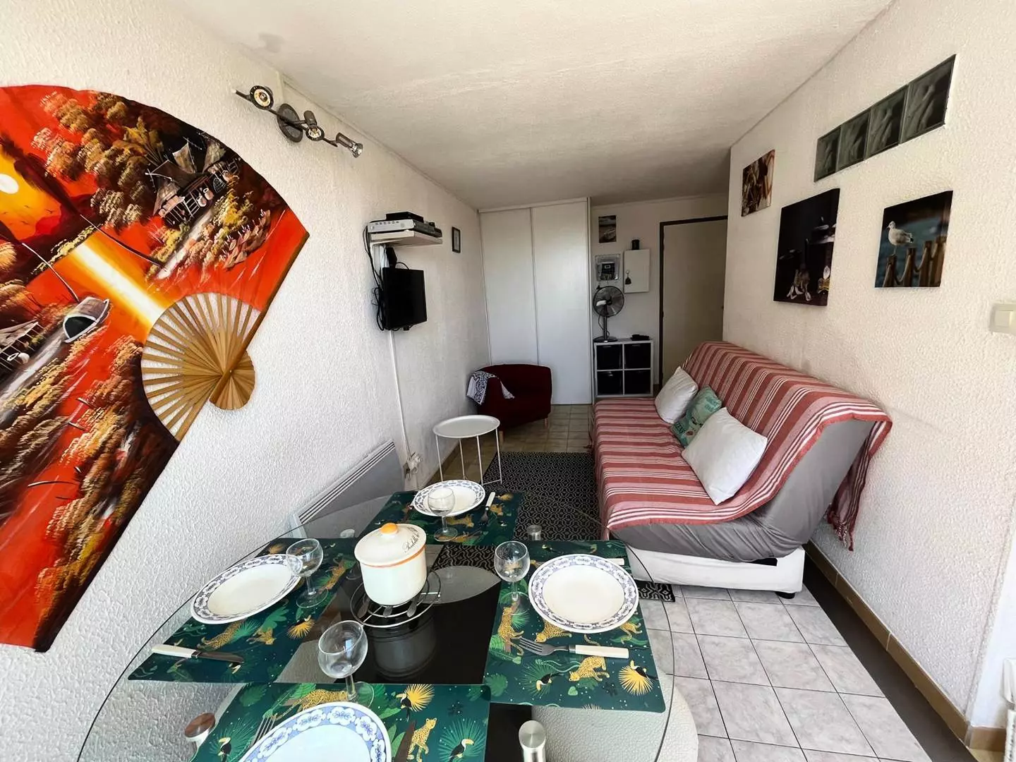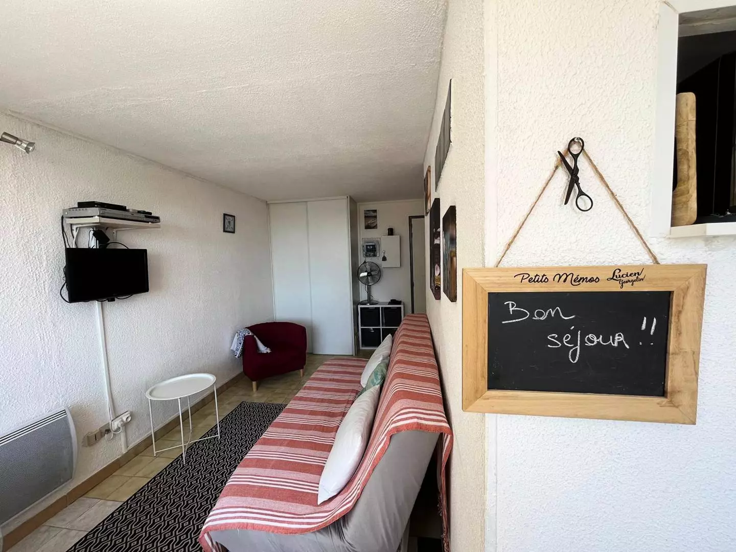 Furnished apartment for 4 people. Located in the Santa Marina residence, 900 m from the beach and shops. Tennis court, seasonal shared pool, and private parking are available.