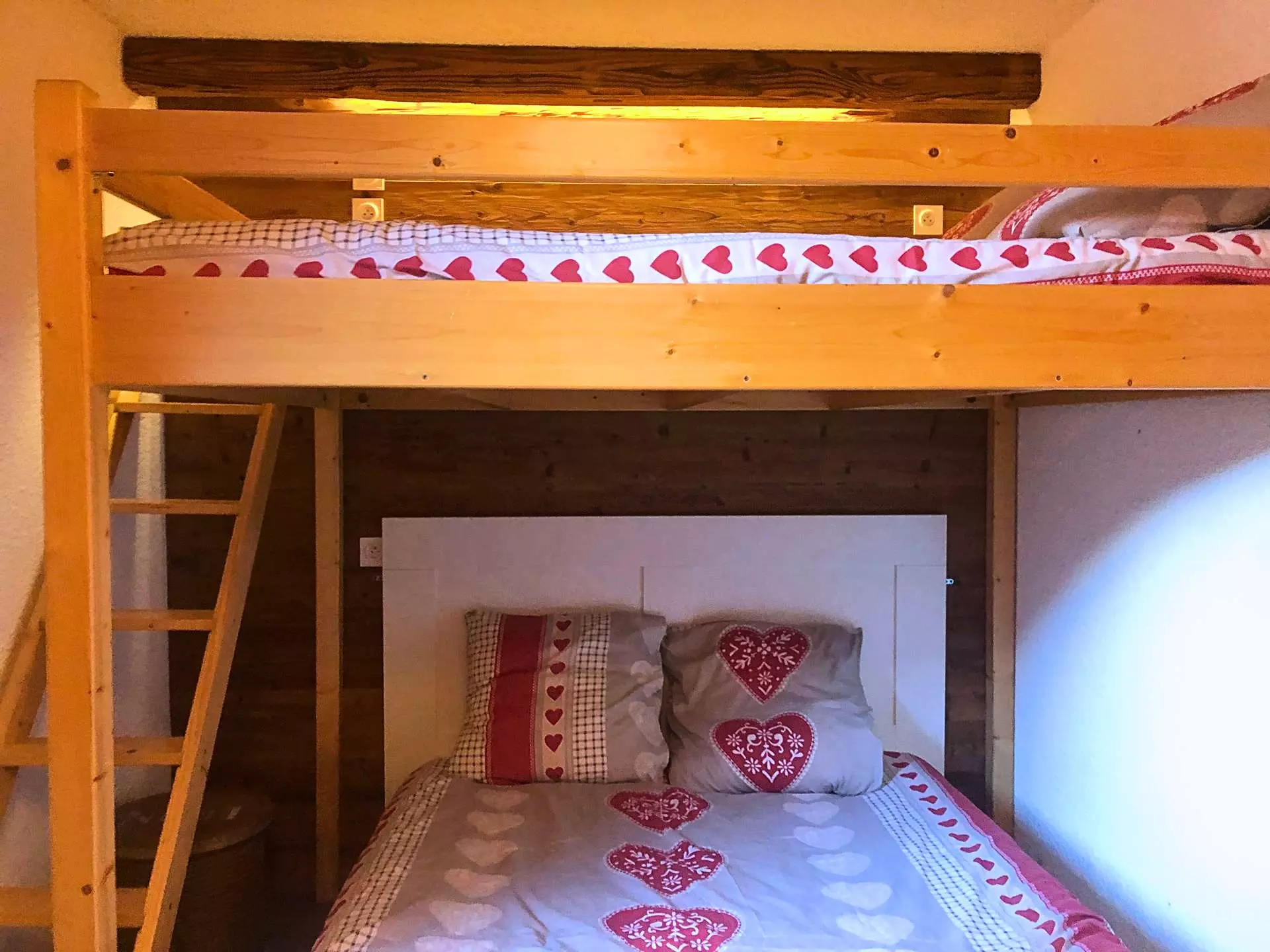 The living room is furnished with a sofa bed and the bedroom with two double bunk beds. Duvets are provided for all beds.
