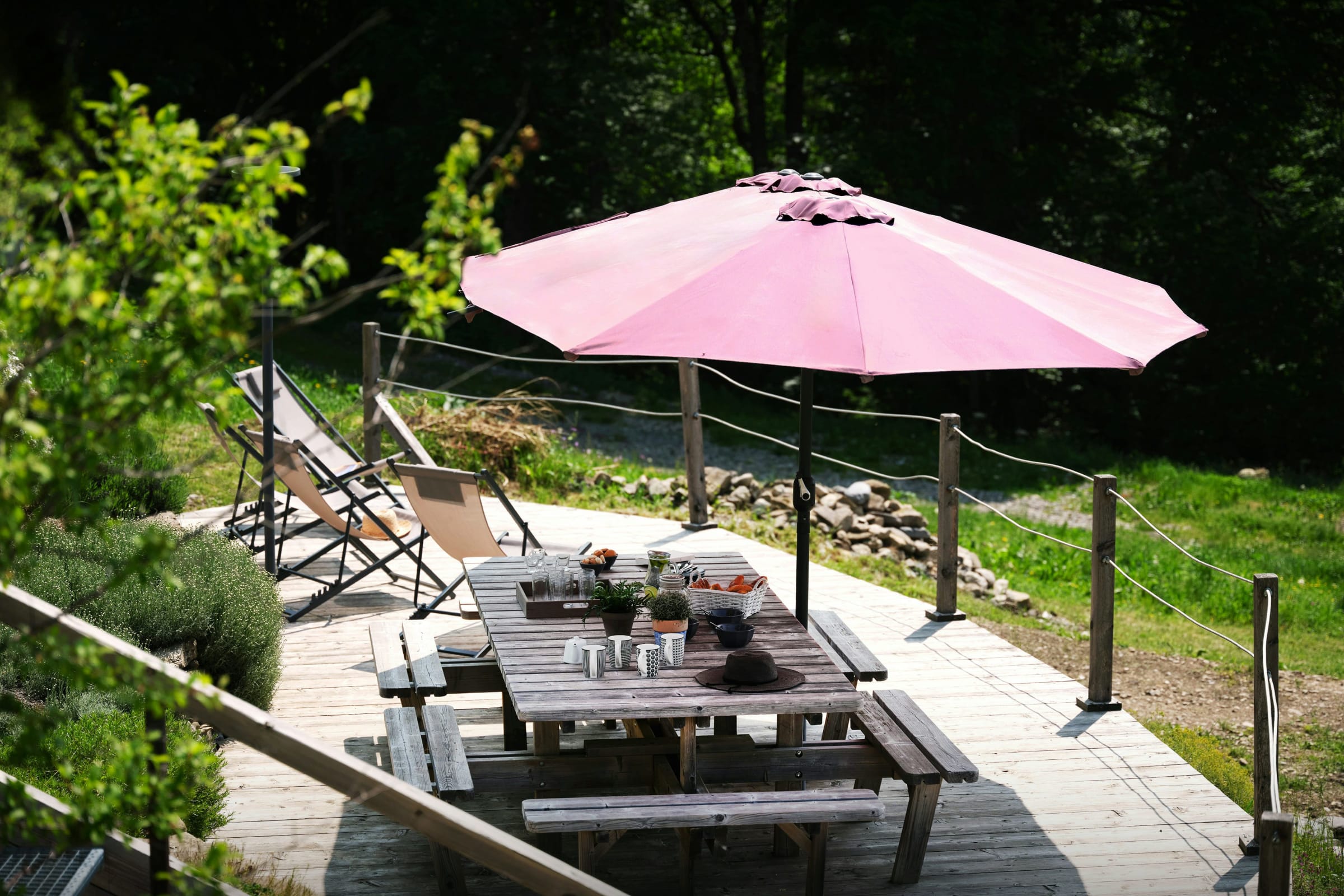 The heated steps leading up to the entrance of Chalet Marijulo mean you’ll have no problems with snow, even in the depths of winter. They border a terrace with a dining table and several sunbeds, as well as a pétanque area.