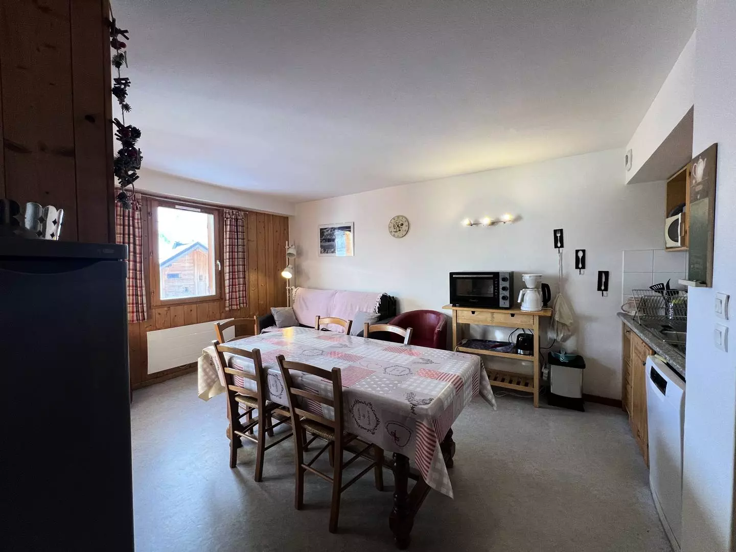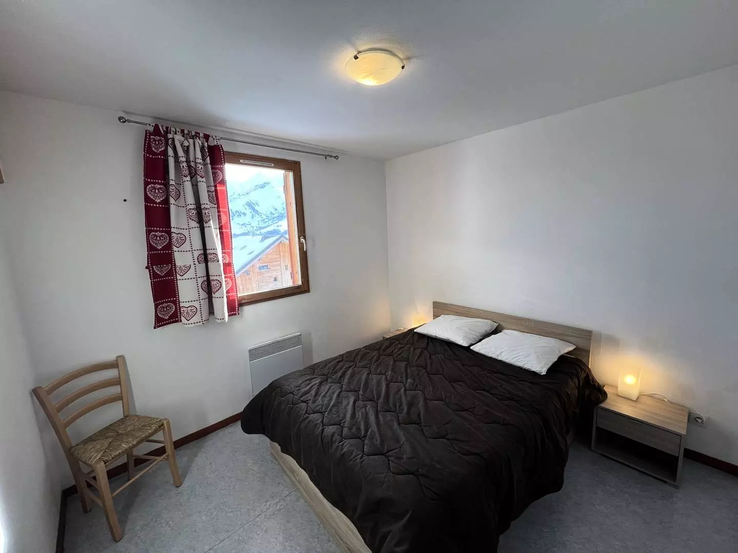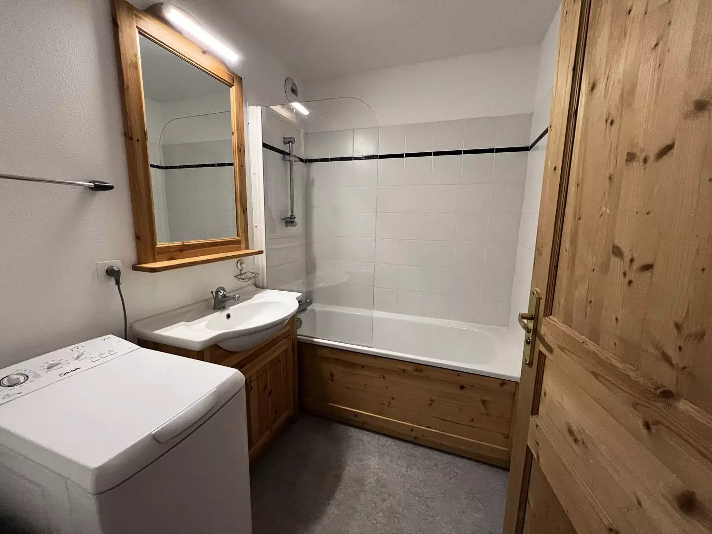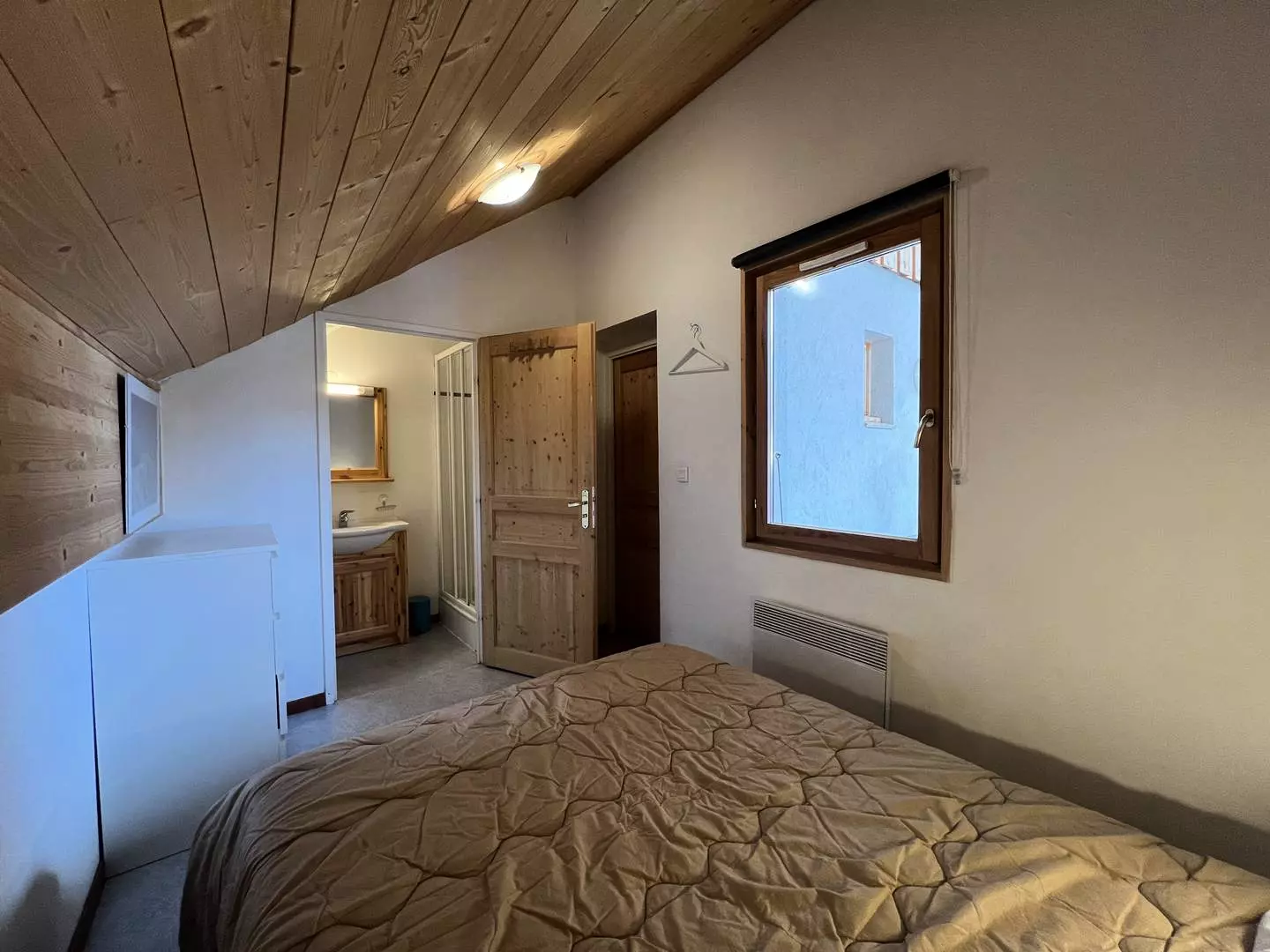 * on the lower level: a large entrance hall, a bedroom with a double bed and a shower room, a bathroom with washing machine, a separate toilet, a second bedroom with a double bed, a living room with kitchenette with a sofa bed and a staircase leading to the attic, a south-facing terrace of 11.62m2 with a view of the Aiguilles d'Arves. End-of-stay cleaning included for the winter season 2024-2025