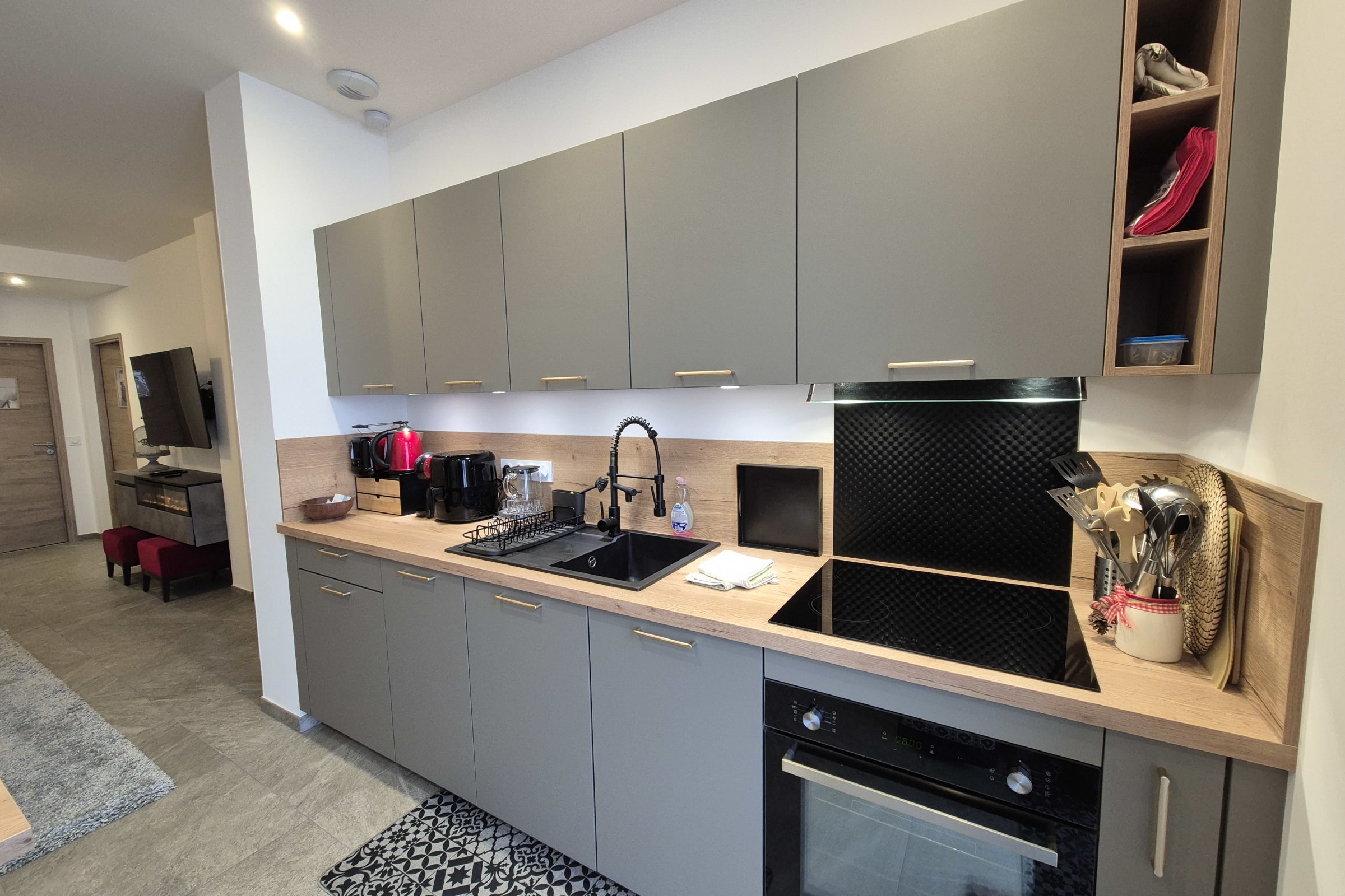 Cook like at home with a modern kitchen featuring an oven, large fridge with freezer, dishwasher, coffee machine, raclette & fondue sets, toaster, and kettle.