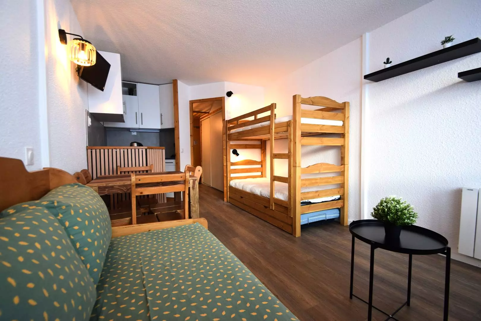 Divisible studio 26m2, 3/4 people, south exposure, balcony, view of the slopes, floor F, elevator arrow. American kitchen in the living room: 2 electric hotplates, refrigerator, microwave/grill oven, electric coffee maker, dishwasher. Living room: dining area, 1 single sofa bed and 1 bunk bed 80x190cm (sleeping prohibited for children under 6 years old). Television. Part divisible by an "accordion" wall: 2 trundle beds 80x190cm. Bedding: 4 single duvets. Bathroom: bathtub, separate WC. Floors: living room: carpet, other rooms: PVC tiles - Studio at the foot of the slopes. Ski locker n° F12 under ESF part 2.