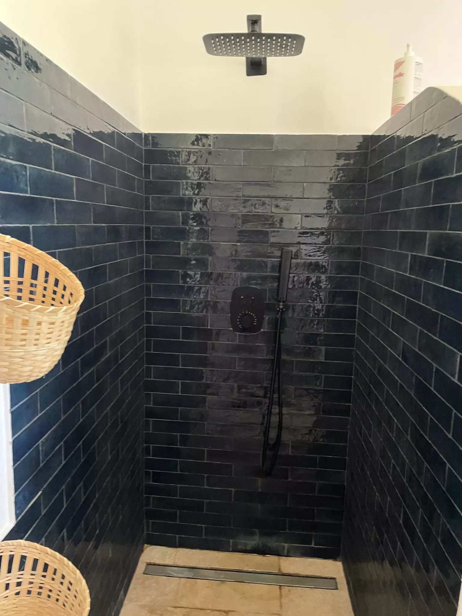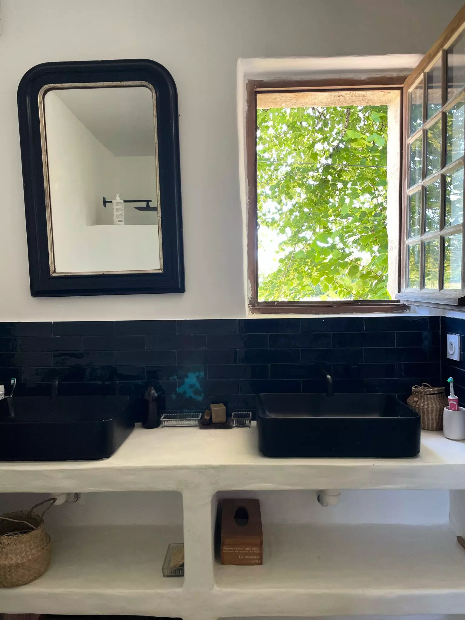 - A modern bathroom, with walk-in shower and double sink.
