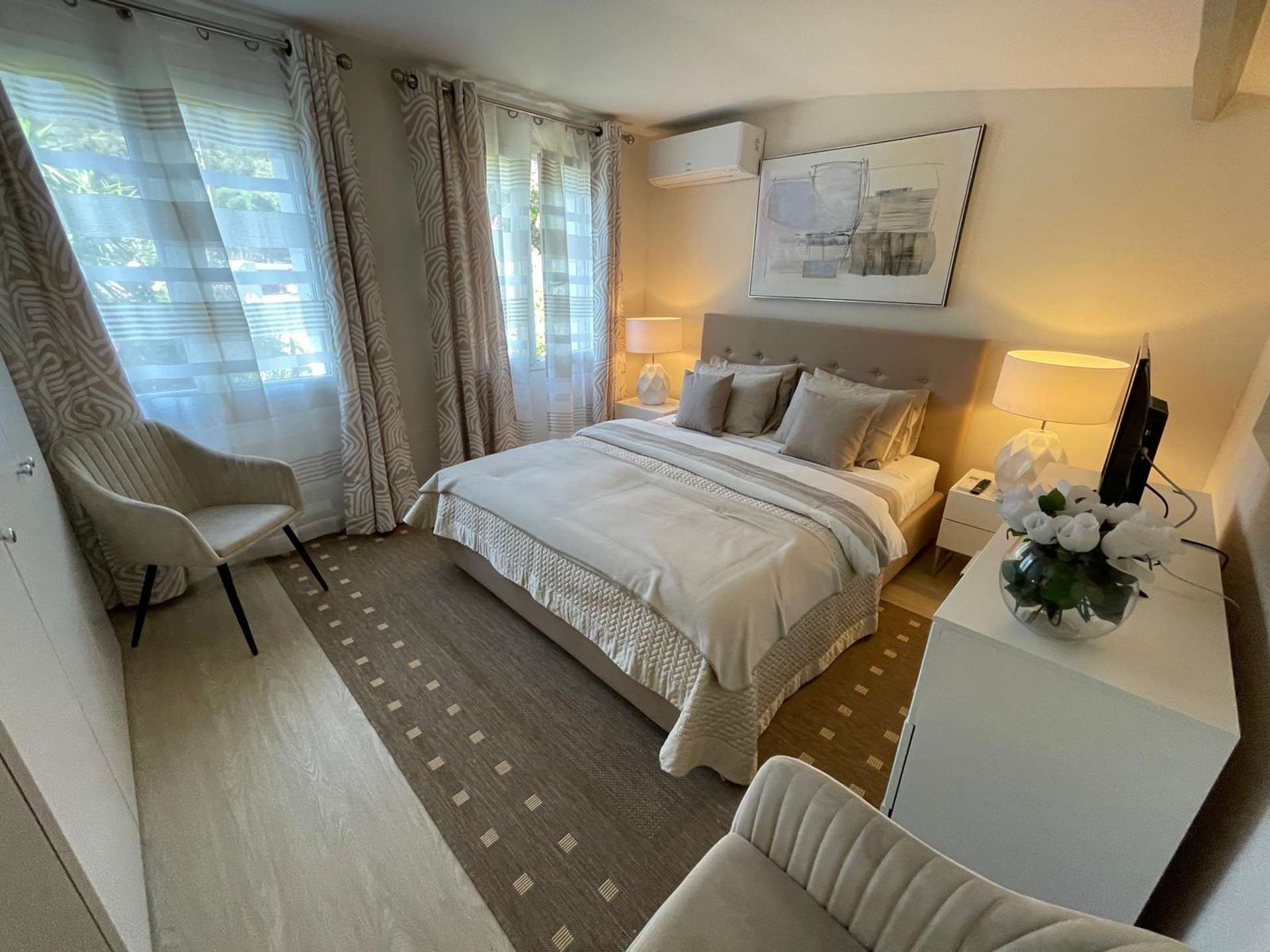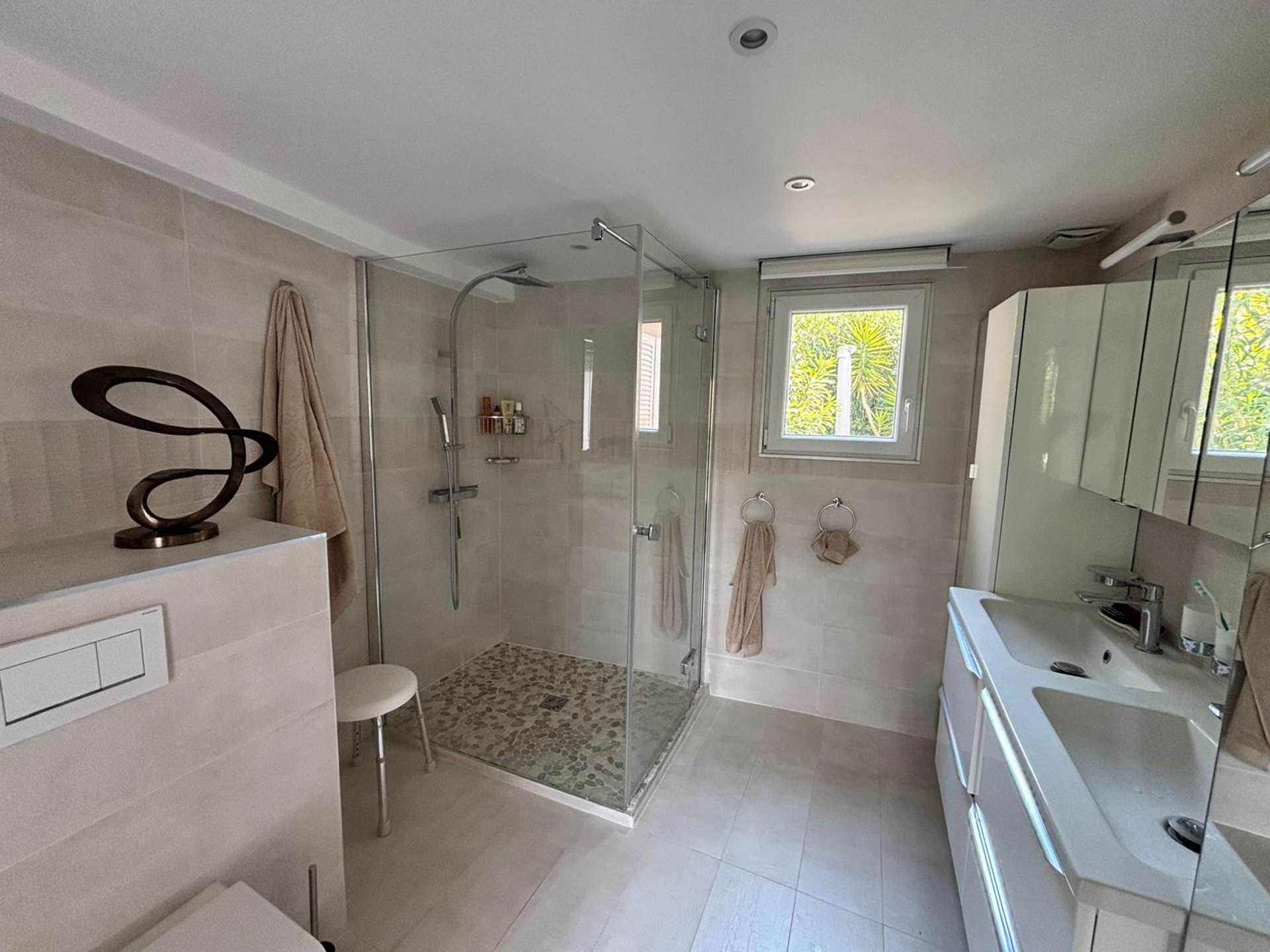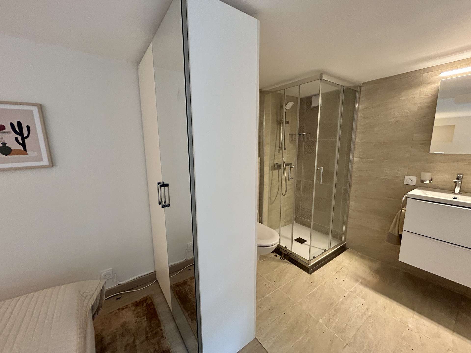On the lower level, you'll find a comfortable bedroom with a double bed, a modern shower room with toilet and direct access to the outside, offering an intimate and independent space. Another independent bedroom with double bed and en-suite shower room.
