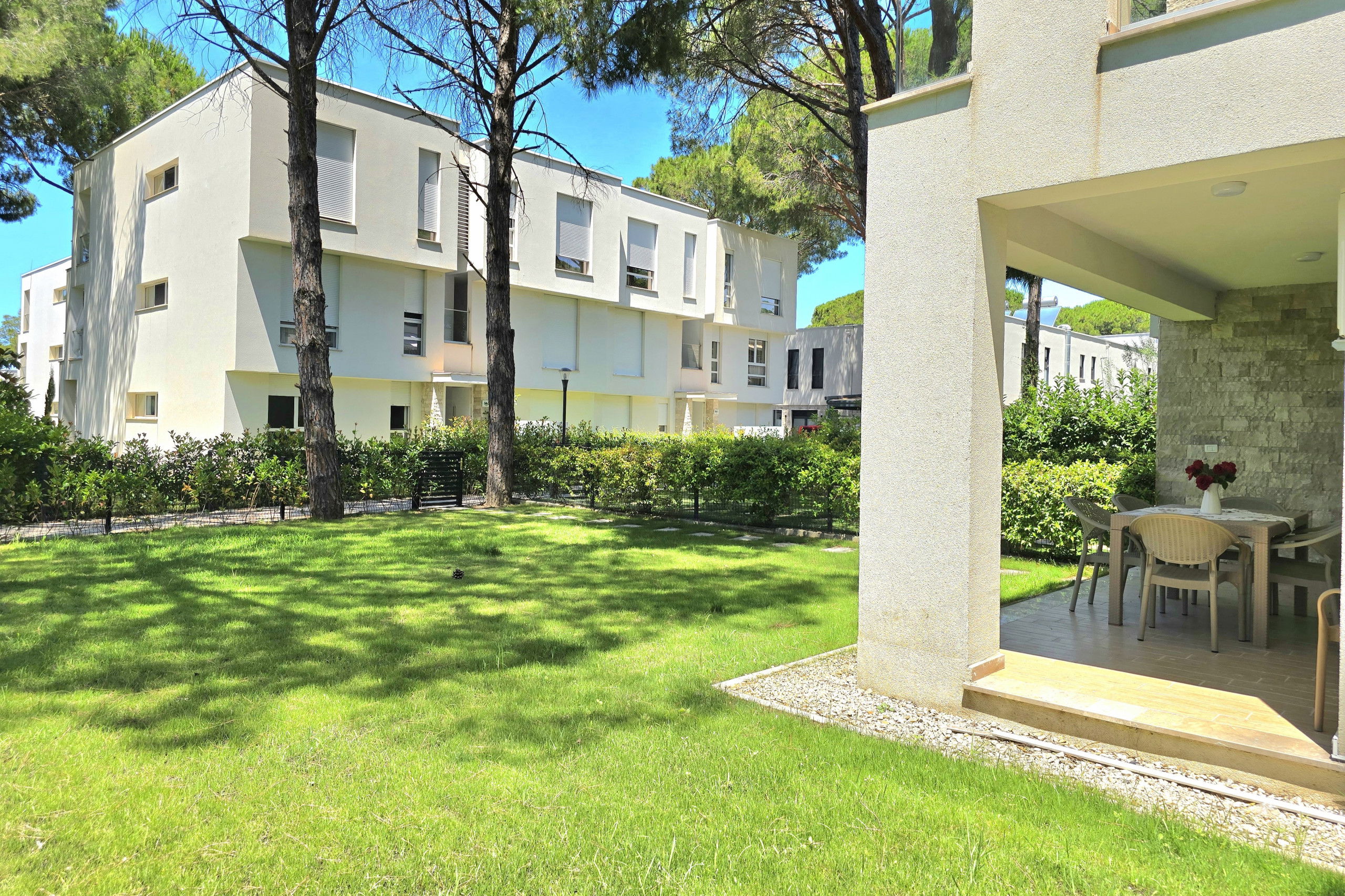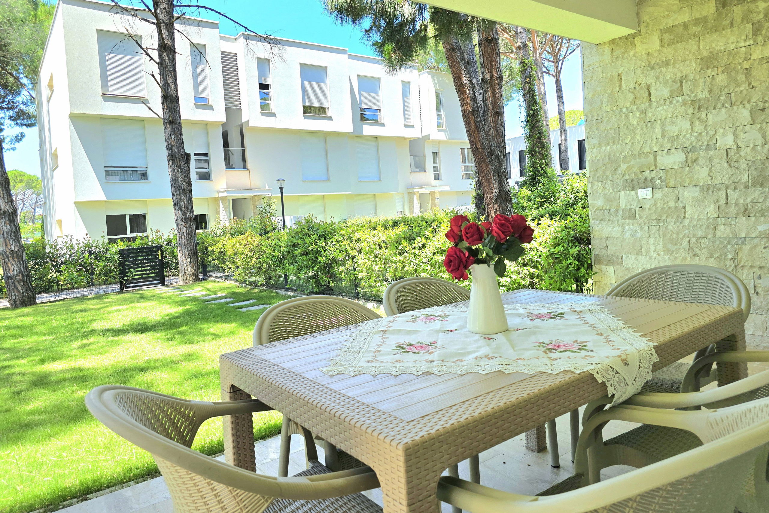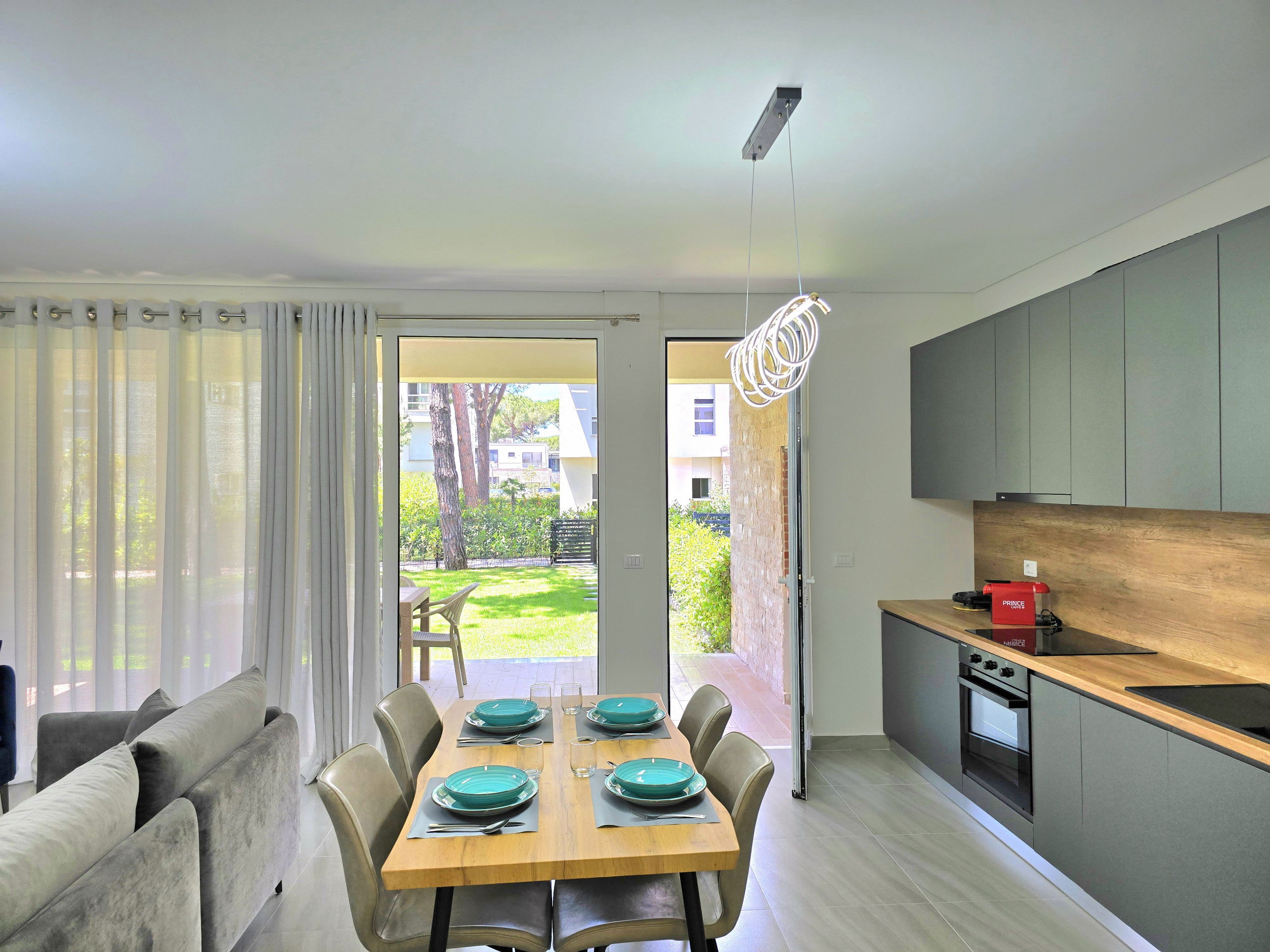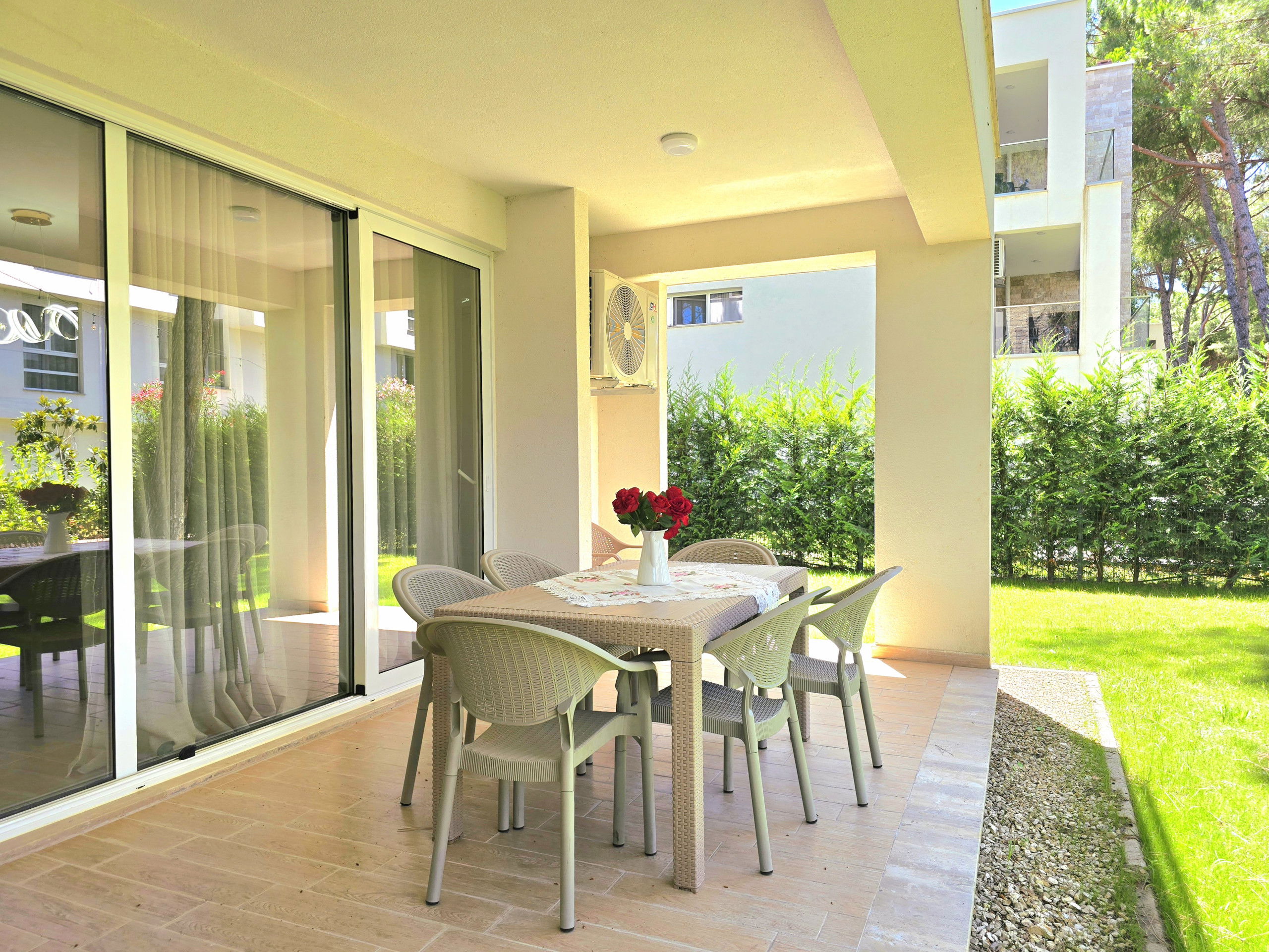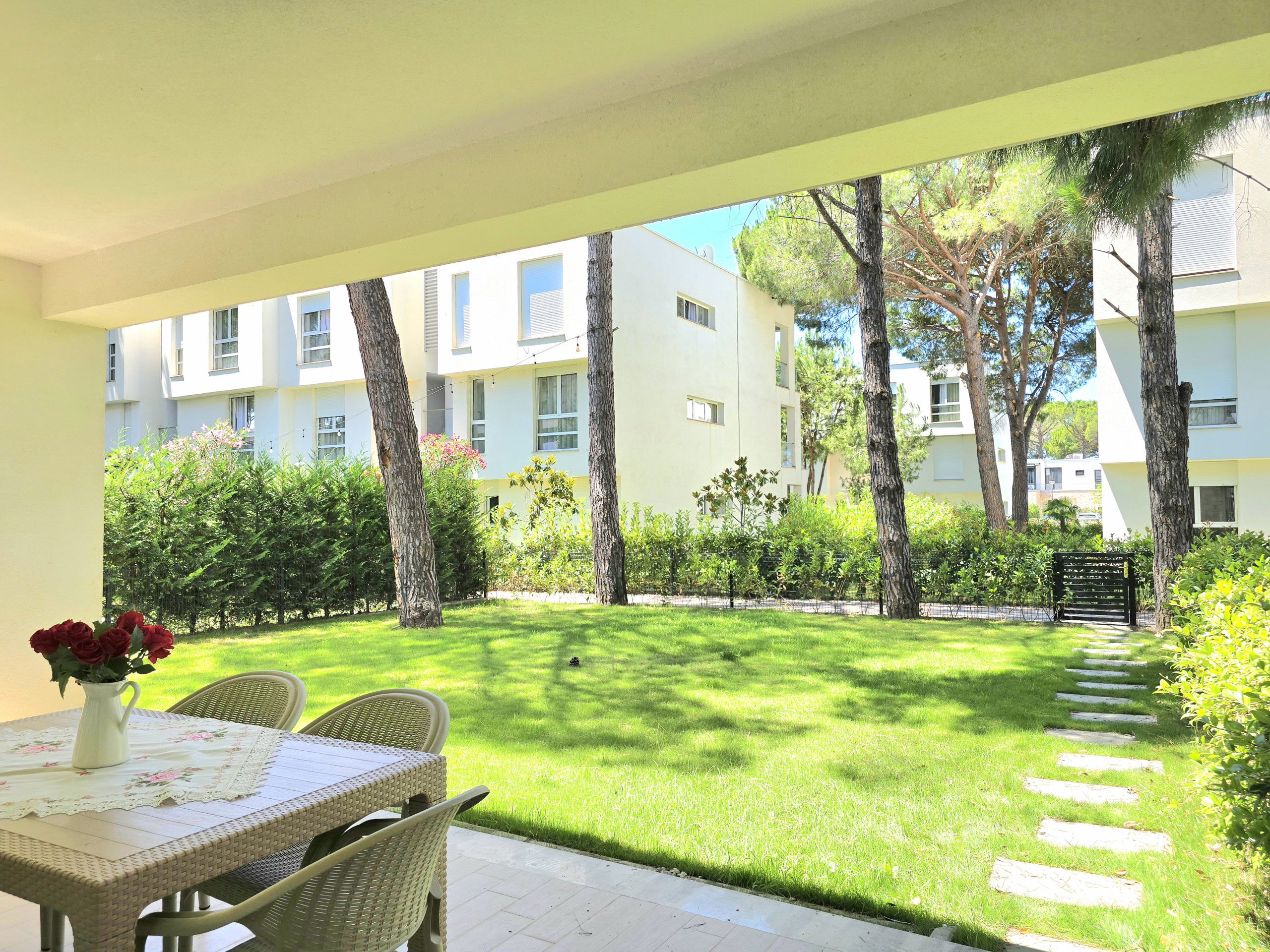 The apartment has a spacious private garden with a veranda which makes a charming outdoor dining room, as it is furnished with a dining table and chairs for meals al fresco. Large glass doors lead inside to the living room.