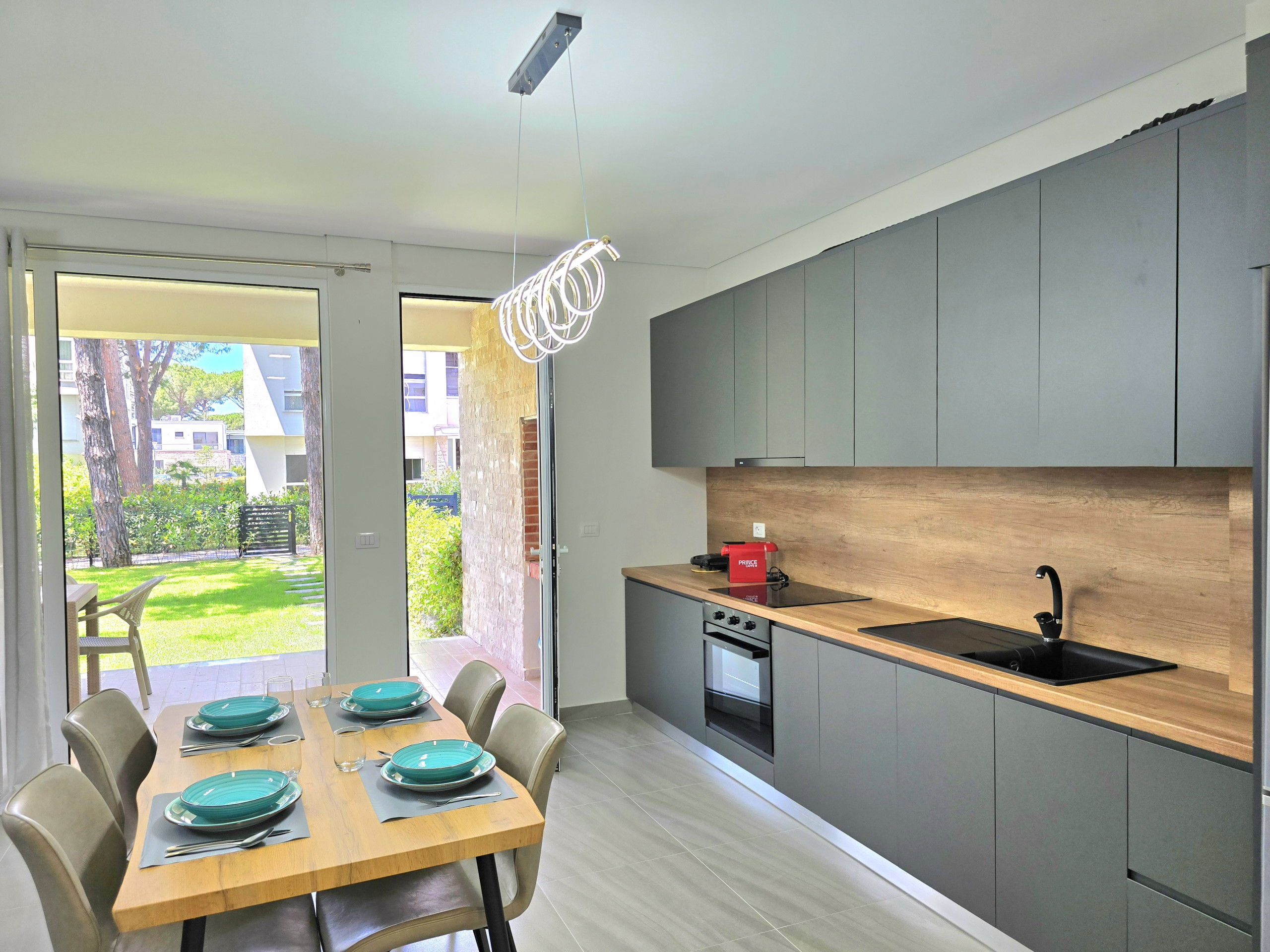 The interiors have been tastefully designed and decorated. The open-plan living area has a corner sofa, a flat-screen TV and another dining table. The beautifully fitted kitchen is well-equipped with a cooker hob, oven, dishwasher, fridge/freezer, a toaster and coffee machine.