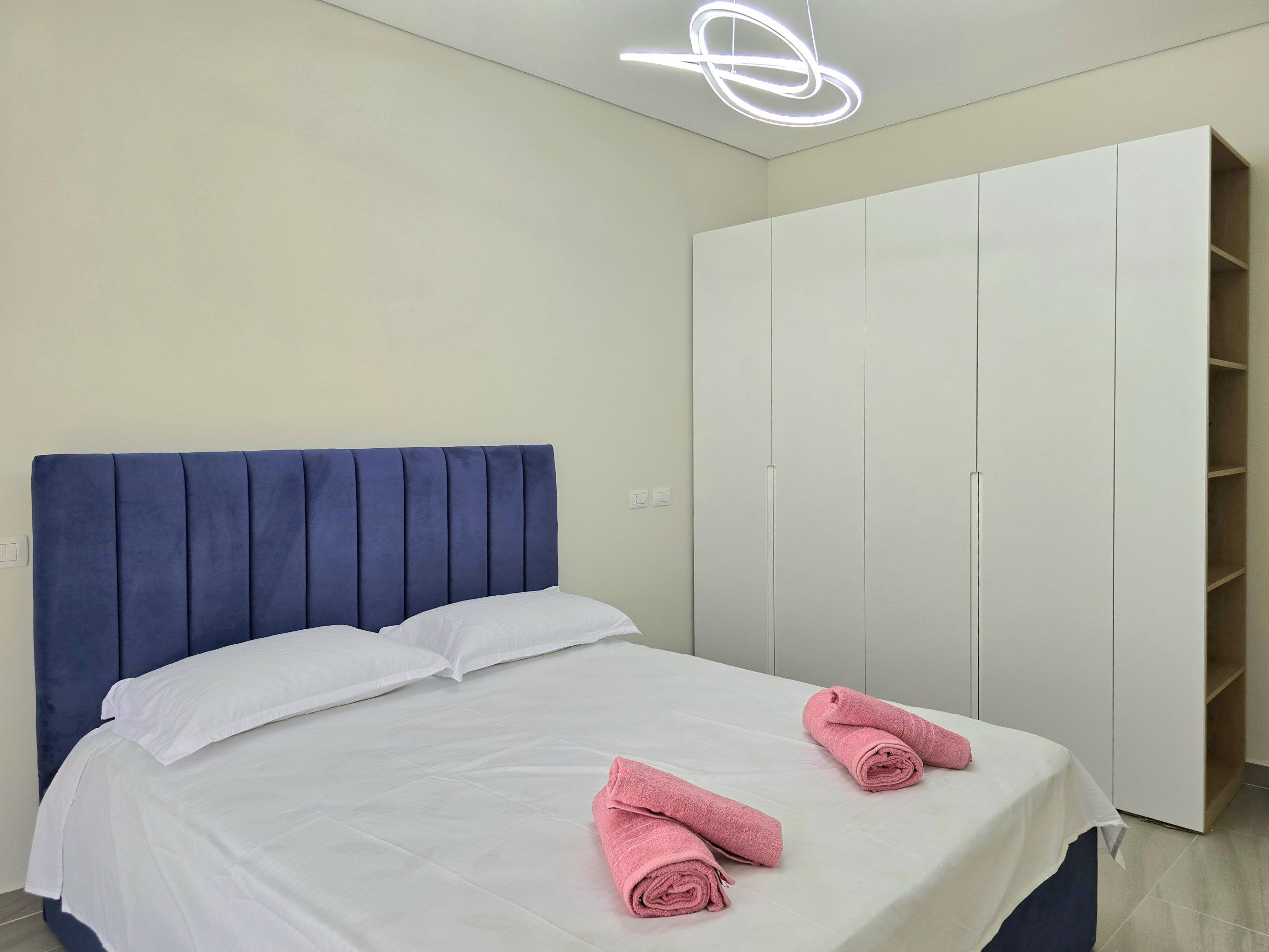 Bedroom 1: The light-filled master bedroom is furnished with a double bed and a large wardrobe.