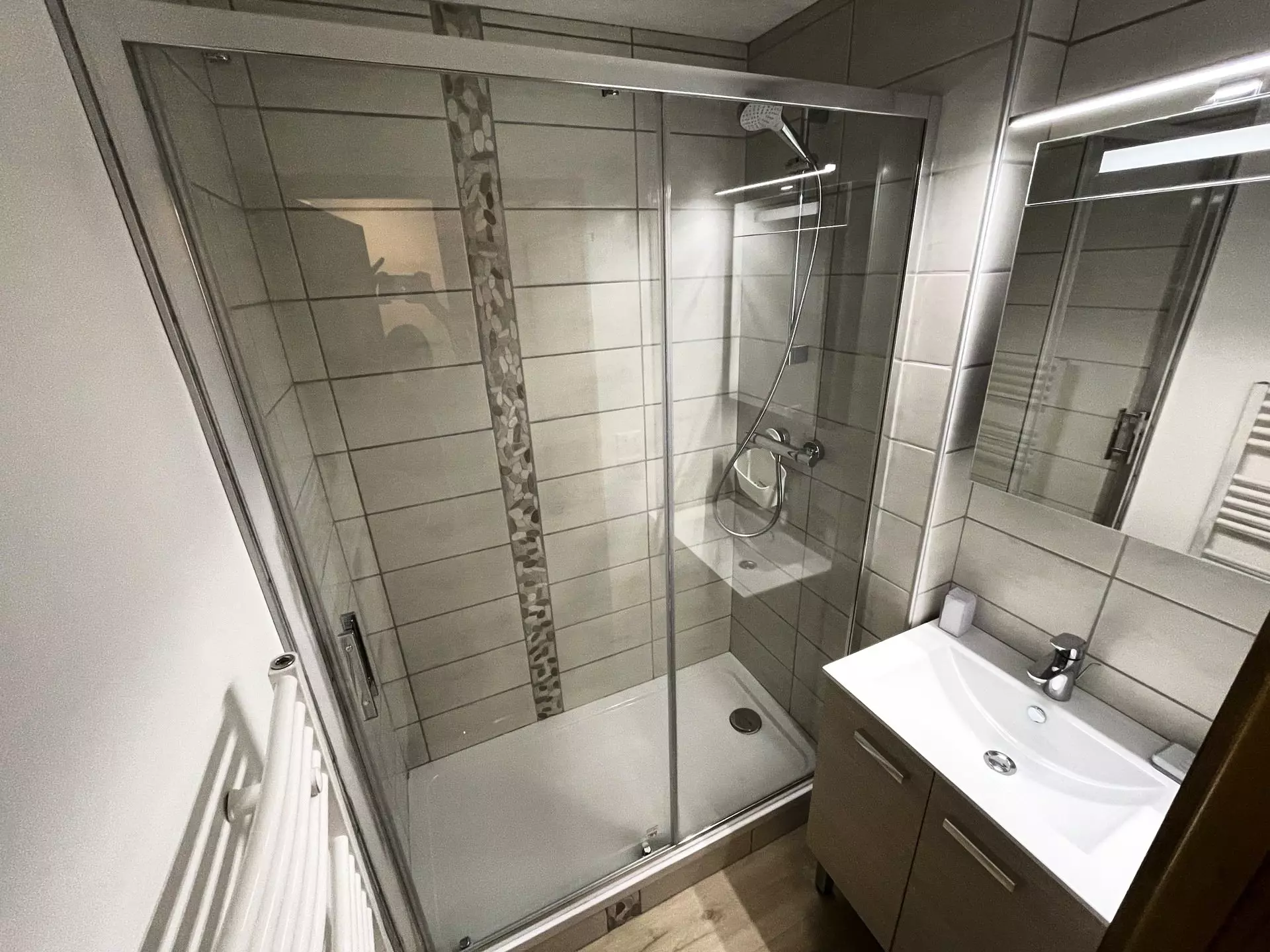 Bathroom: sink, shower, towel dryer, hair dryer