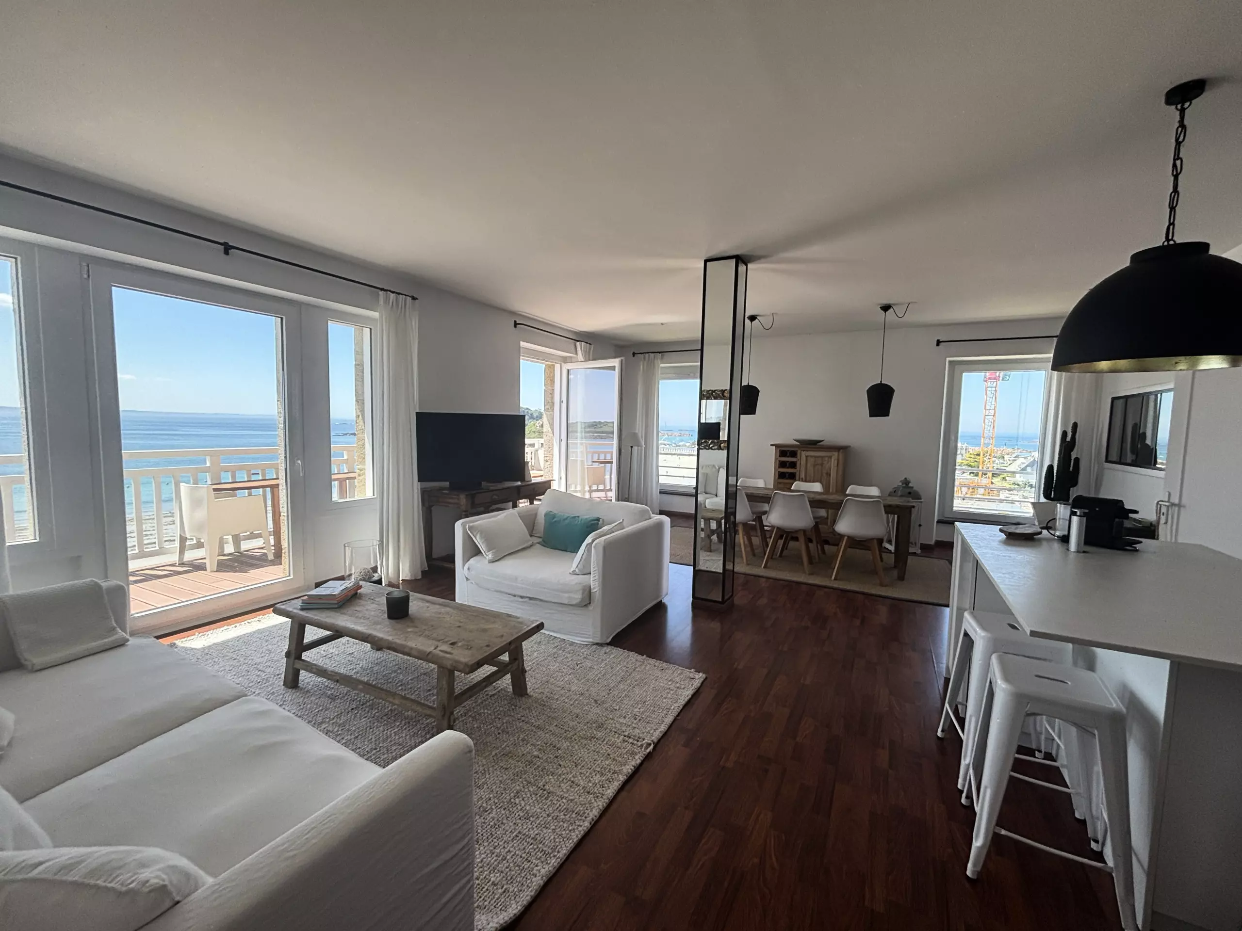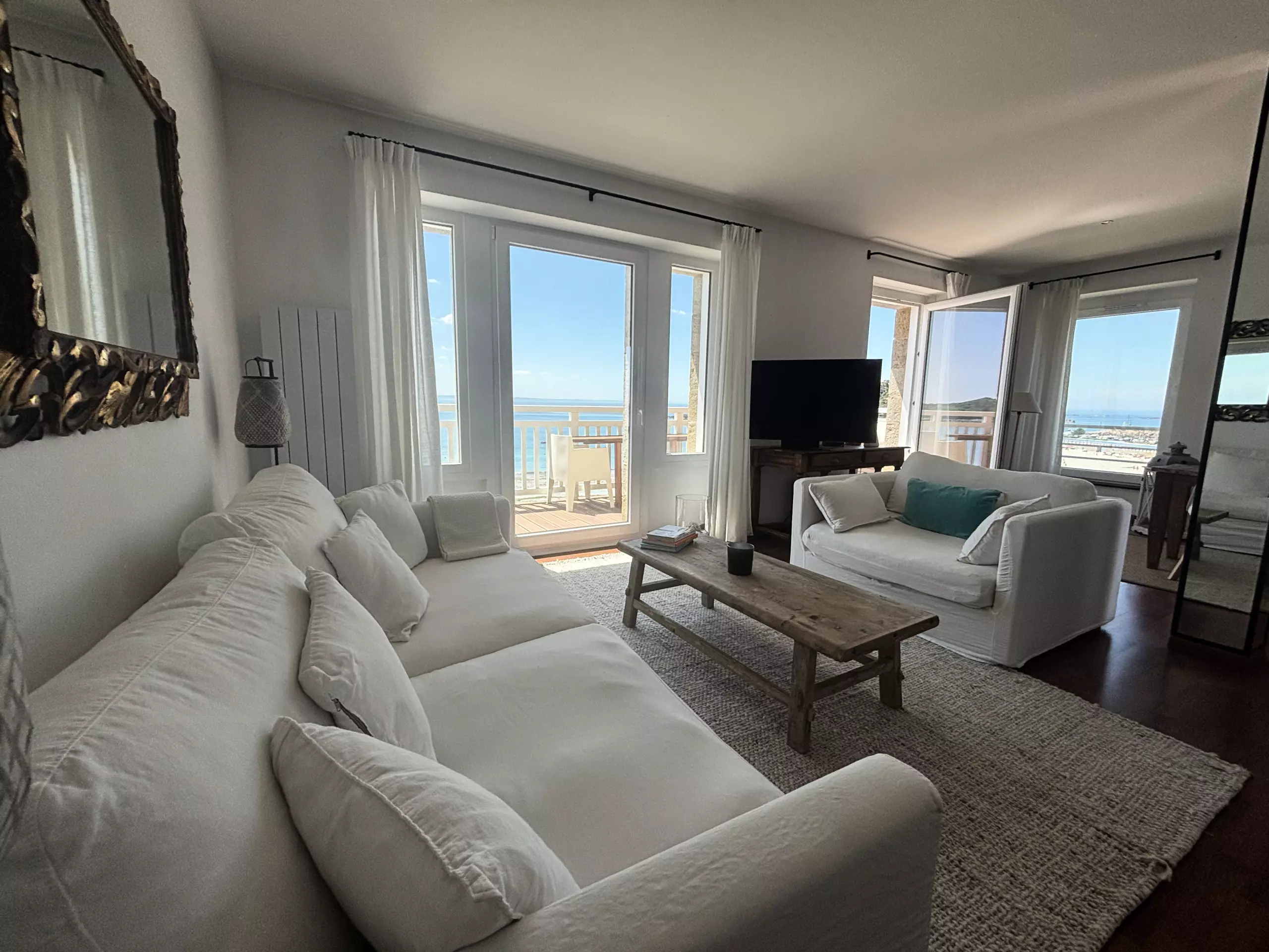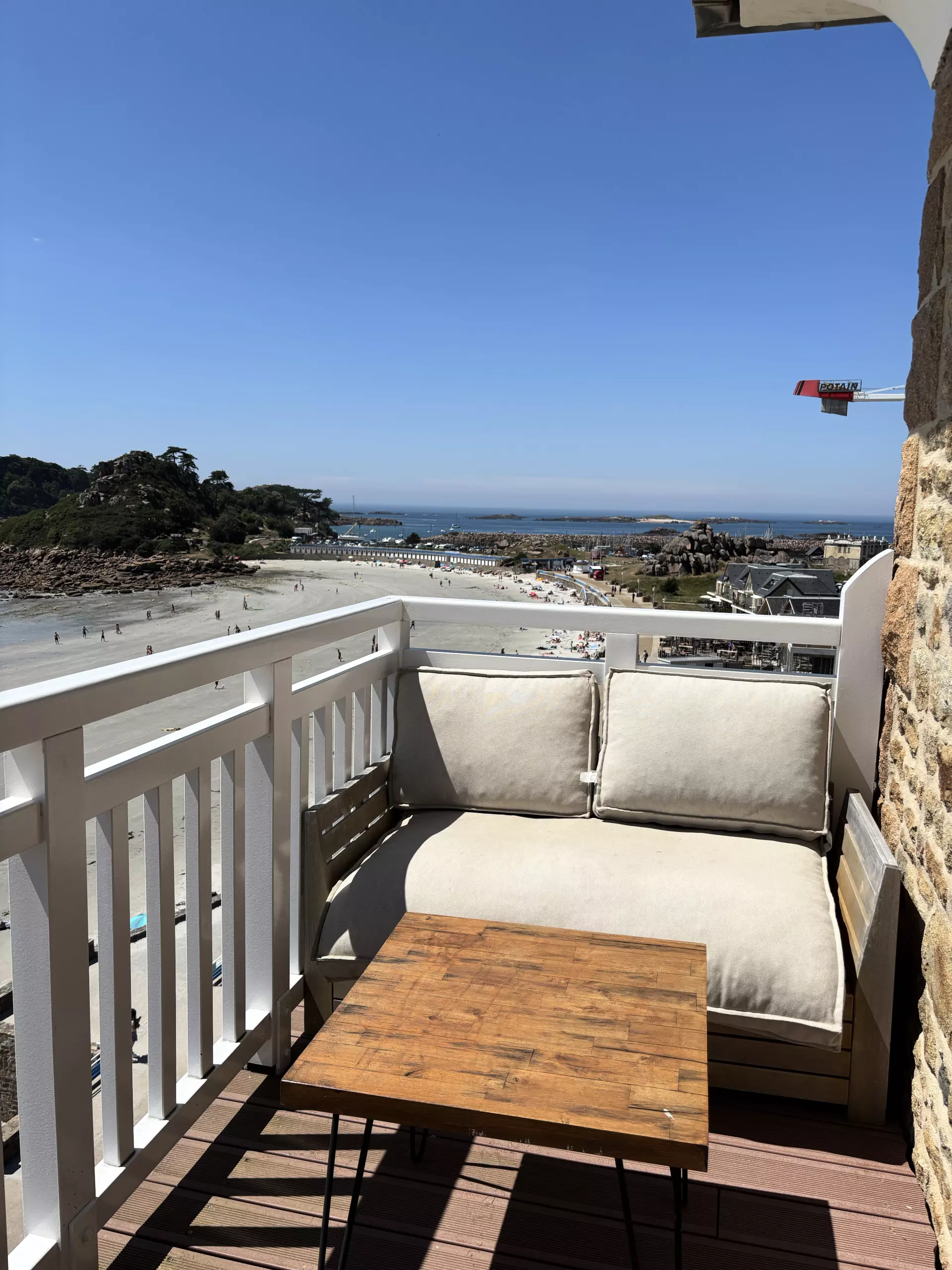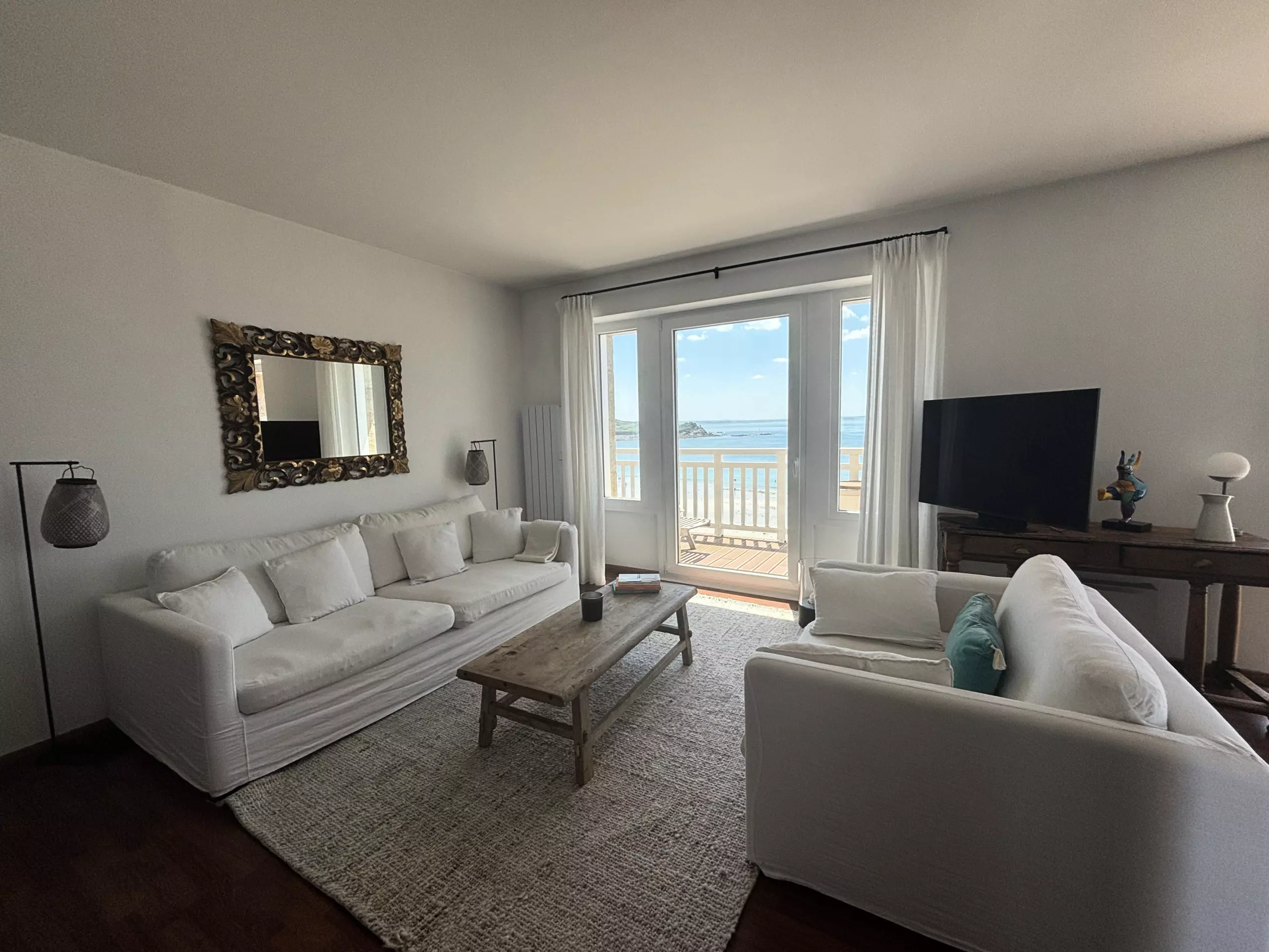 - Main room: a very bright living room with direct access to a private balcony overlooking Tresmeur beach.