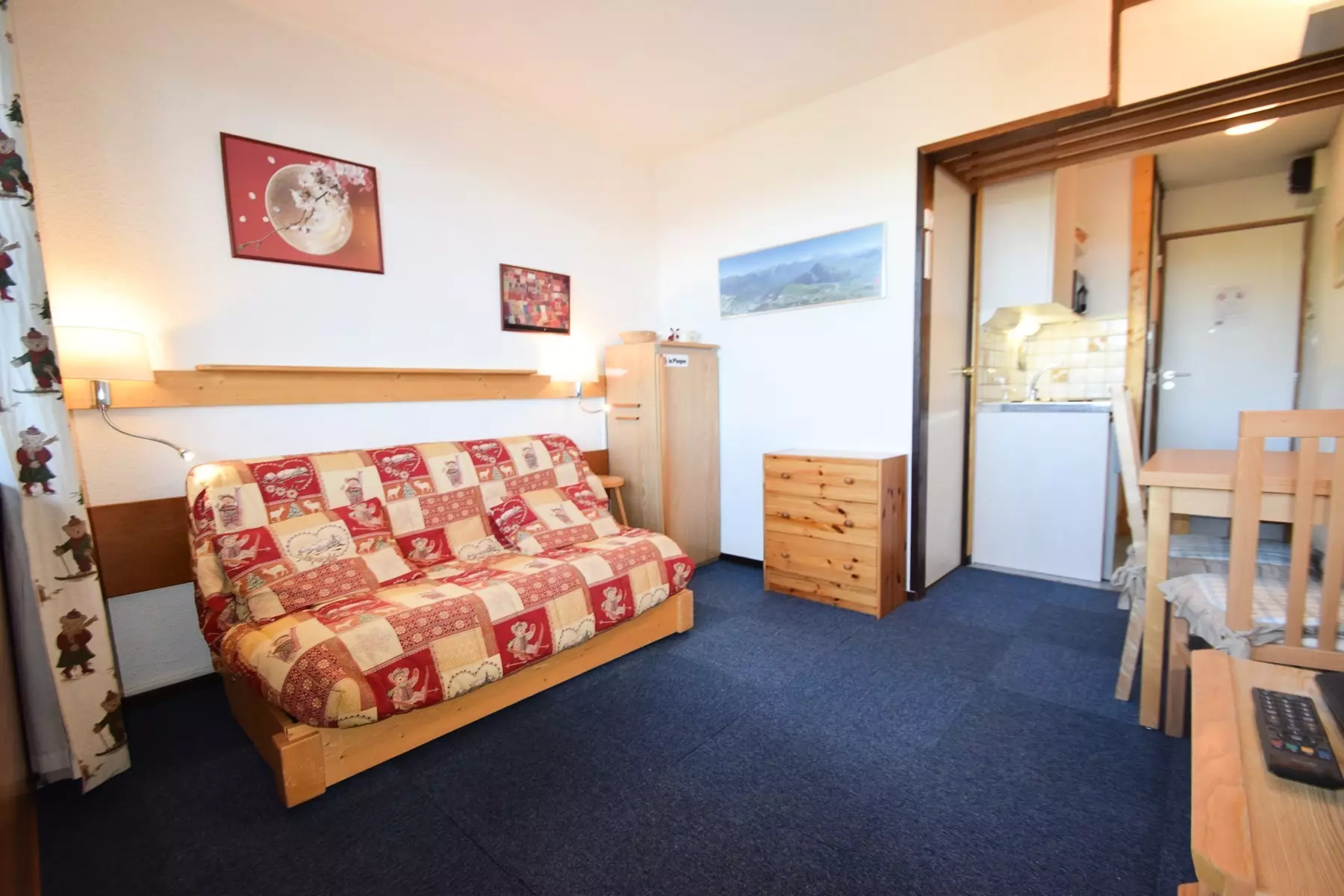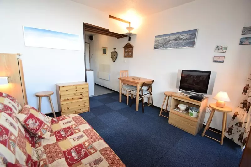 Studio for 2 people, 17m2, facing north with a view of the valley and Mont Blanc with balcony, on the 7th floor with elevator. Kitchen: in the entrance, 2 electric hotplates, microwave, refrigerator - Living room: 140cm sofa bed, TV, Bathroom: shower cubicle, WC included - Floors: carpet except bathroom and plastic kitchen - Bedding: 1 double duvet - PETS NOT ALLOWED and NON-SMOKING APPT - End of stay cleaning, sheets, towels and ski passes are optional. Very pleasant studio, very beautiful view of Mont Blanc.