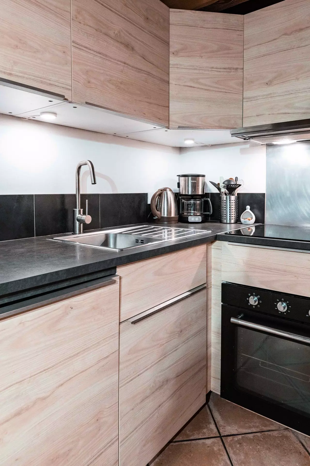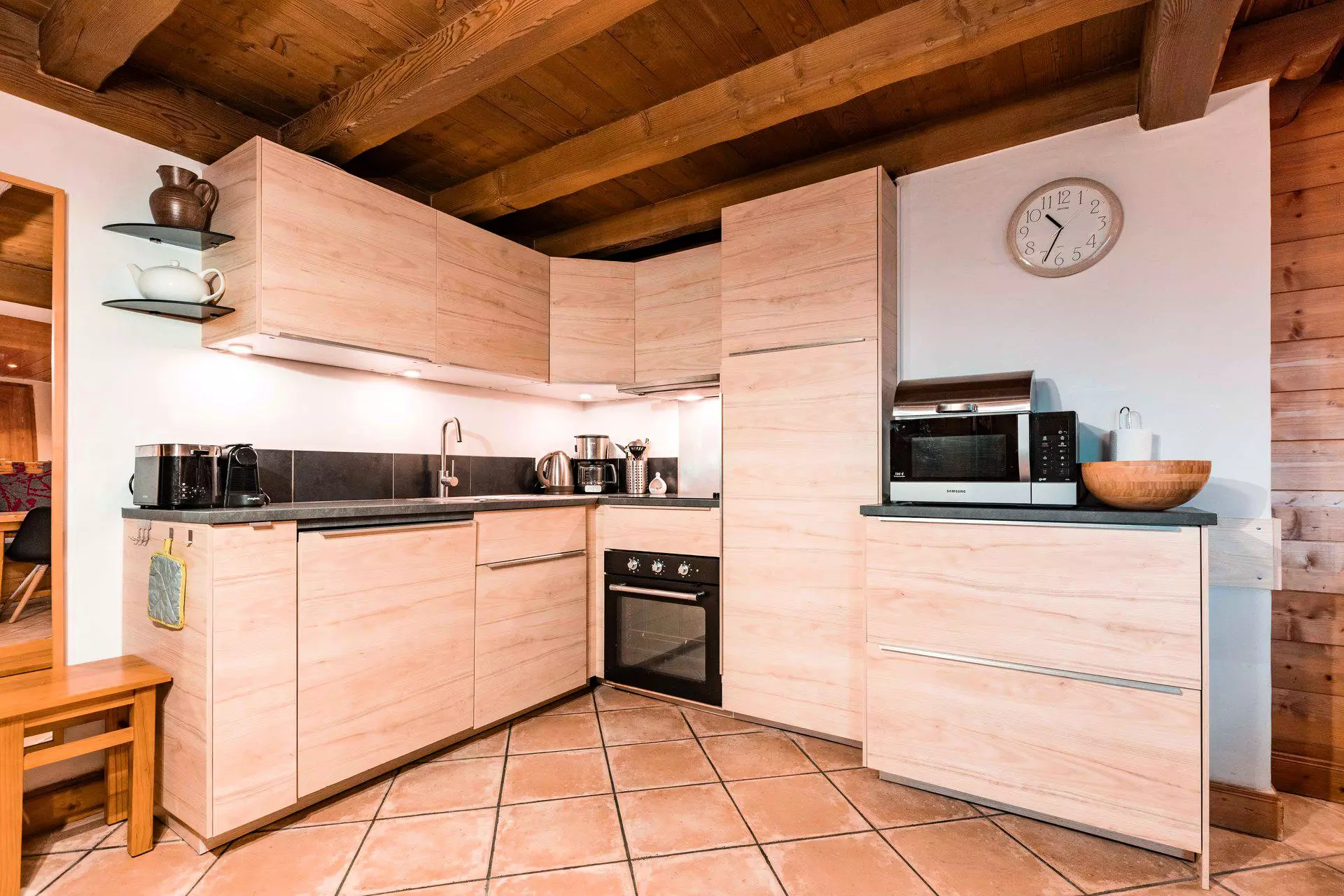 It is fully equipped with ceramic hobs, an oven, a microwave, a dishwasher, a refrigerator, a coffee maker, a kettle and a toaster.
