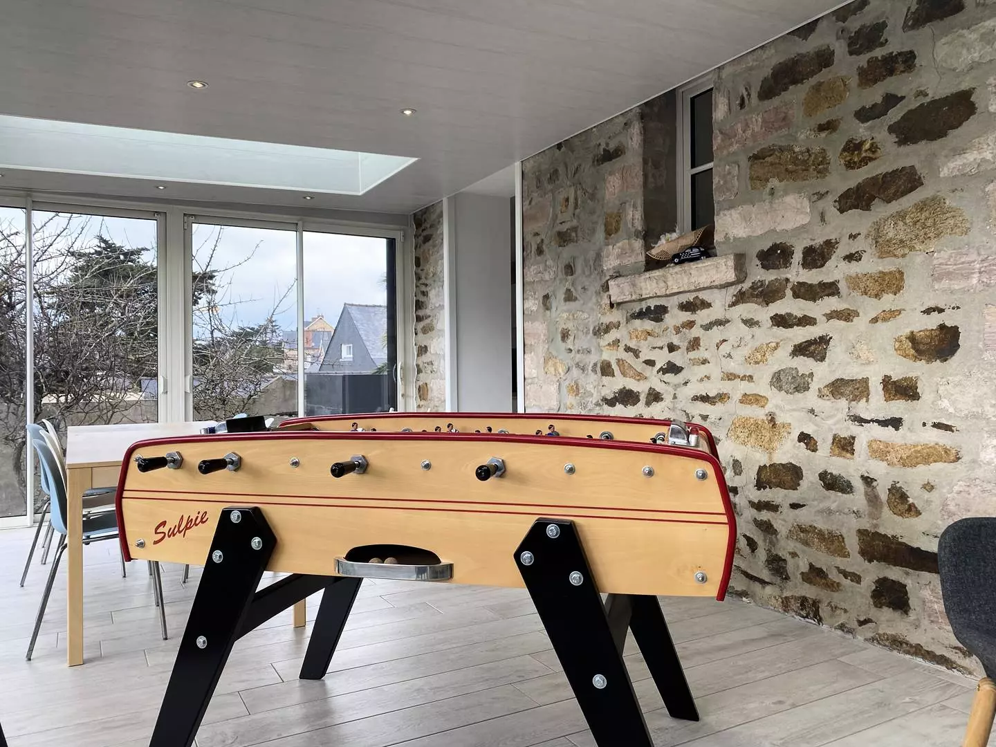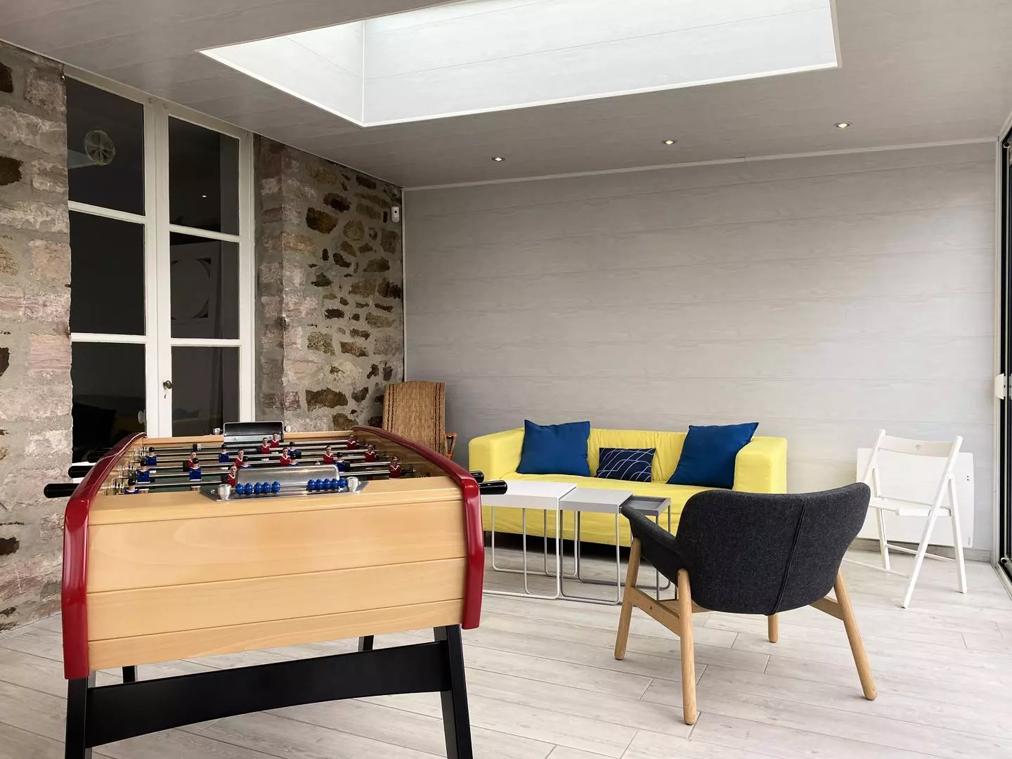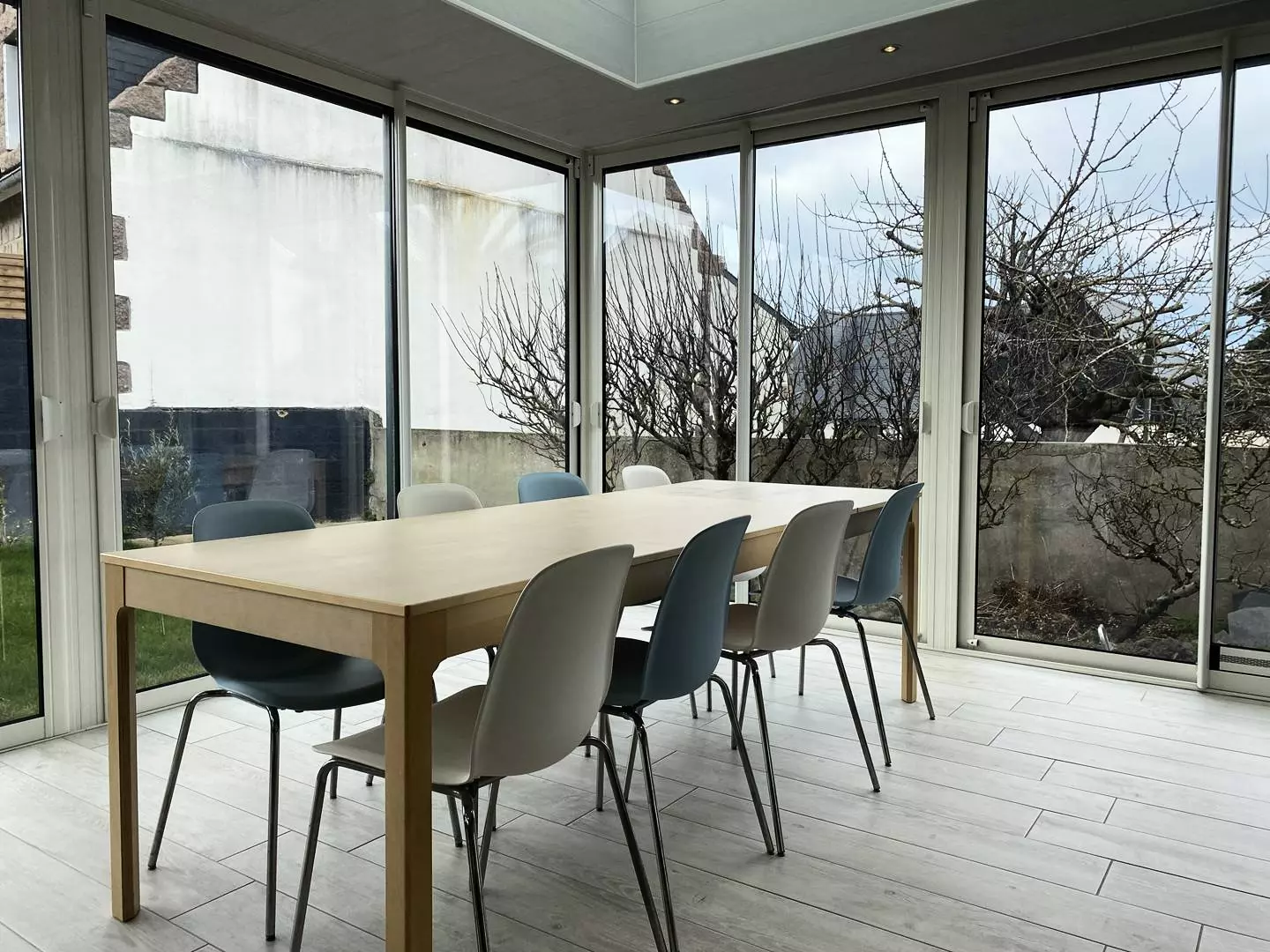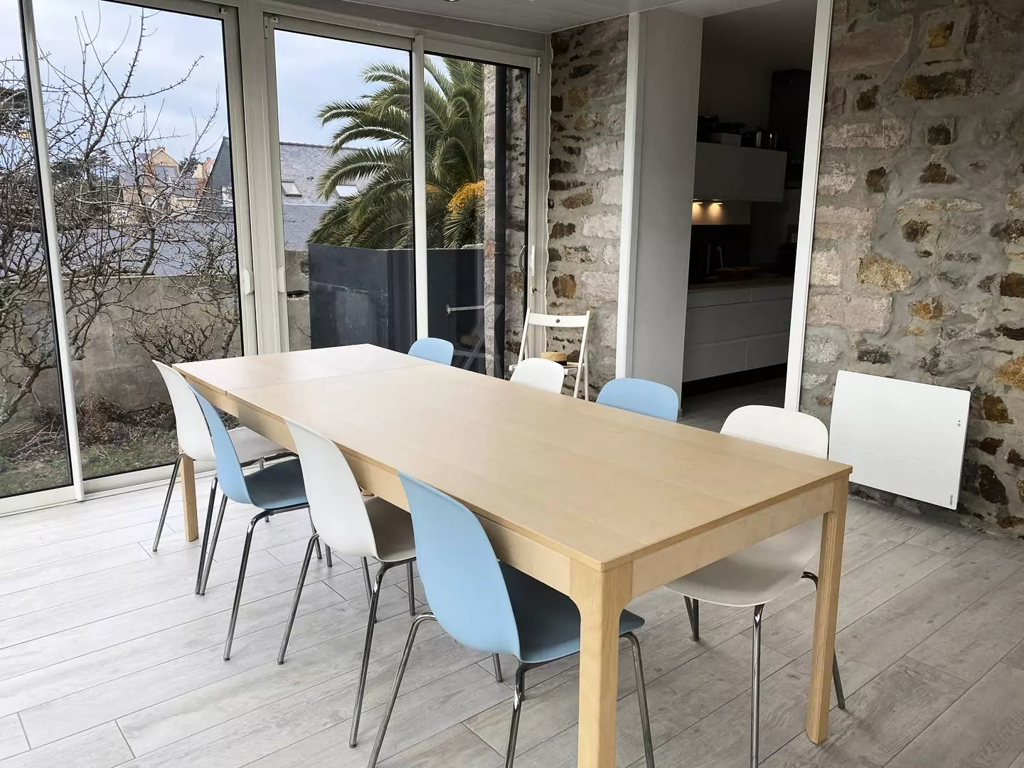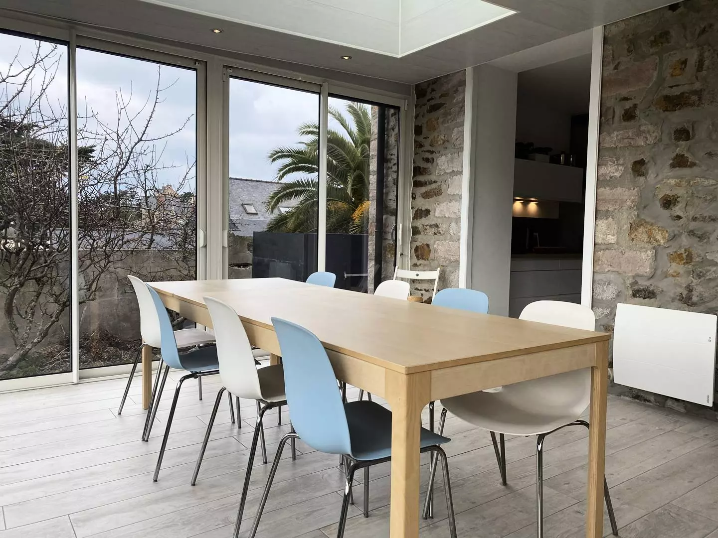 - A large living room with a dining area and a lounge area, with garden access,