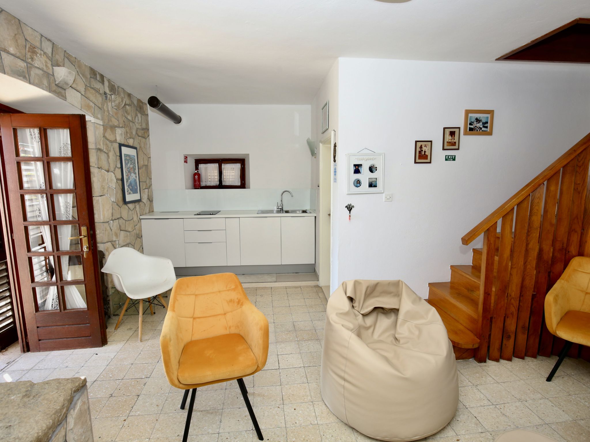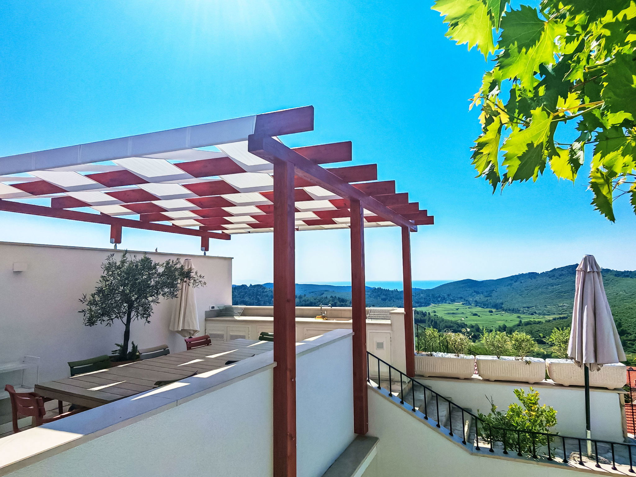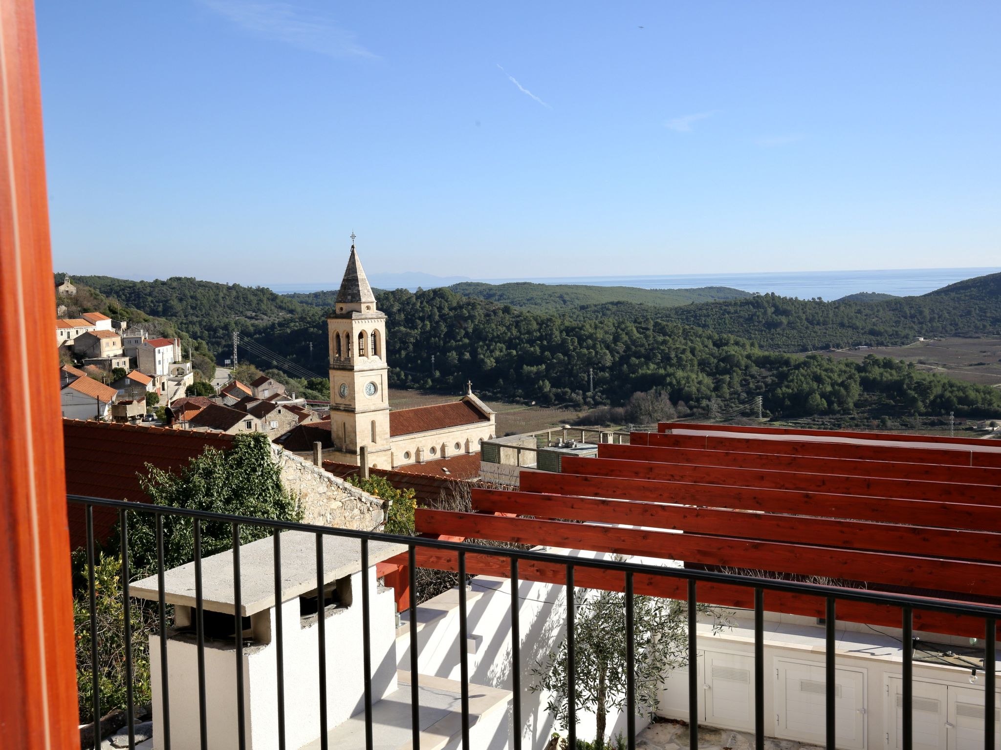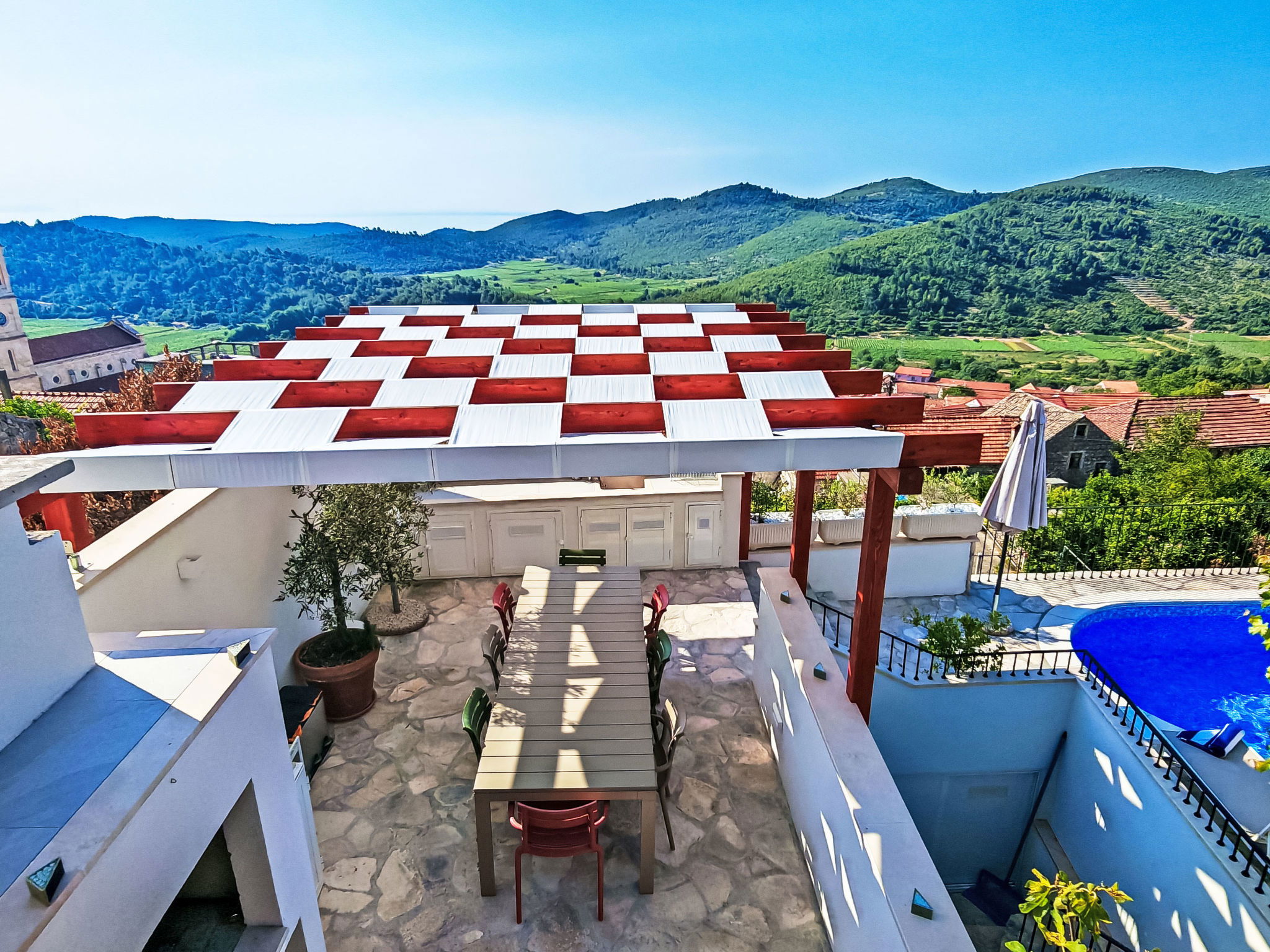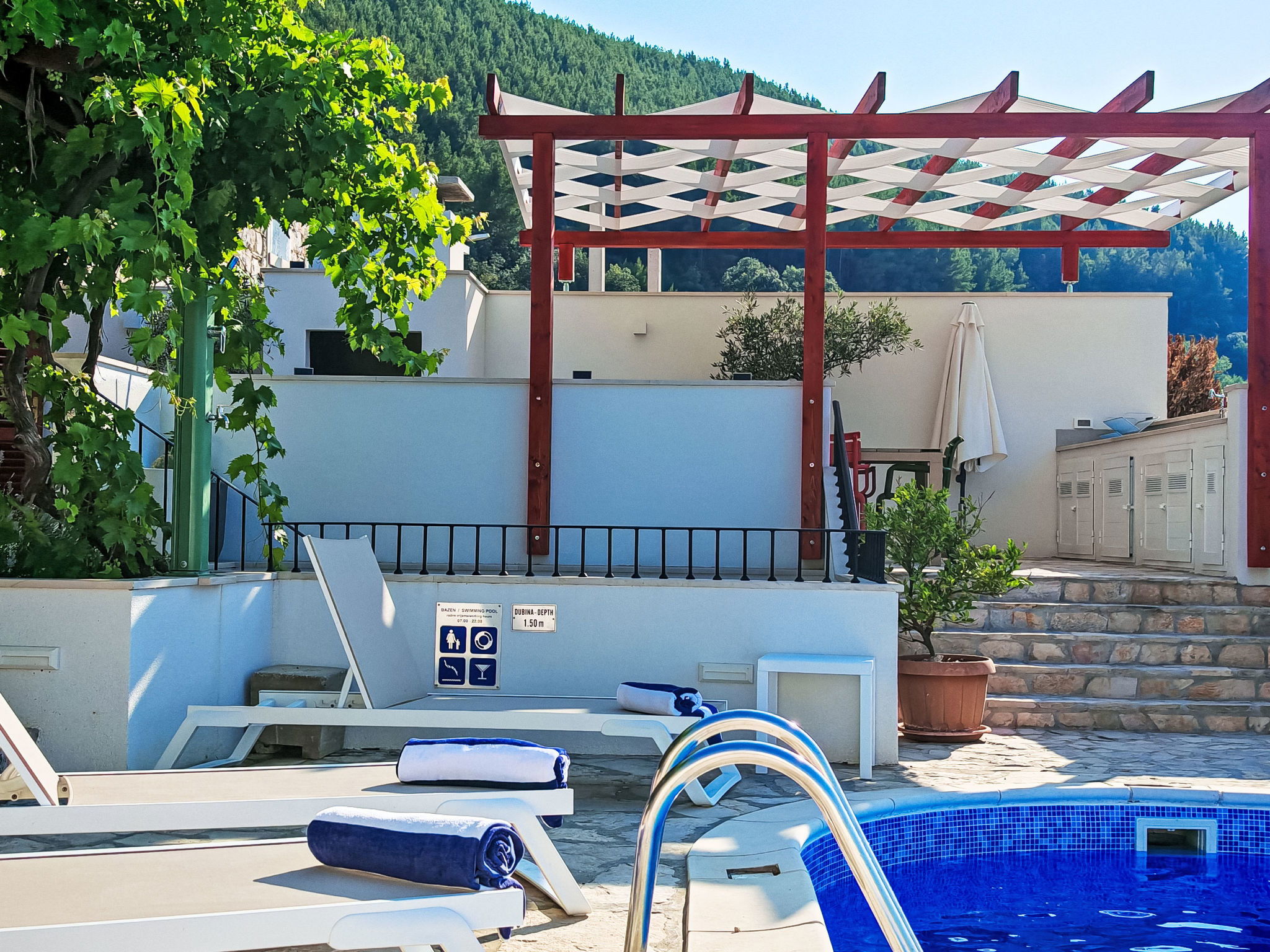 Terraced house "Prusina", 2 storeys. In a sunny, elevated position, 3.5 km from the sea, 3.5 km from the beach. Private: swimming pool (6 x 3 m, depth 150 cm, seasonal availability: 01.May. - 01.Oct.). In the house: internet access, washing machine. Parking (for 2 cars) at the house. Shop 150 m, restaurant 250 m, bus stop 150 m, pebble beach 3.5 km, concrete beach 3.5 km.