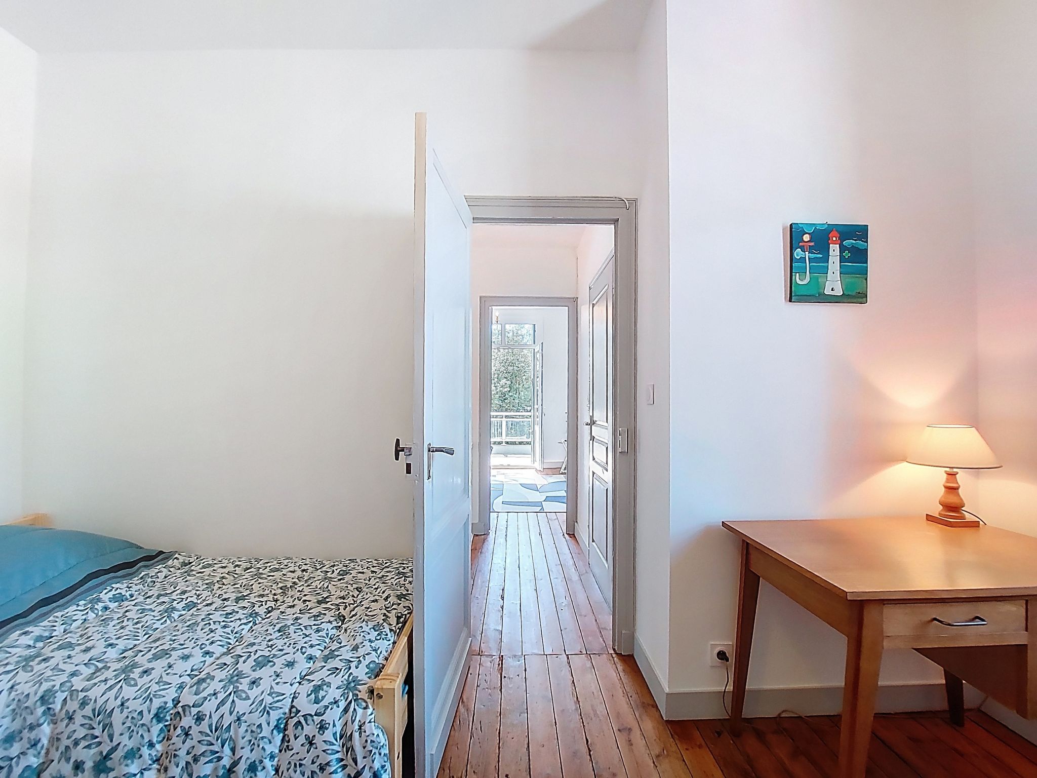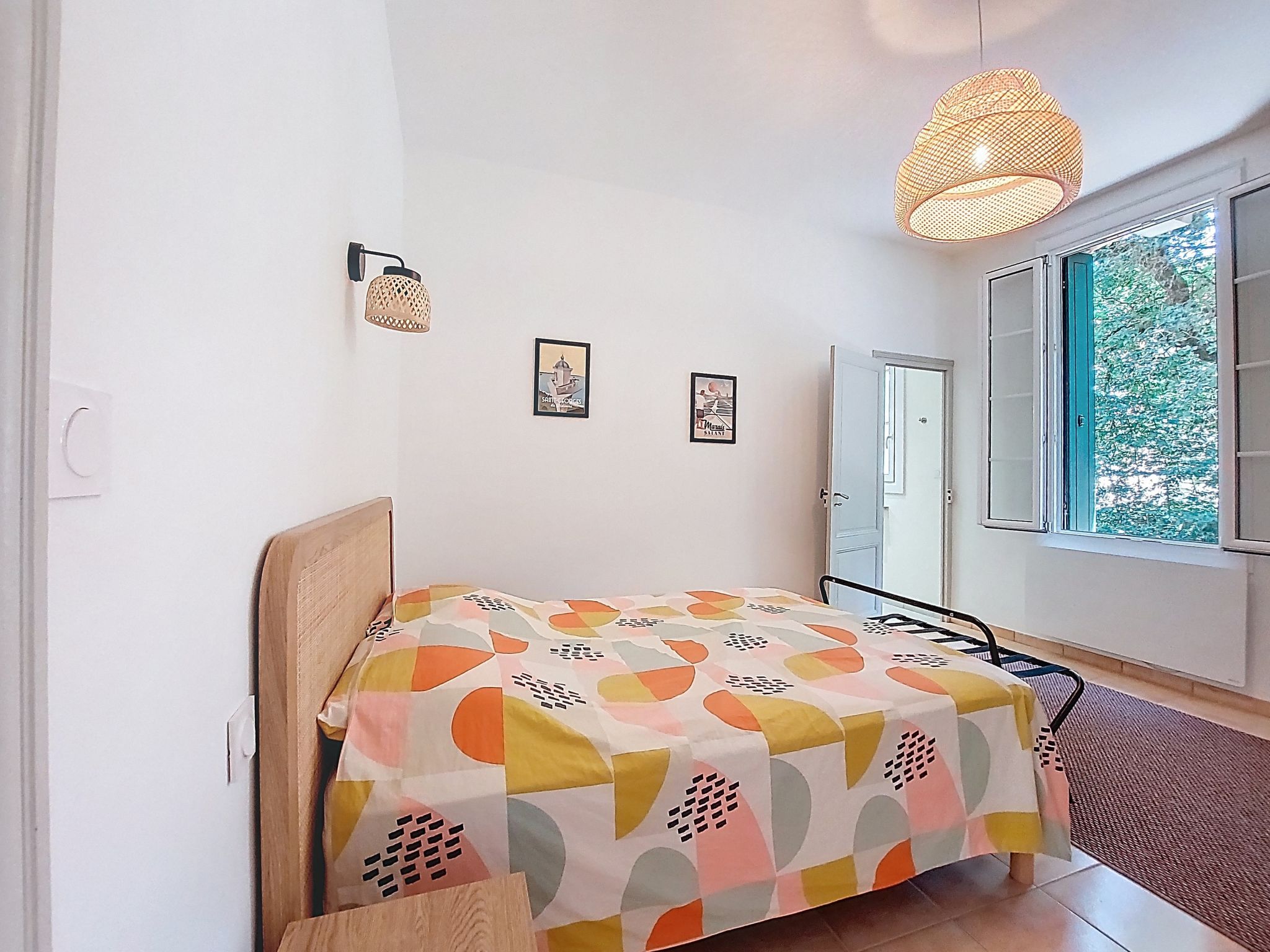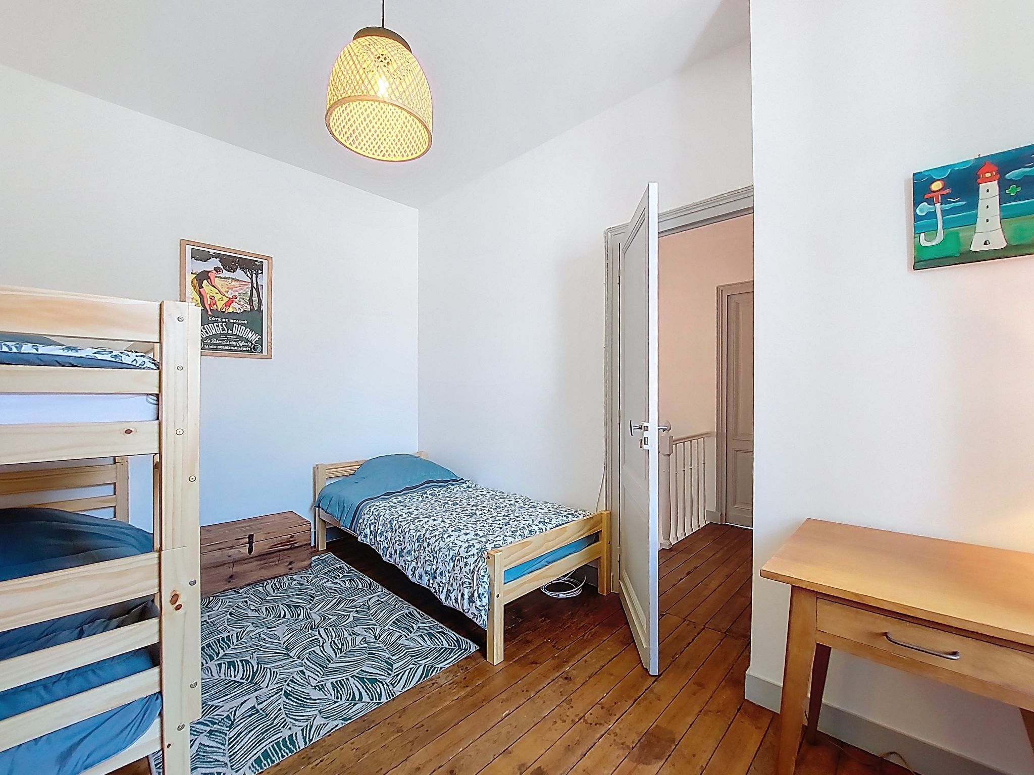 4-room house 110 m2 on 2 levels. Beautiful furnishings: living room with TV (flat screen). 1 room with 1 french bed (1 x 140 cm, length 190 cm), shower/WC. Kitchen (oven, dishwasher, 3 ceramic glass hob hotplates, toaster, kettle, microwave, freezer, electric coffee machine) with dining table. Exit to the garden, to the terrace, to the veranda. Sep. WC. Upper floor: 1 room with 1 french bed (1 x 140 cm, length 190 cm). Exit to the balcony. 1 room with 1 bed (90 cm, length 190 cm), 1 x 2 bunk beds (90 cm, length 190 cm). Shower/WC. Electric heating. Terrace 12 m2, garden 700 m2. Terrace furniture. Facilities: washing machine. Internet (WiFi, free). Parking (2 cars). Please note: smoke alarm. Offer by a private individual according to Art. 155, IV of CGI.