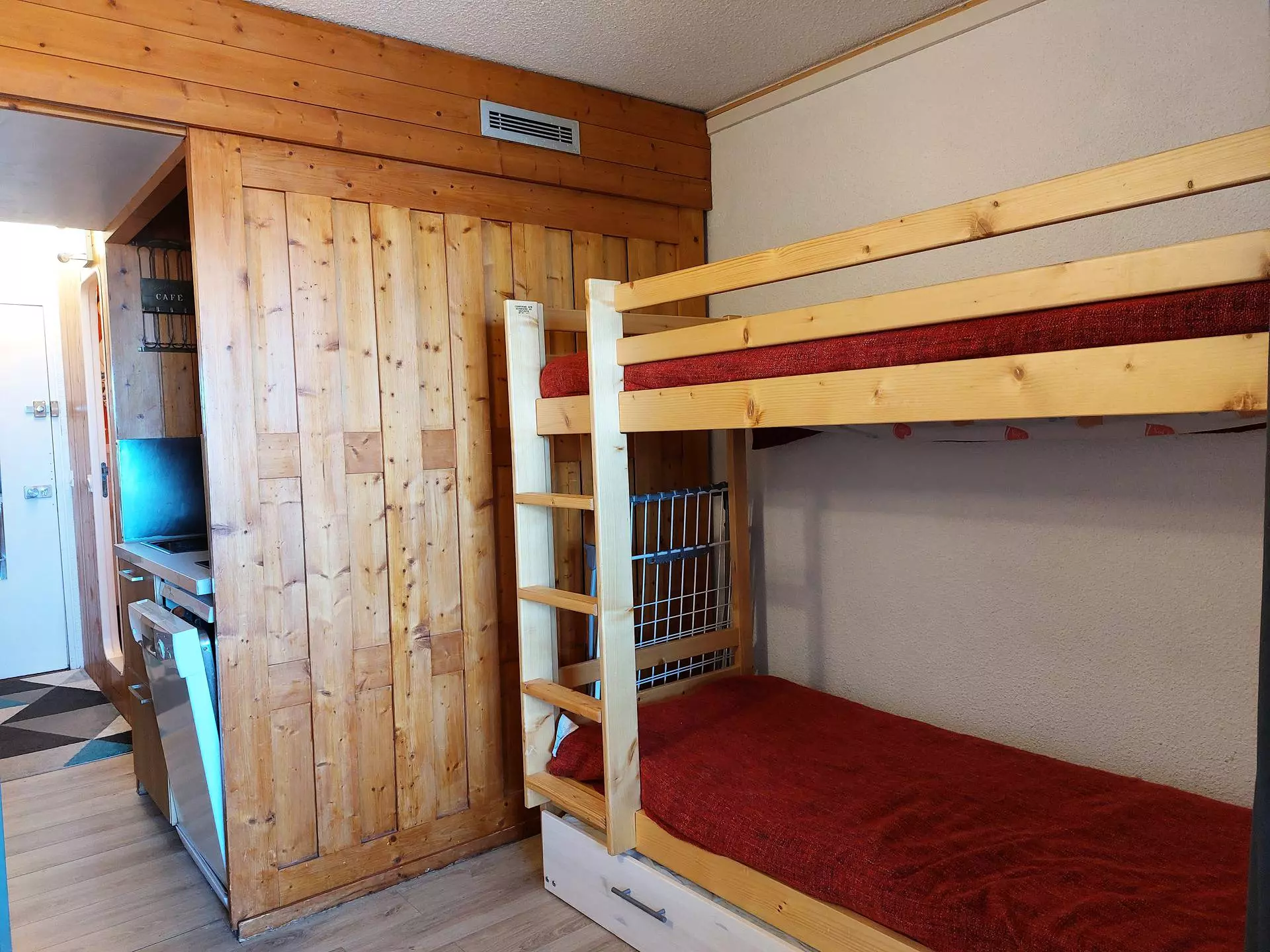 A mountain corner with a set of bunk beds and a pull-out bed.
