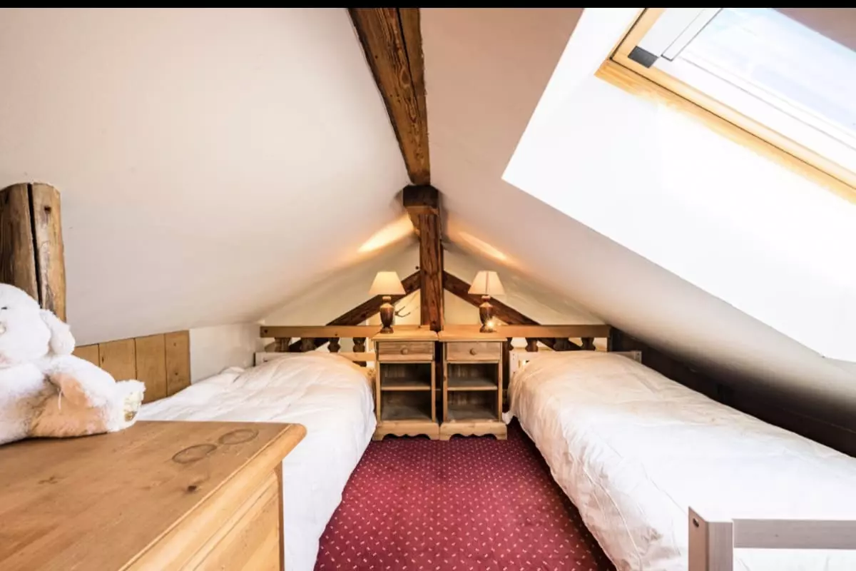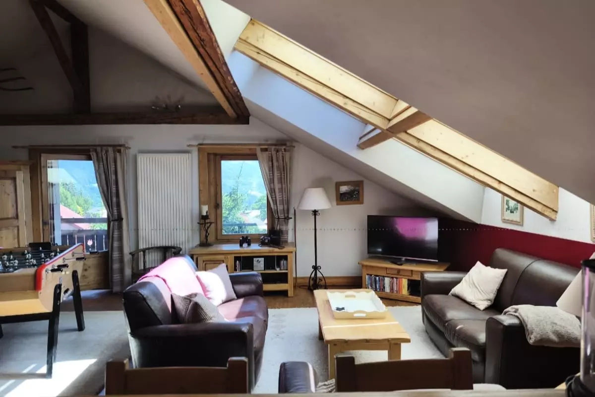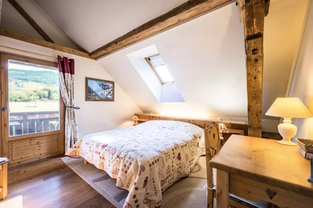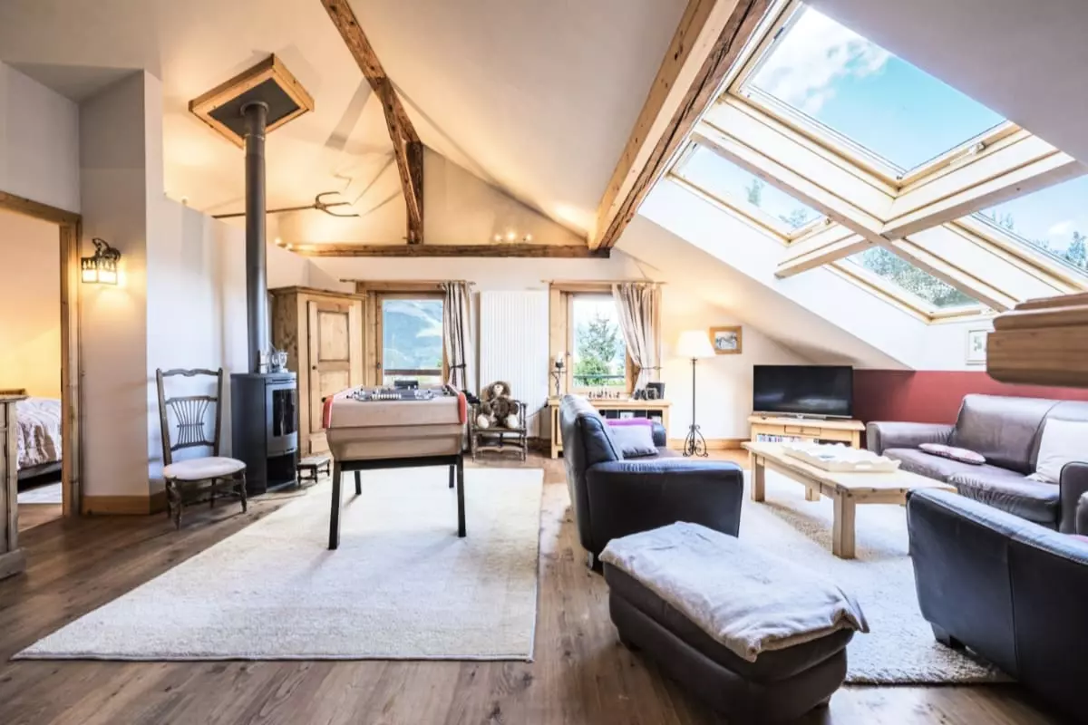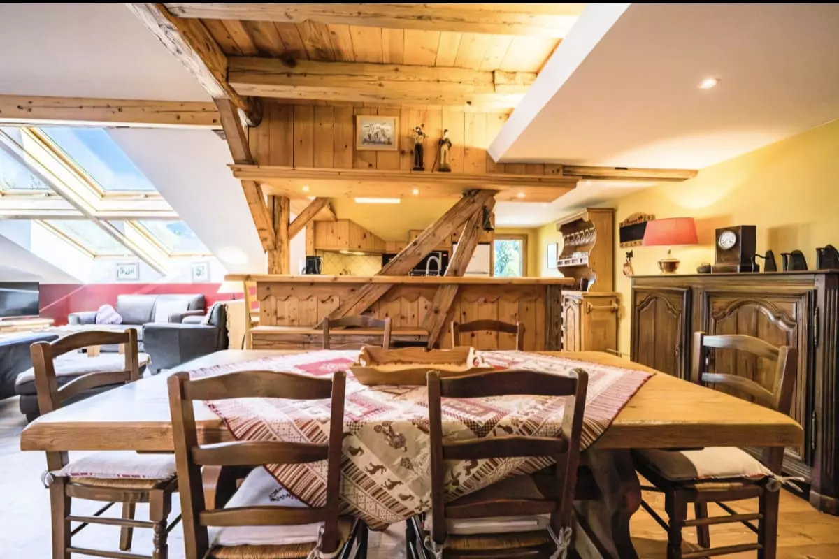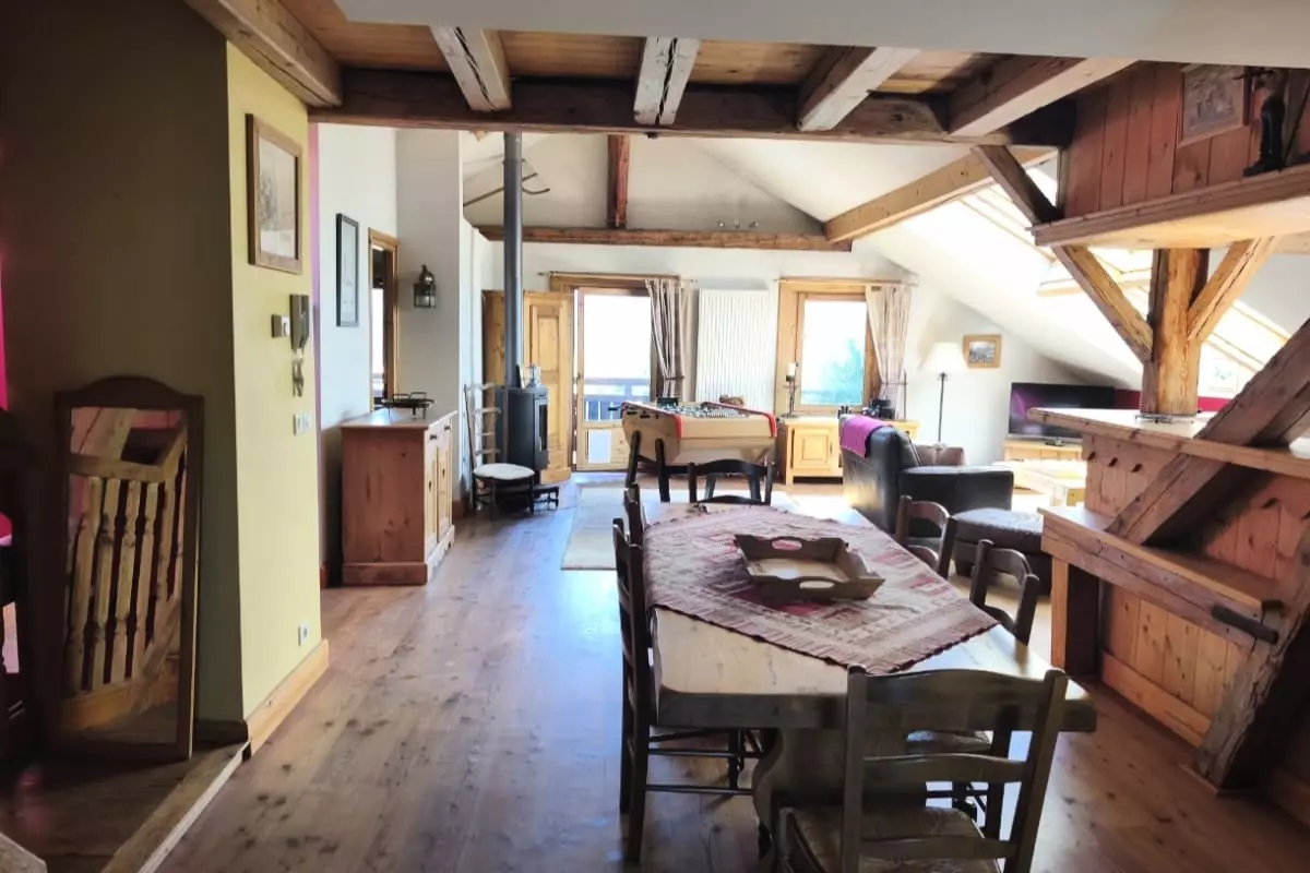 Located in a small, five-unit condominium offering all the amenities of a mountain chalet, it occupies the top floor of the residence. With breathtaking views of the entire Mont Blanc range, it includes: