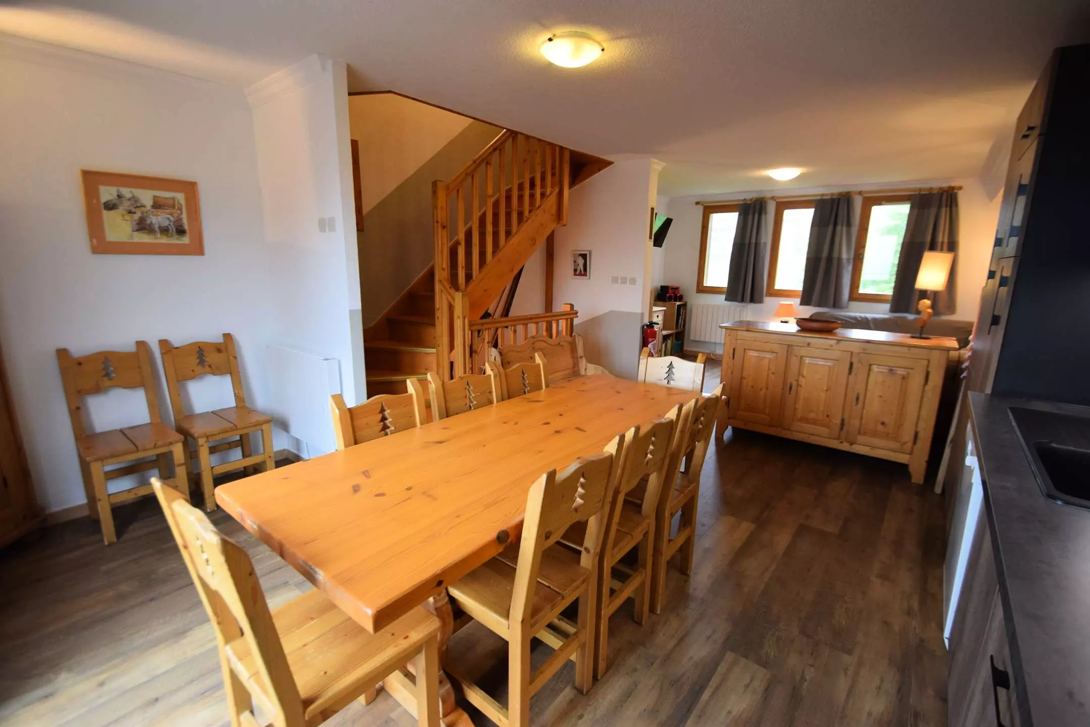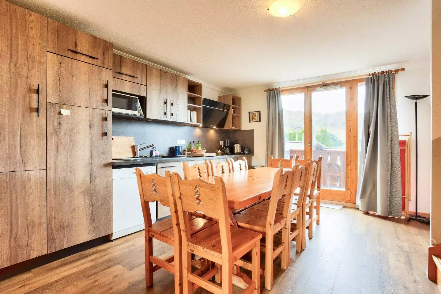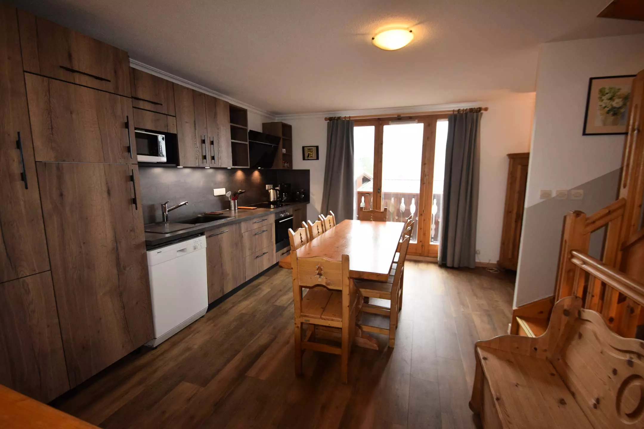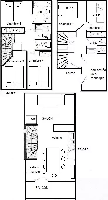 Semi-detached chalet for 10 people, 92m2 on 3 levels, living room + 5 bedrooms, balcony on the 1st floor facing south and west, mountain view. 100m from the slopes and shops. Level 1: CH1: 2 bunk beds 80x190cm - CH2: 1 double bed (160cm) - Shower room, WC included. Level 2: Kitchen: 4 induction hobs, oven, microwave, dishwasher, fridge / freezer. Living room: dining area, and lounge area, fireplace (wood not provided), flat screen TV. Level 3: CH3, 4, 5: 2 single beds 80x190cm. Seperate WC. Bathroom: bath, WC included in CH5. Shower room - Bedding: duvets - Sheets, household linen and final cleaning and ski passes are optional - Floors: carpet in bedrooms and tiles in other rooms. Semi-detached chalet in a small hamlet, with beautiful views of the valley and the mountains, good comfort, very bright. Free outdoor parking nearby.