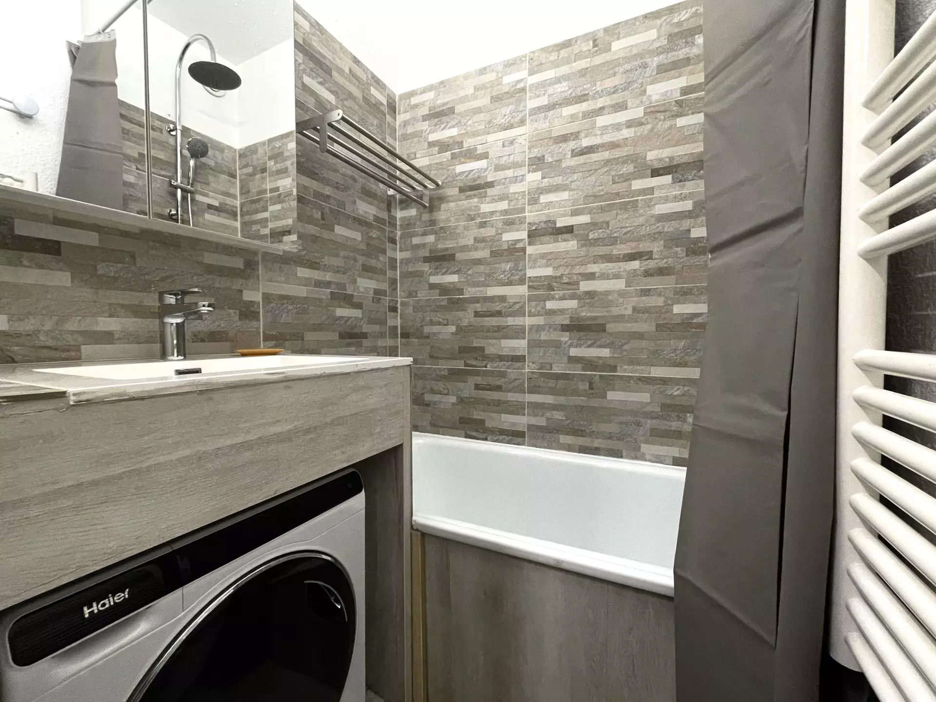 Bathroom: sink, bathtub, towel dryer, 3kg washing machine