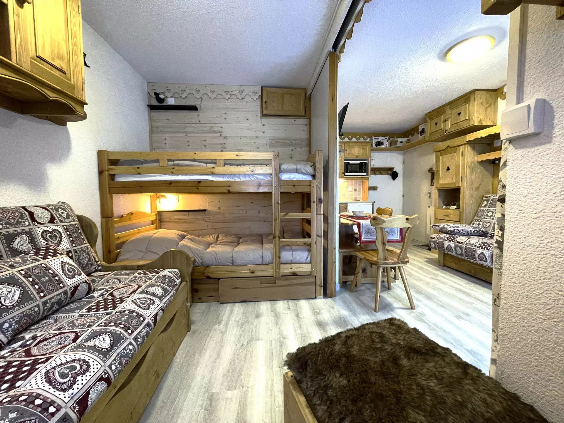 Sleeping area separated from the living room by a sliding partition: 1 bunk bed (2x80cm) and 1 trundle bed (2 x 80cm)