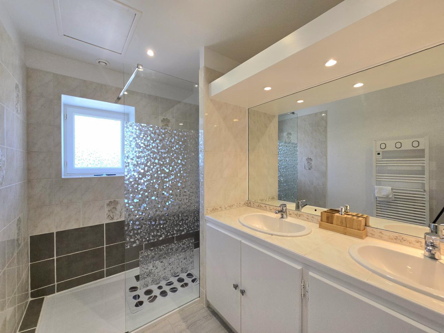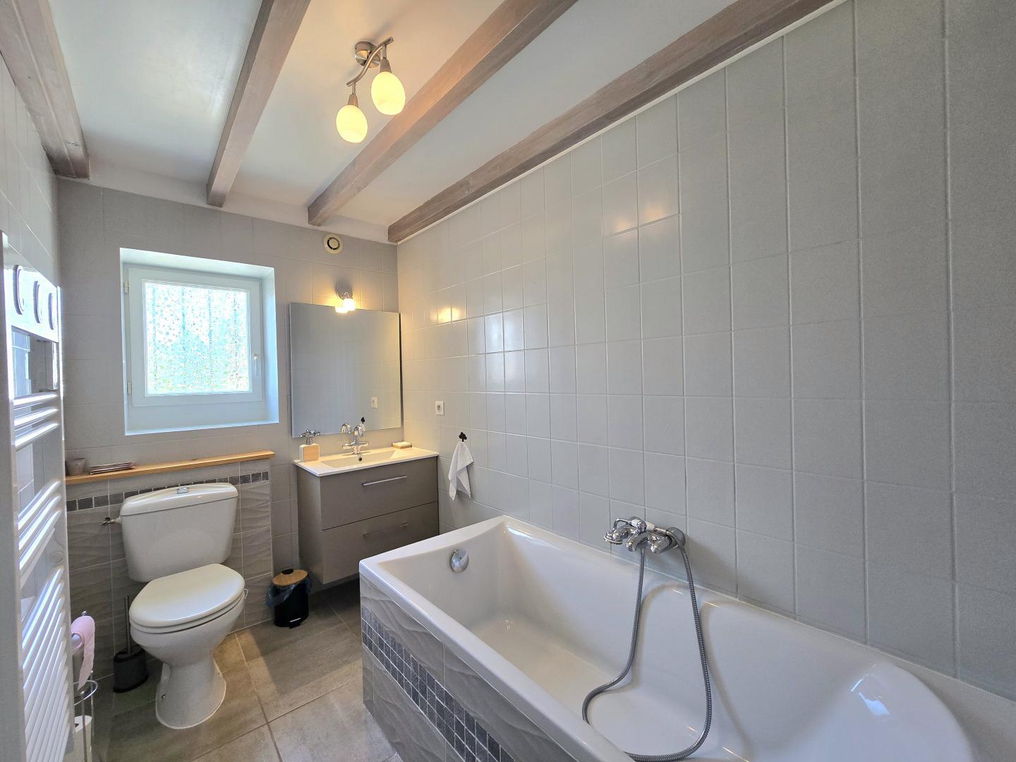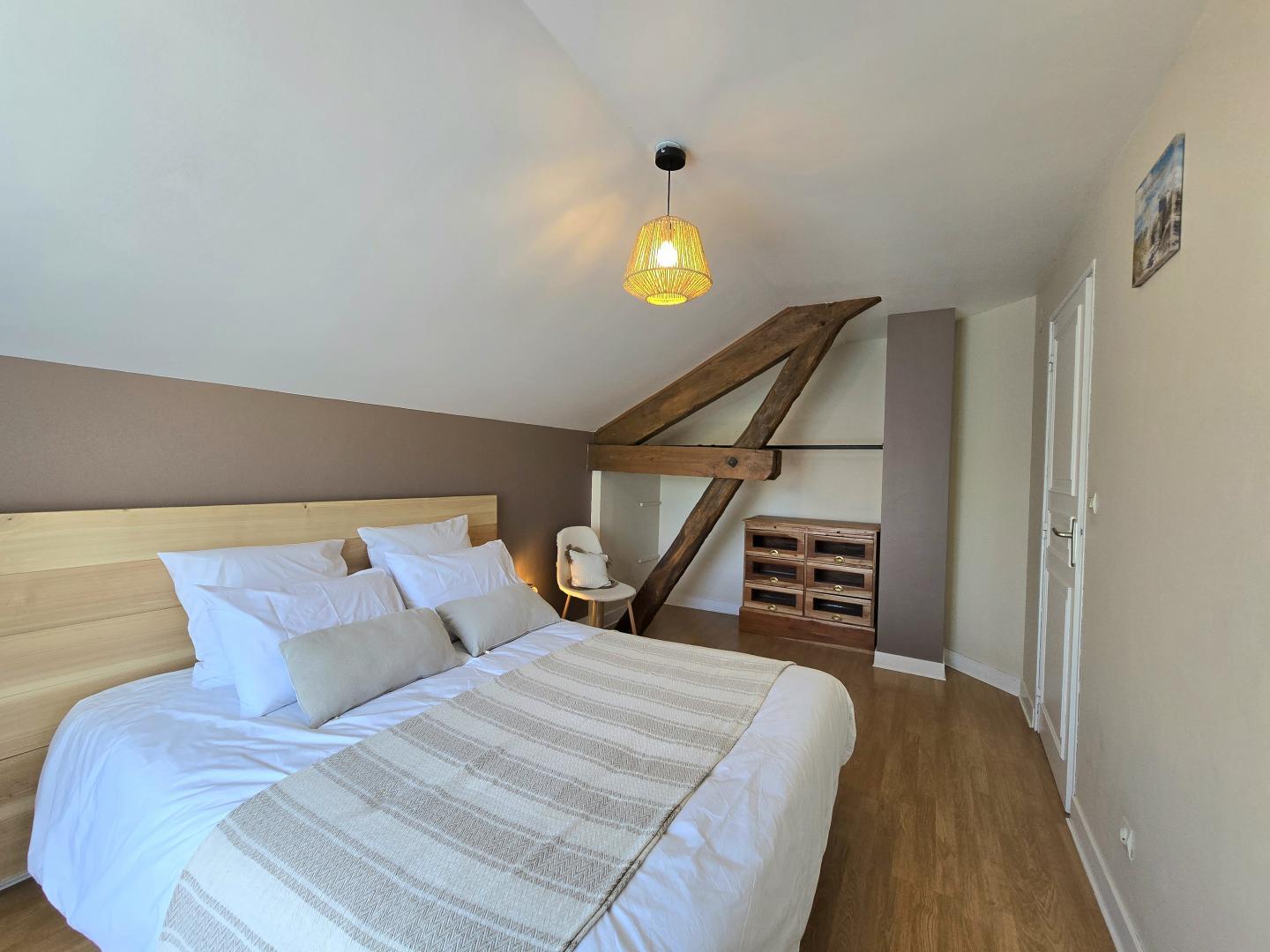 You will enter through a fully equipped kitchen (3 induction burners, dishwasher, microwave...) with central island. The kitchen opens onto the living room with its cathedral ceiling: a dining area for 6 people and a lounge area with sofa, TV, Wi-Fi, and pellet stove. You will also have on the ground floor a bathroom with bathtub and toilet, then a garage with washing machine. On the 1st floor, a mezzanine with a library corner and armchairs. Then 2 bedrooms each with a 160x200 bed, a bathroom with a walk-in shower. And a separate toilet.