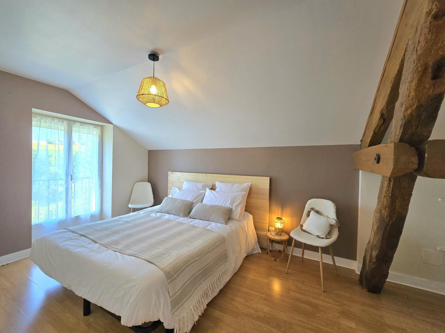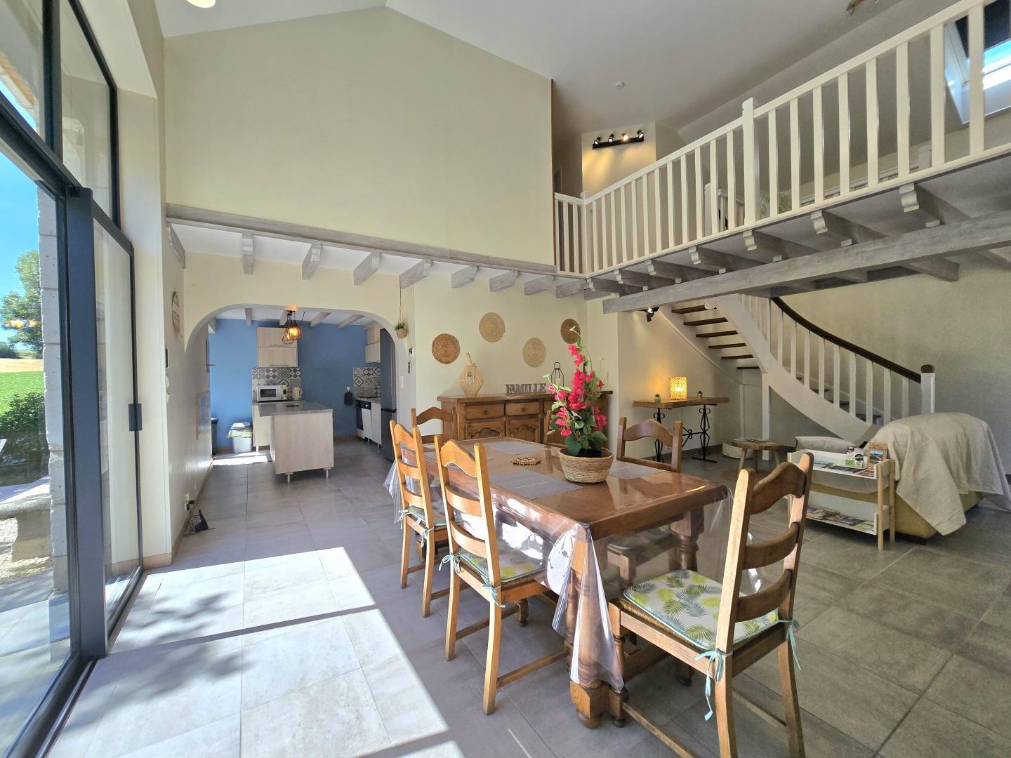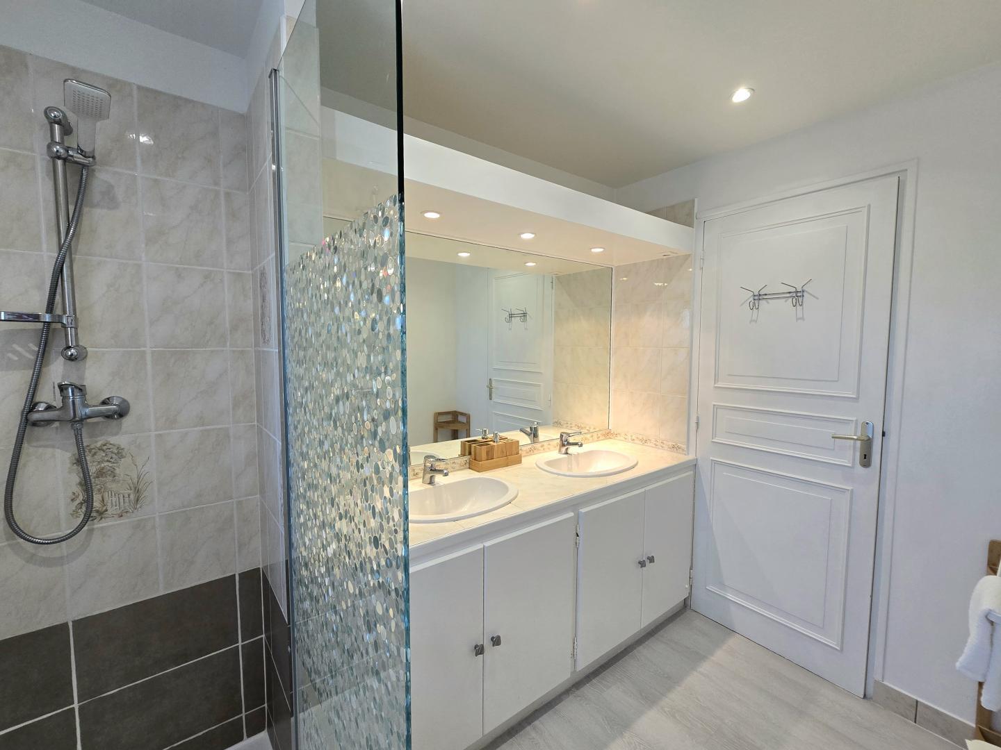 You will enter through a fully equipped kitchen (3 induction burners, dishwasher, microwave...) with central island. The kitchen opens onto the living room with its cathedral ceiling: a dining area for 6 people and a lounge area with sofa, TV, Wi-Fi, and pellet stove. You will also have on the ground floor a bathroom with bathtub and toilet, then a garage with washing machine. On the 1st floor, a mezzanine with a library corner and armchairs. Then 2 bedrooms each with a 160x200 bed, a bathroom with a walk-in shower. And a separate toilet.