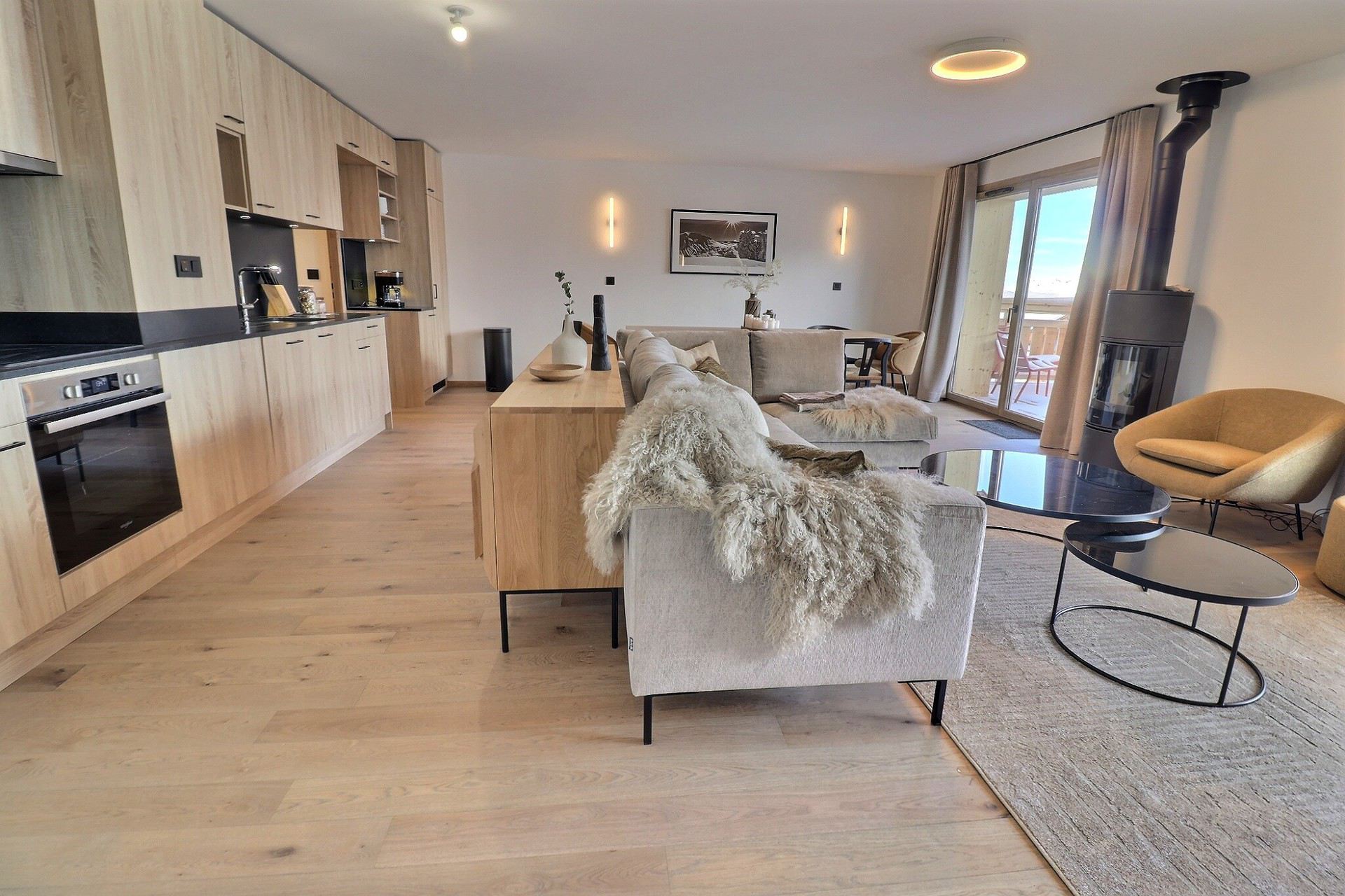 Open kitchen: oven, dishwasher, fridge, 4 induction hobs, extractor hood, filter coffee maker, toaster, kettle