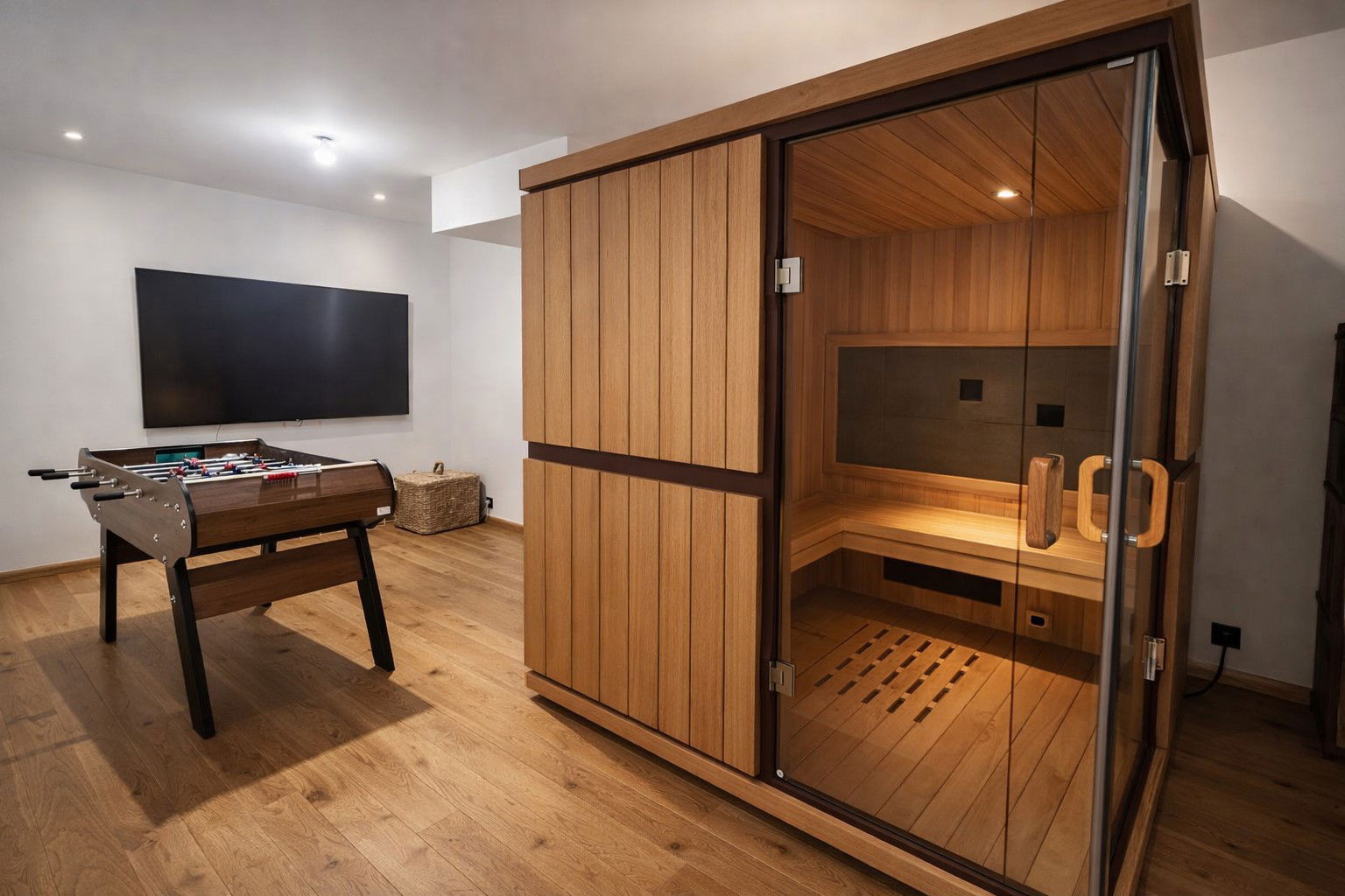 Relaxation area being set up with 1 infrared sauna, 1 table football, 1 Switch 2