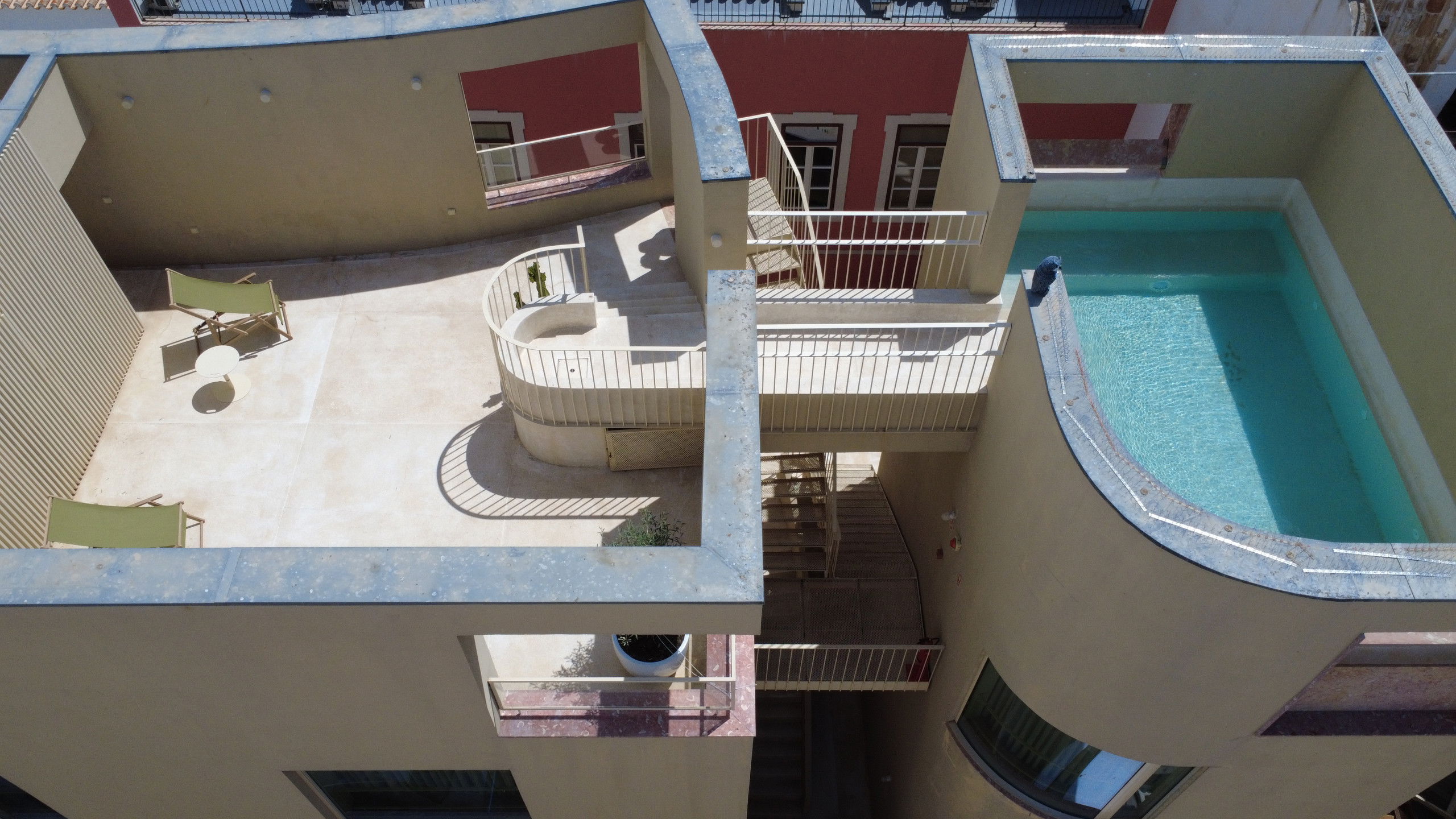 Beyond the inner experience, guests have access to common outdoor areas and a swimming pool installed on the top of the rear building — a unique space to relax and enjoy the sun. However, given access only by open stairs, this space is not suitable for guests with reduced mobility or small children.