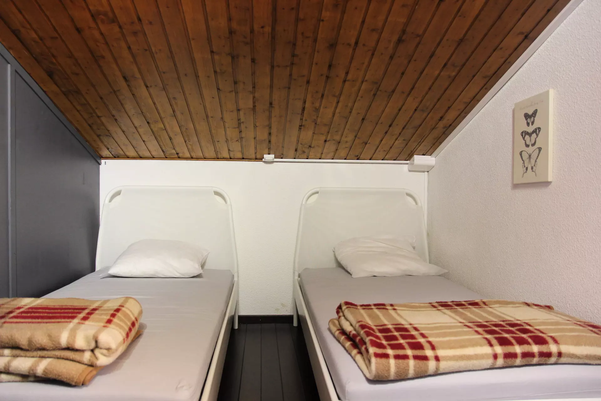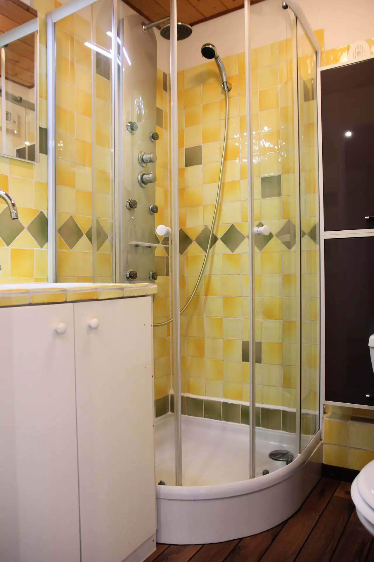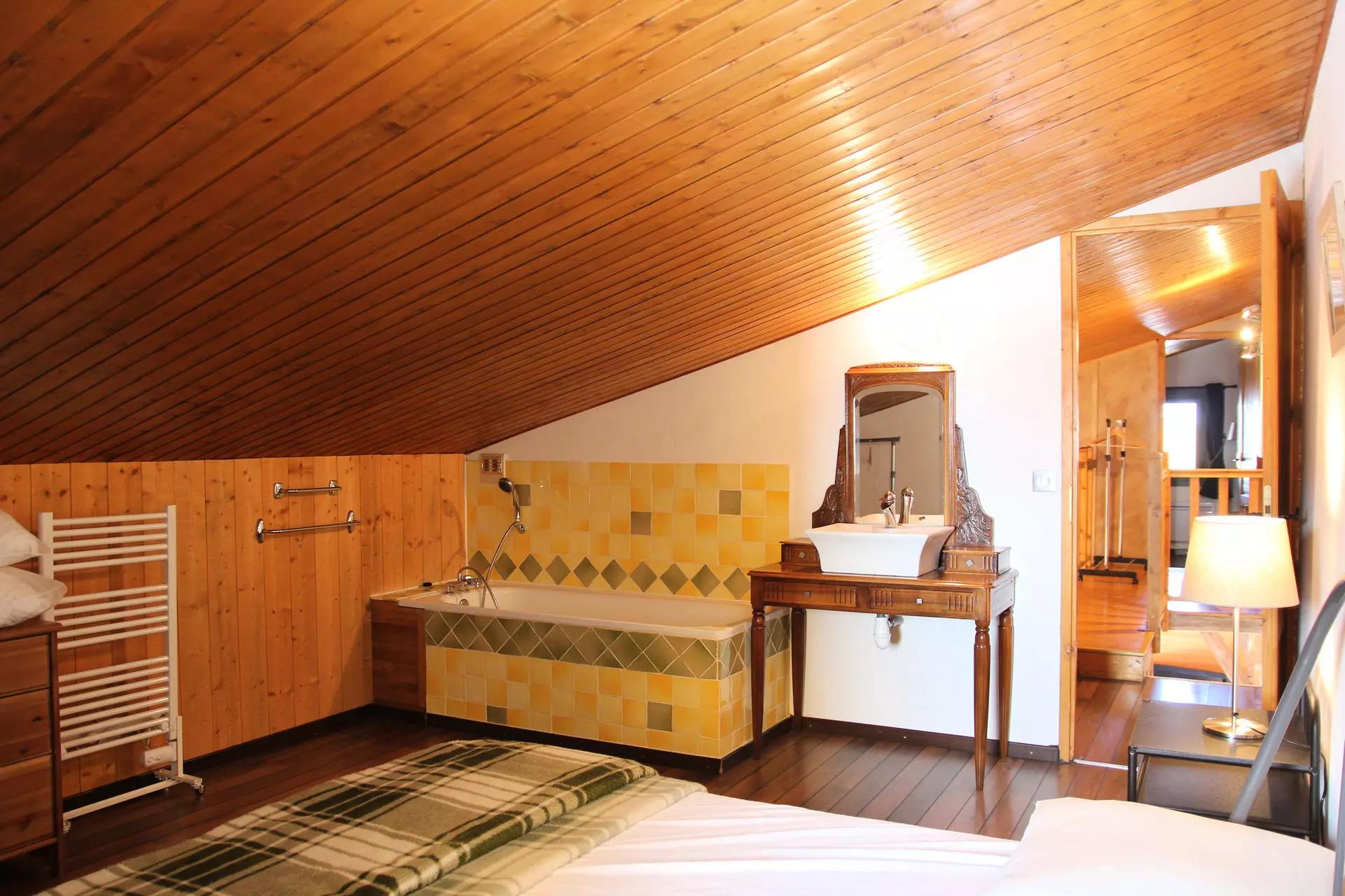 Upstairs, you will find a bedroom with two single beds, another bedroom with a 160cm double bed, sink and bathtub, and a sofa bed on the mezzanine.