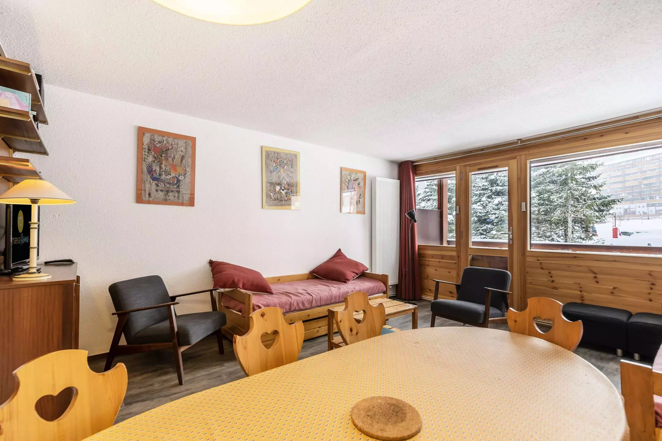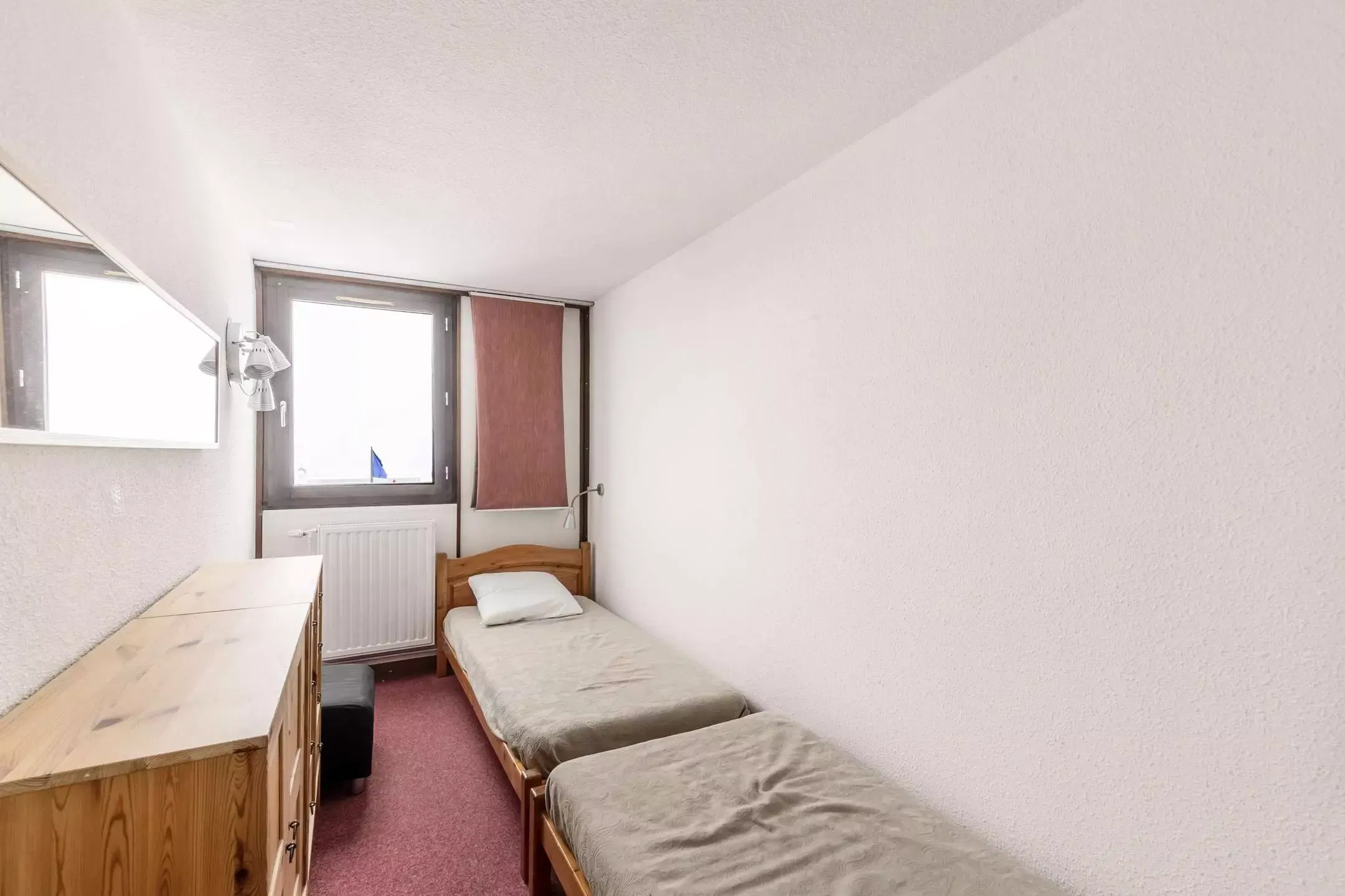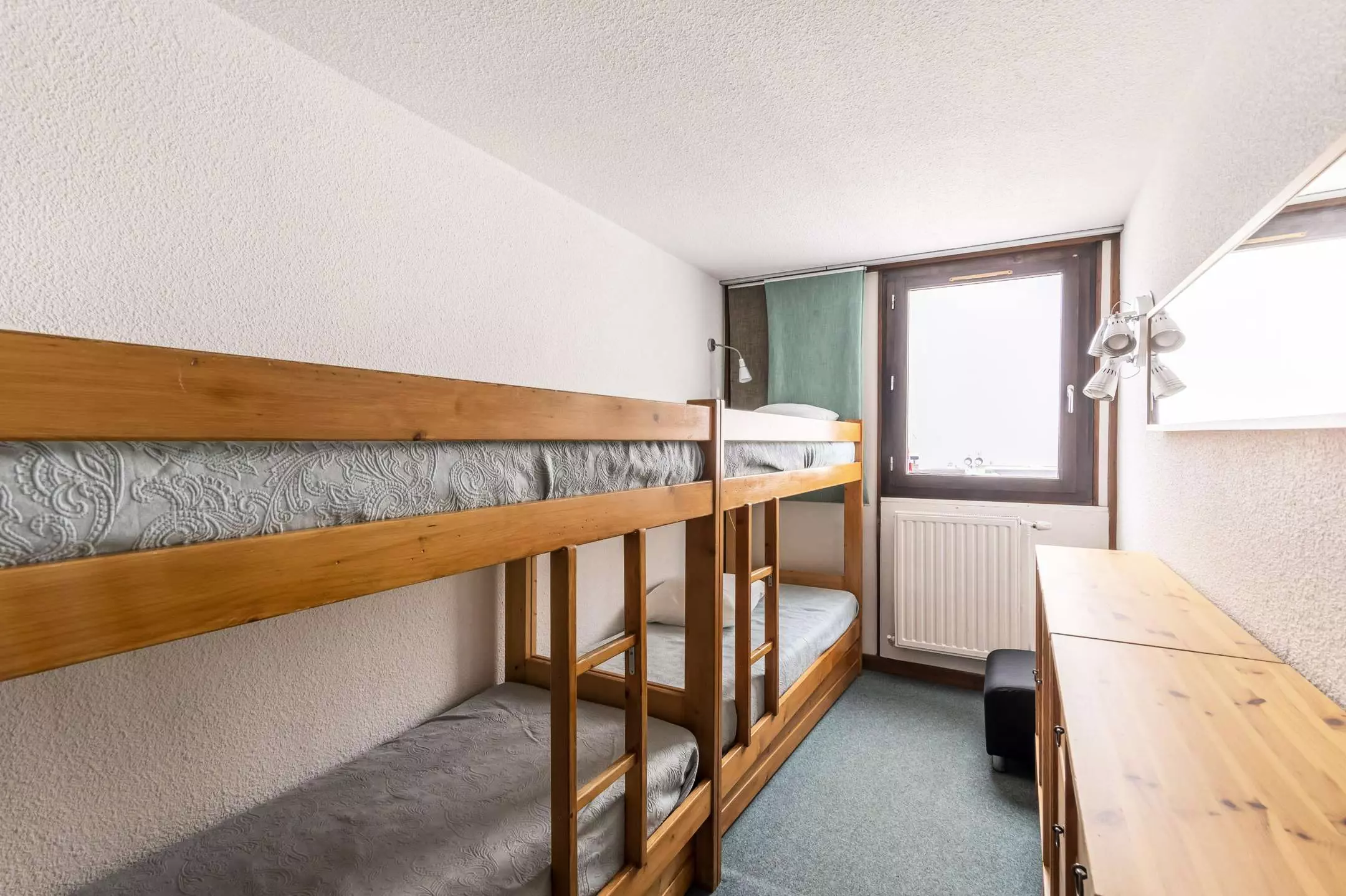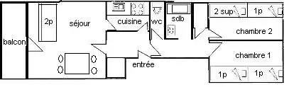3-room apartment, 6/7 people: approx. 57m2 south-facing, beautiful view of the slopes, balcony overlooking the 1st floor slope side, Access to the 2nd floor road side without elevator -. Separate kitchen: 4 ceramic hobs, refrigerator, dishwasher, oven, microwave - Living room: 1 double sofa bed, TV - Bedroom 1: 2 single beds. Bedroom 2: 2 bunk beds and 1 single bed. Bathroom: bathtub. Separate WC. Bedding: blankets - Optional and extra: end-of-stay cleaning, sheets, towels, ski passes. Pleasant and quiet apartment well located in the heart of the resort. WIFI INCLUDED. Small, quiet 2-story residence without elevator, direct interior access to the shopping mall. Ski locker no. 201 on the ground floor.
