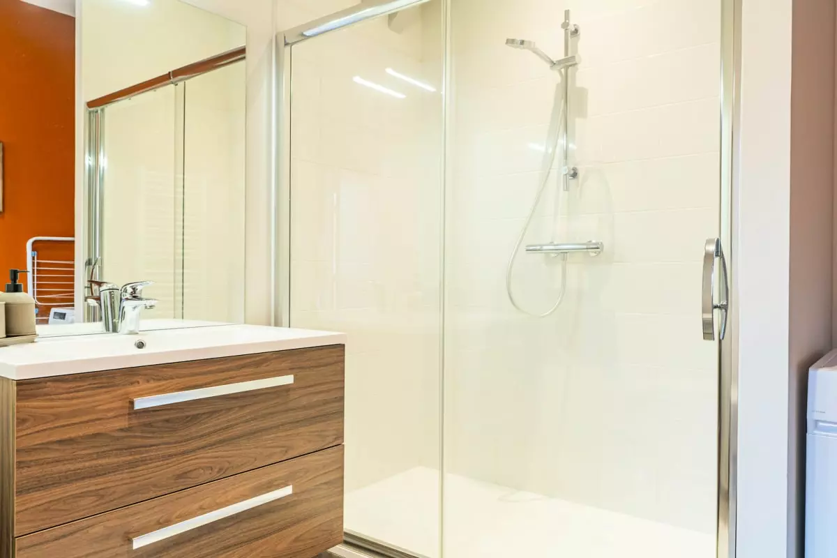Inside, you'll discover a bright living space, a fully equipped open kitchen, and a tastefully decorated bedroom that can accommodate up to two people. The bathroom features a large walk-in shower and a double sink vanity. The toilet is located in the bathroom.