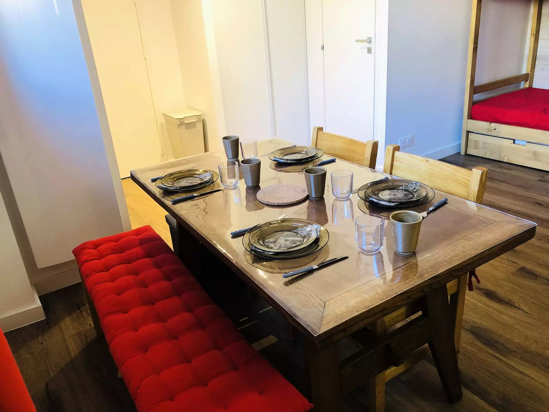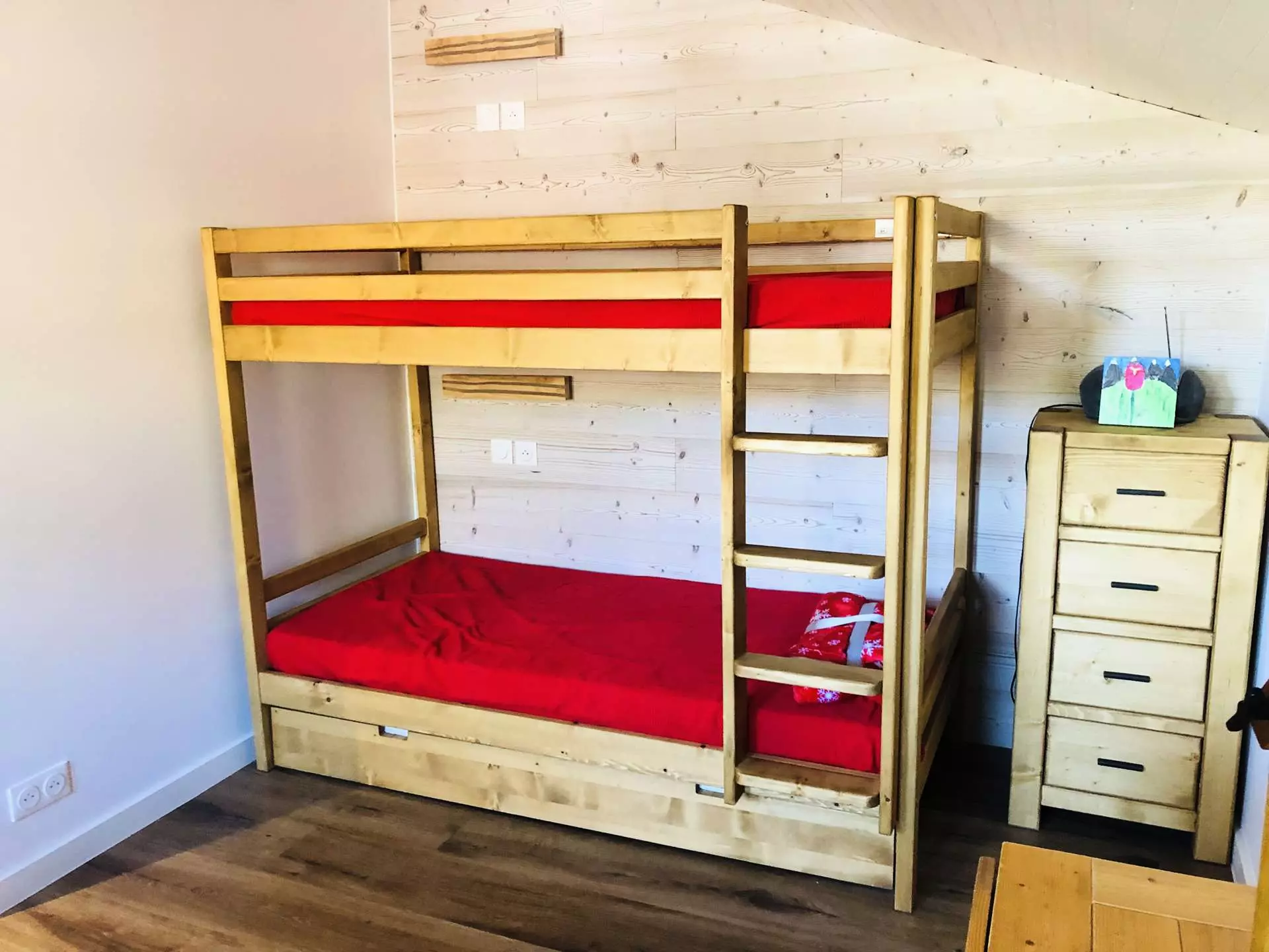 The living room is furnished with a sofa bed that converts into a double bed and two bunk beds with a pull-out bed, all equipped with blankets.