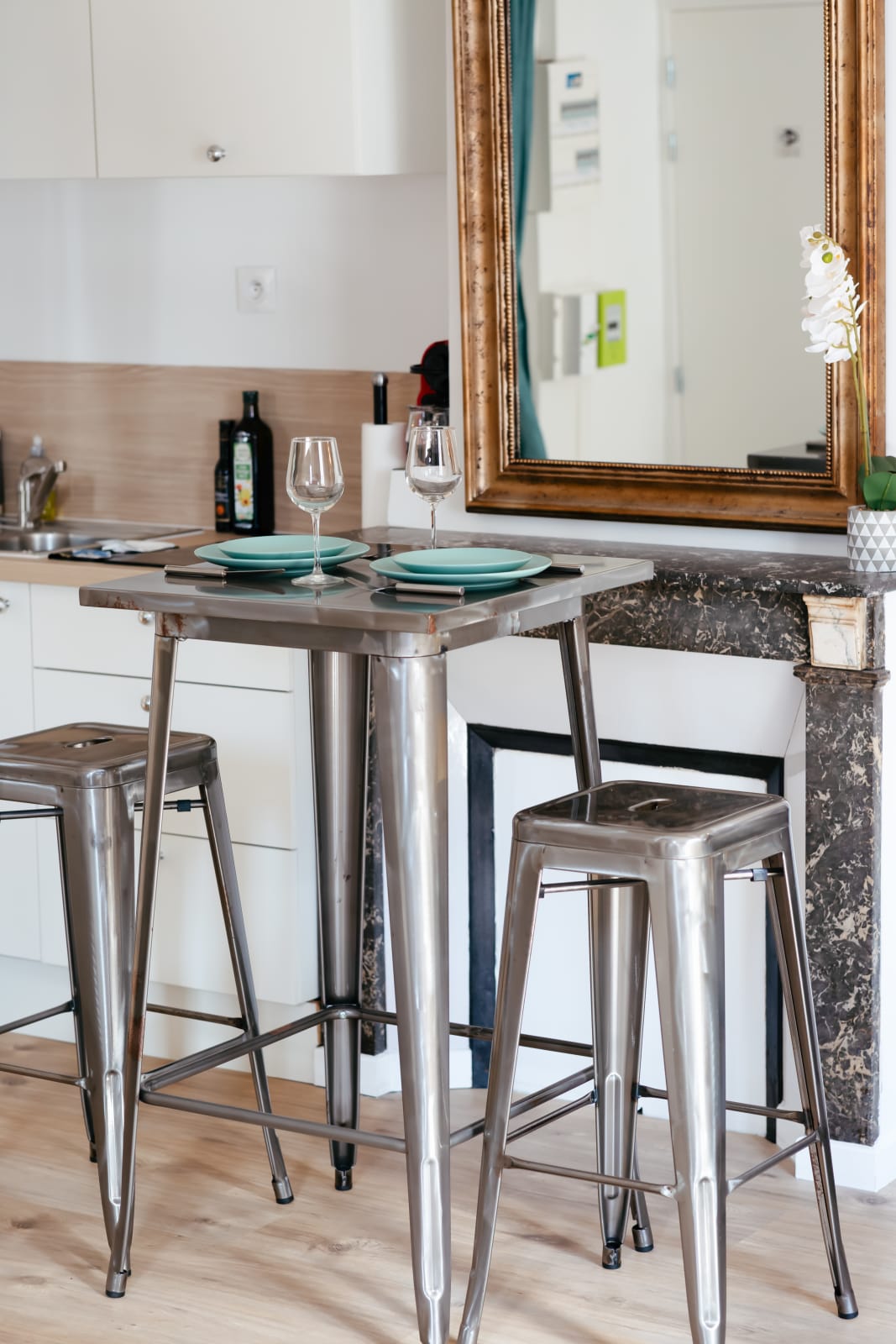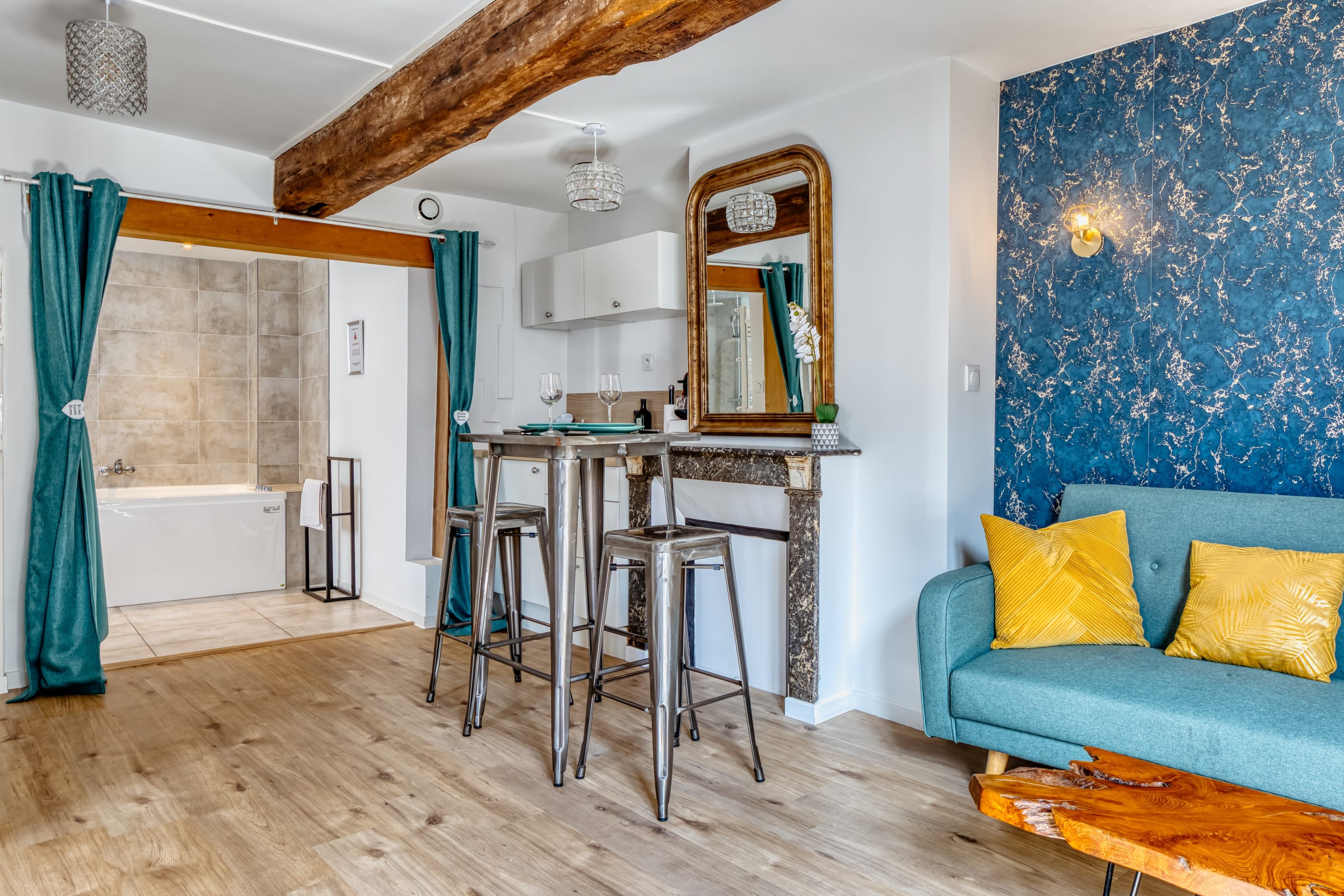 As soon as you walk through the door, natural light envelops you and reveals a warm interior, enhanced by parquet flooring that adds character and softness to the whole space. The living room harmoniously combines style and functionality: a 160 cm double bed invites you to relax in a pleasant atmosphere, while a high table allows you to share a meal for two or work from home in an inspiring setting. The fully equipped kitchen is at your disposal to prepare delicious meals, with everything you need at your fingertips: hob, microwave, Nespresso coffee machine, kettle, toaster, small refrigerator, and crockery.