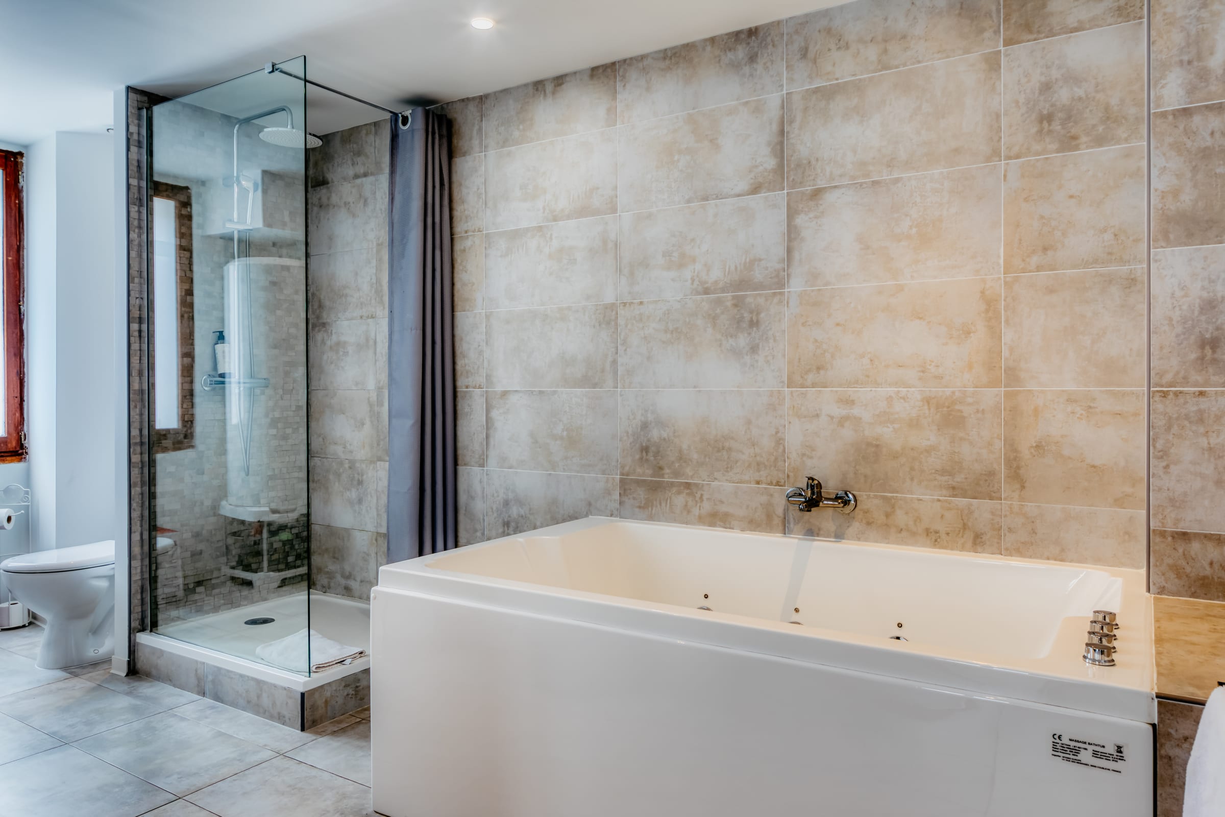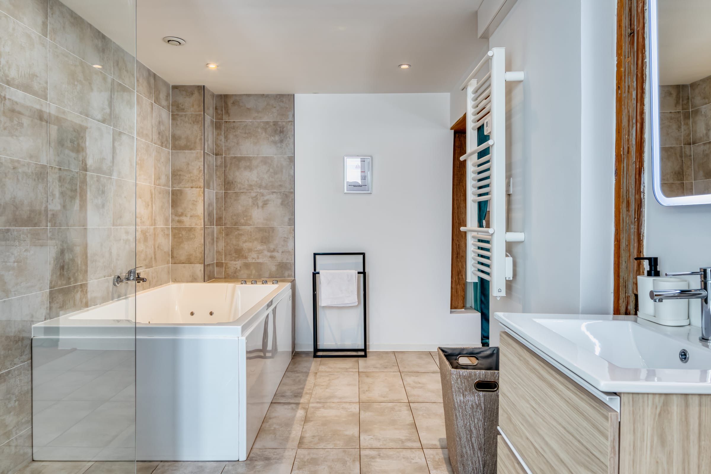 Adjacent to the living room, the bathroom is a true cocoon of well-being. It features a modern walk-in shower, a vanity unit, a toilet, and a whirlpool bath for two, ideal for relaxing after a day exploring the city.