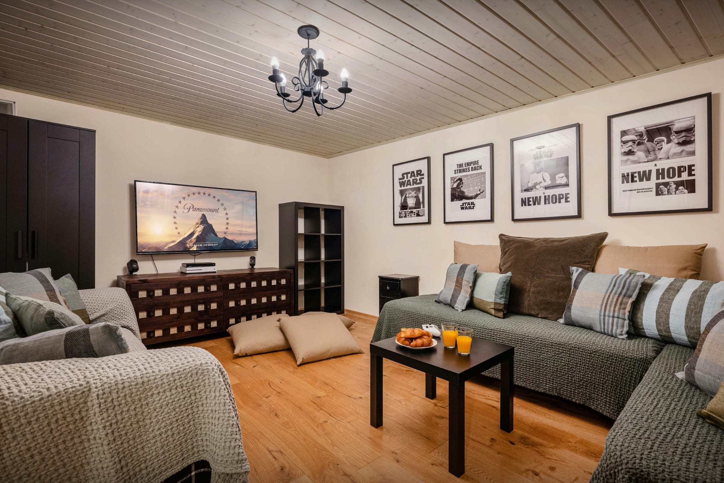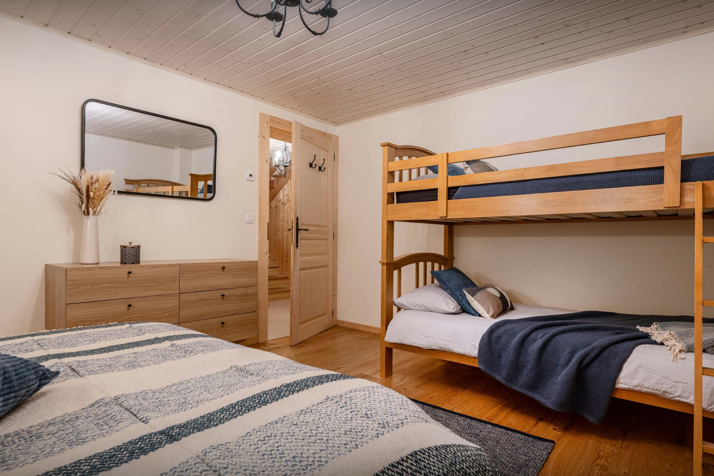 On the lower ground floor, you’ll find a family room with a double bed and two bunk beds, a shower room and separate WC. Children in particular will appreciate the third living room, which has a TV and game console. There’s also a sauna and a spacious laundry room with a washing machine and dryer.