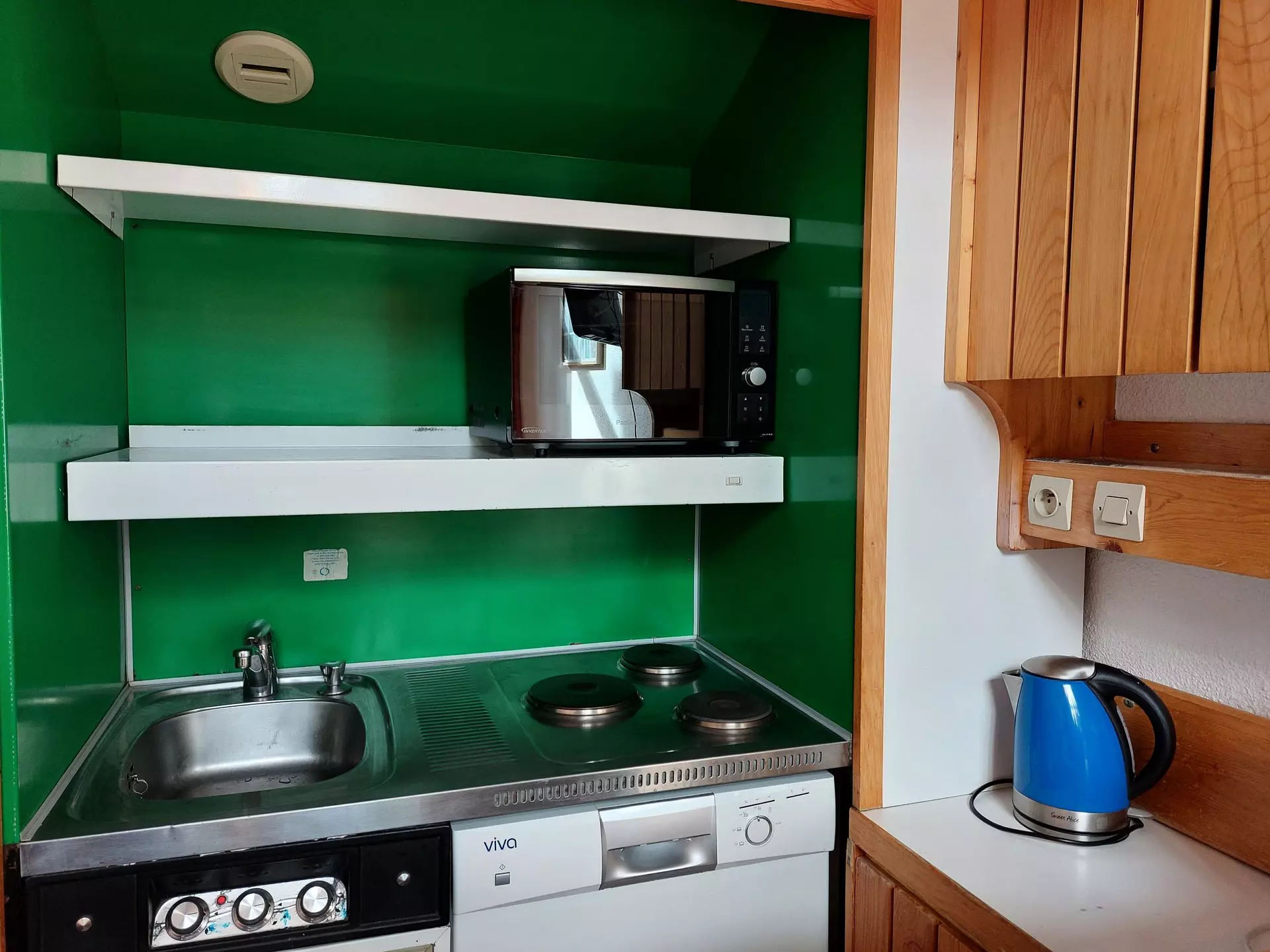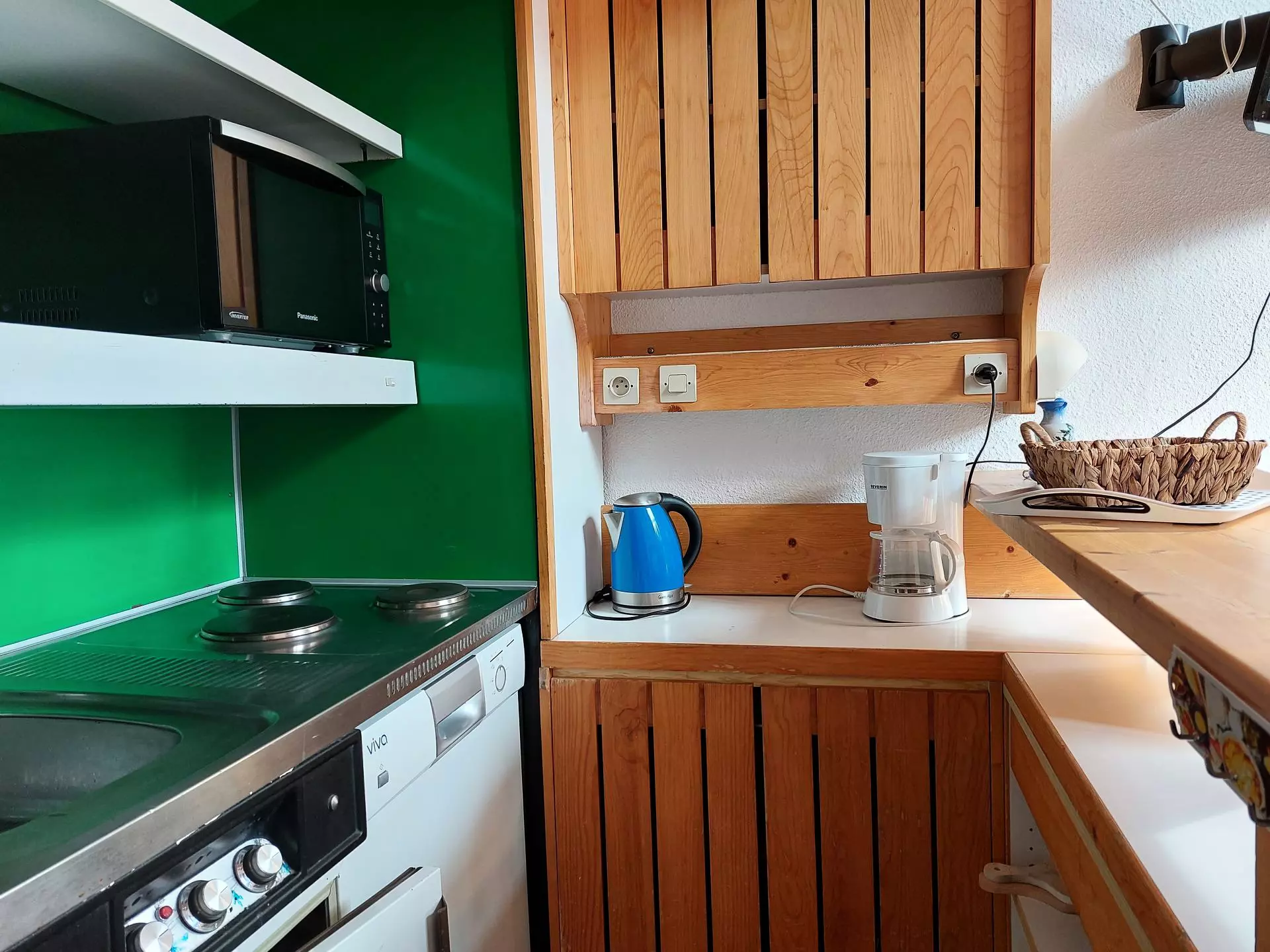 It is equipped with electric hotplates, a combined oven-microwave, a dishwasher, a refrigerator, a coffee maker and a kettle.