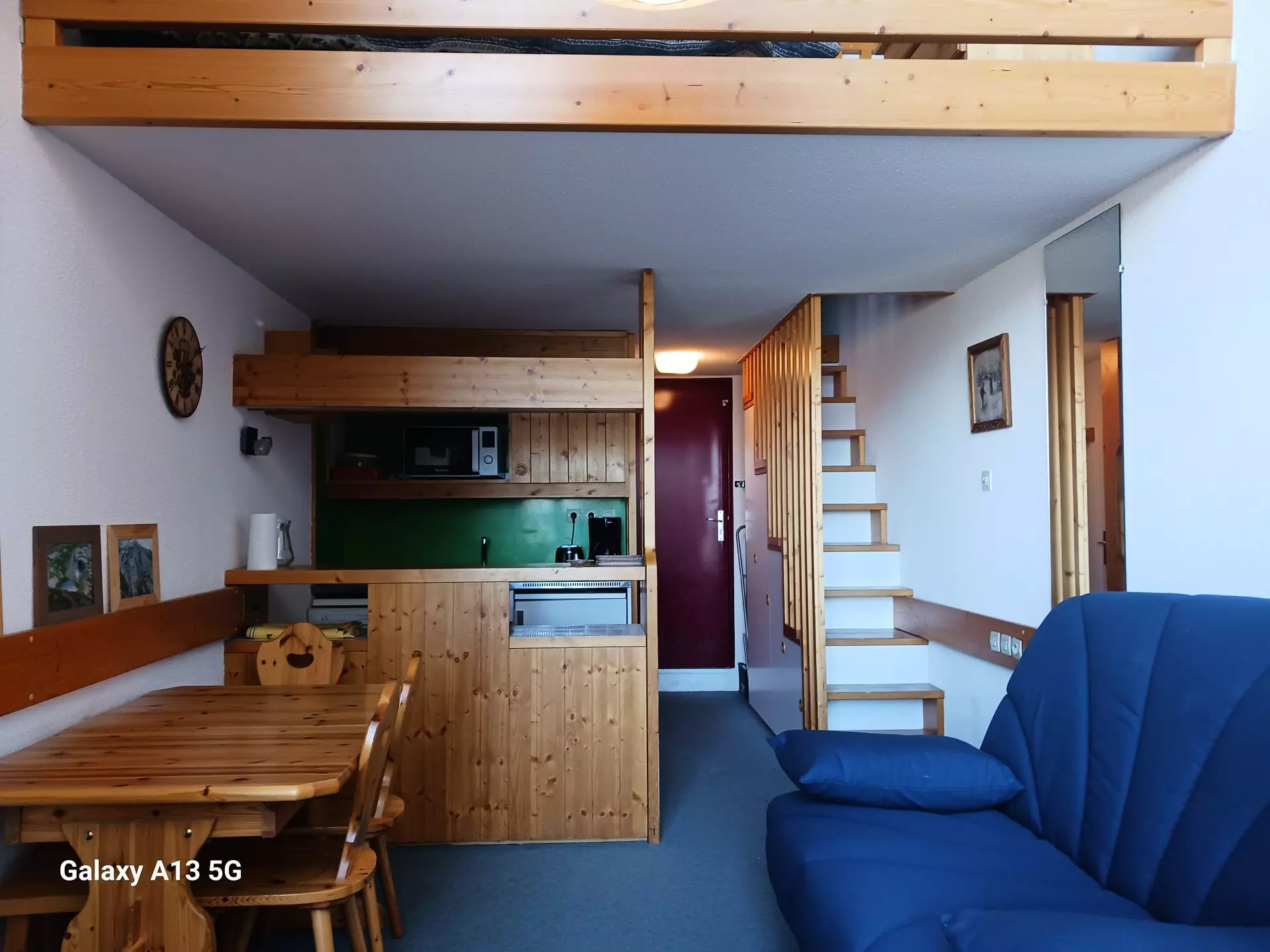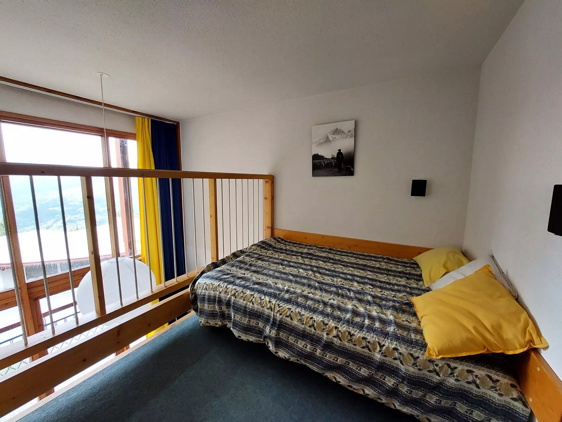 The mezzanine offers you 1 double bed (140 cm) and a mountain corner with a set of bunk beds.