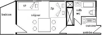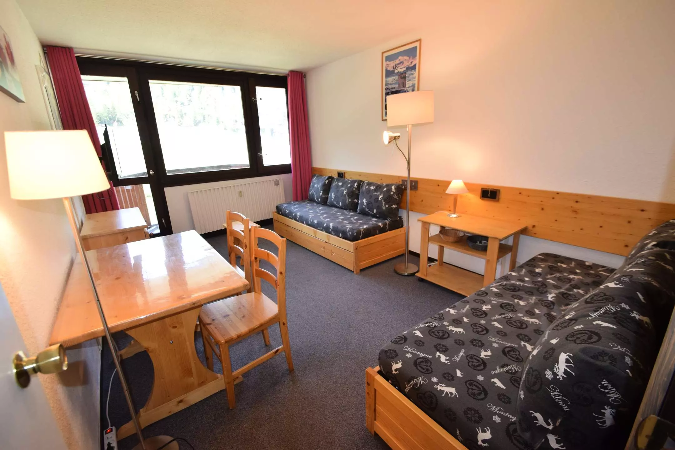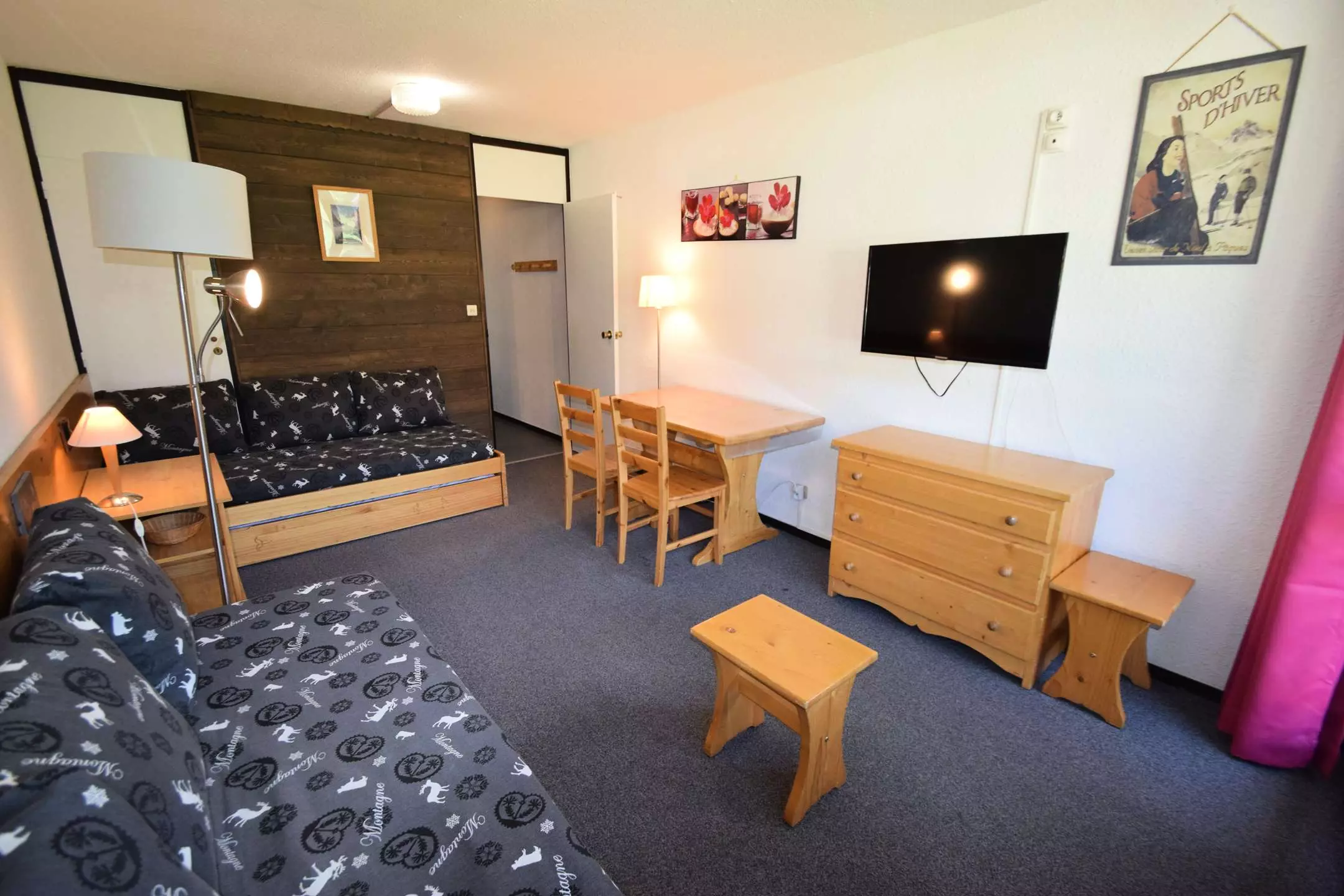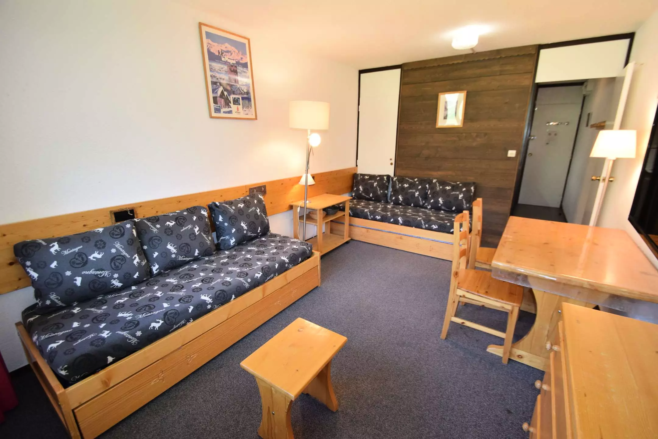 Studio for 3 people, 22m2, facing south with balcony overlooking the slopes, on the 5th floor with elevator - Kitchen: in the entrance: 2 ceramic hobs, refrigerator, microwave, dishwasher, electric coffee maker - Living room: 2 pull-out beds, 1 single bed, dining area, TV - Bathroom: bathtub, WC included, Floors: carpet in living room, plastic in entrance / bathroom - Bedding: 2 single duvets and 1 double duvet - Studio with a pleasant view of the slopes. Ski locker n°529 on the Villages side level-1 - Residence located at the foot of the slopes, connected to the shops by gallery - PETS NOT ALLOWED and NON-SMOKING APPT - End of stay cleaning, sheets, towels and ski passes are optional.