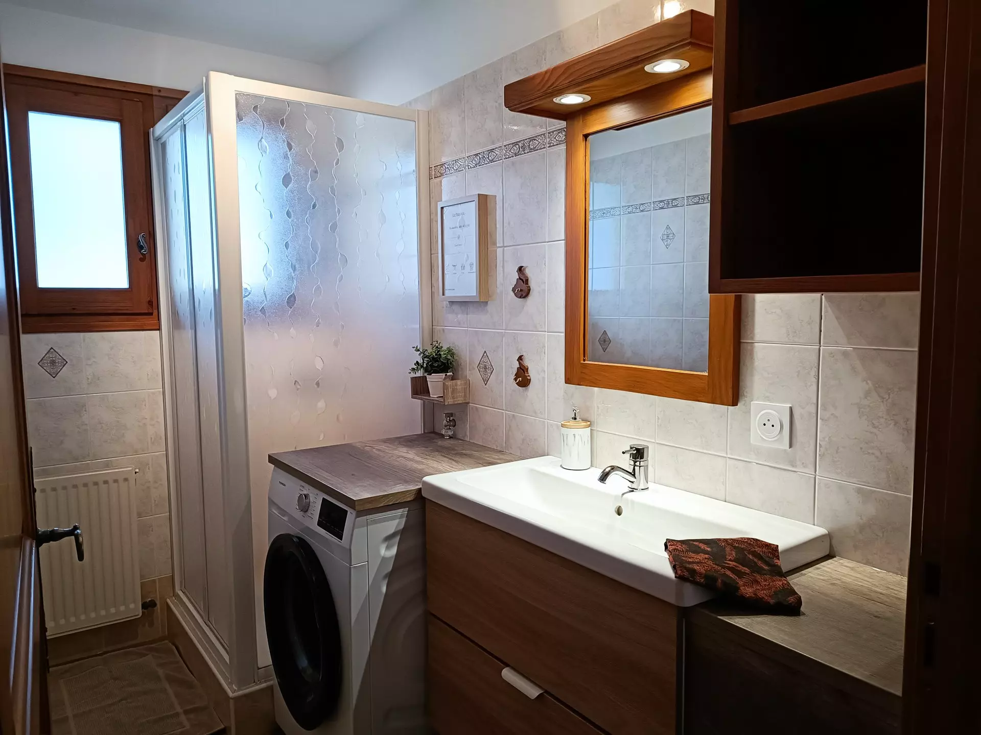 - Shower room with shower, sink and washing machine.