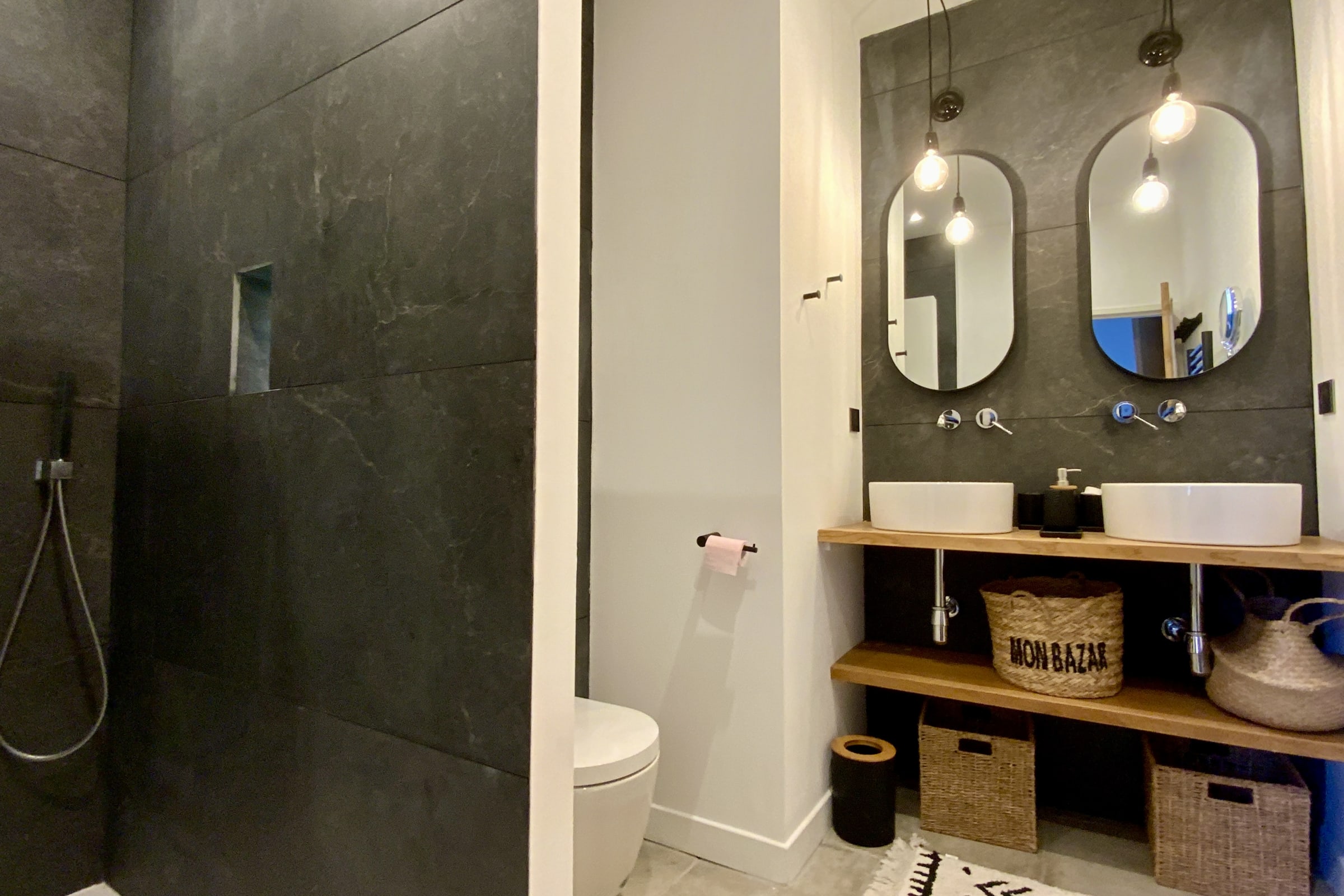 • A bathroom with walk-in shower, double sink, semi-separate WC and window.