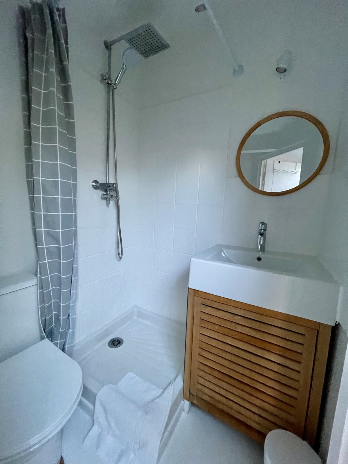 - a bathroom with shower cubicle, 90cm sink and WC.
