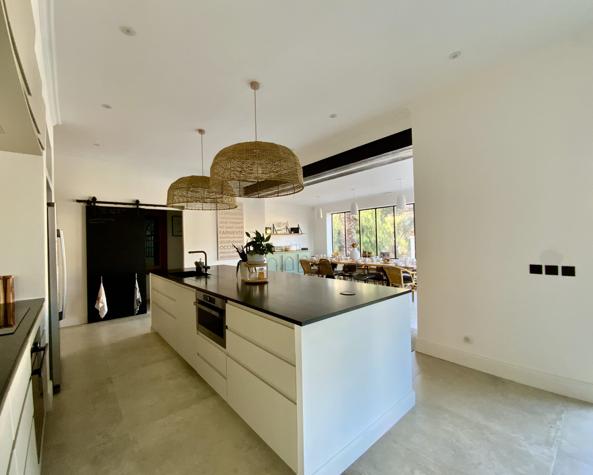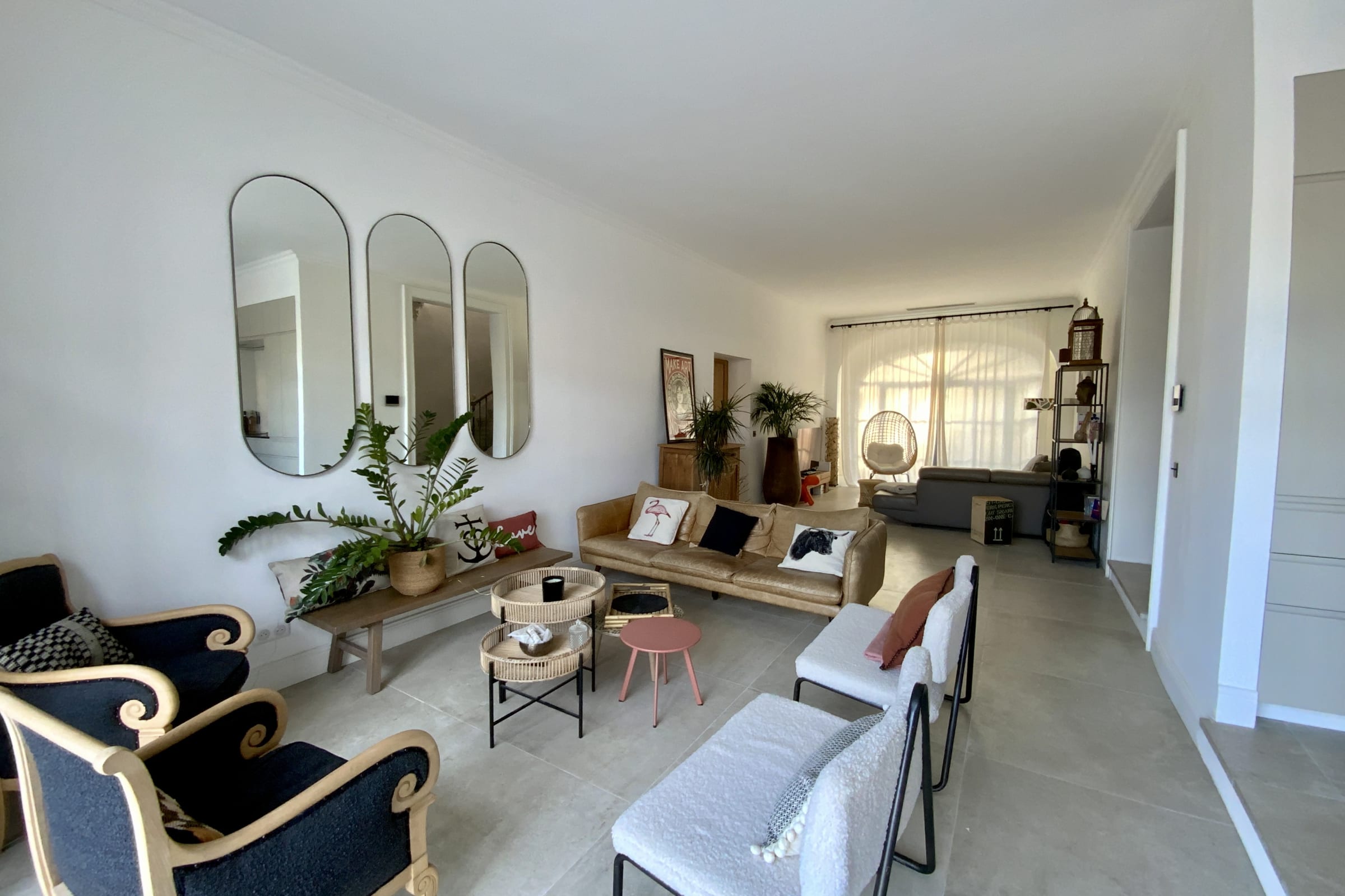 • A beautiful and vast living room bathed in light with large openings for a clear view of the garden and the swimming pool.
