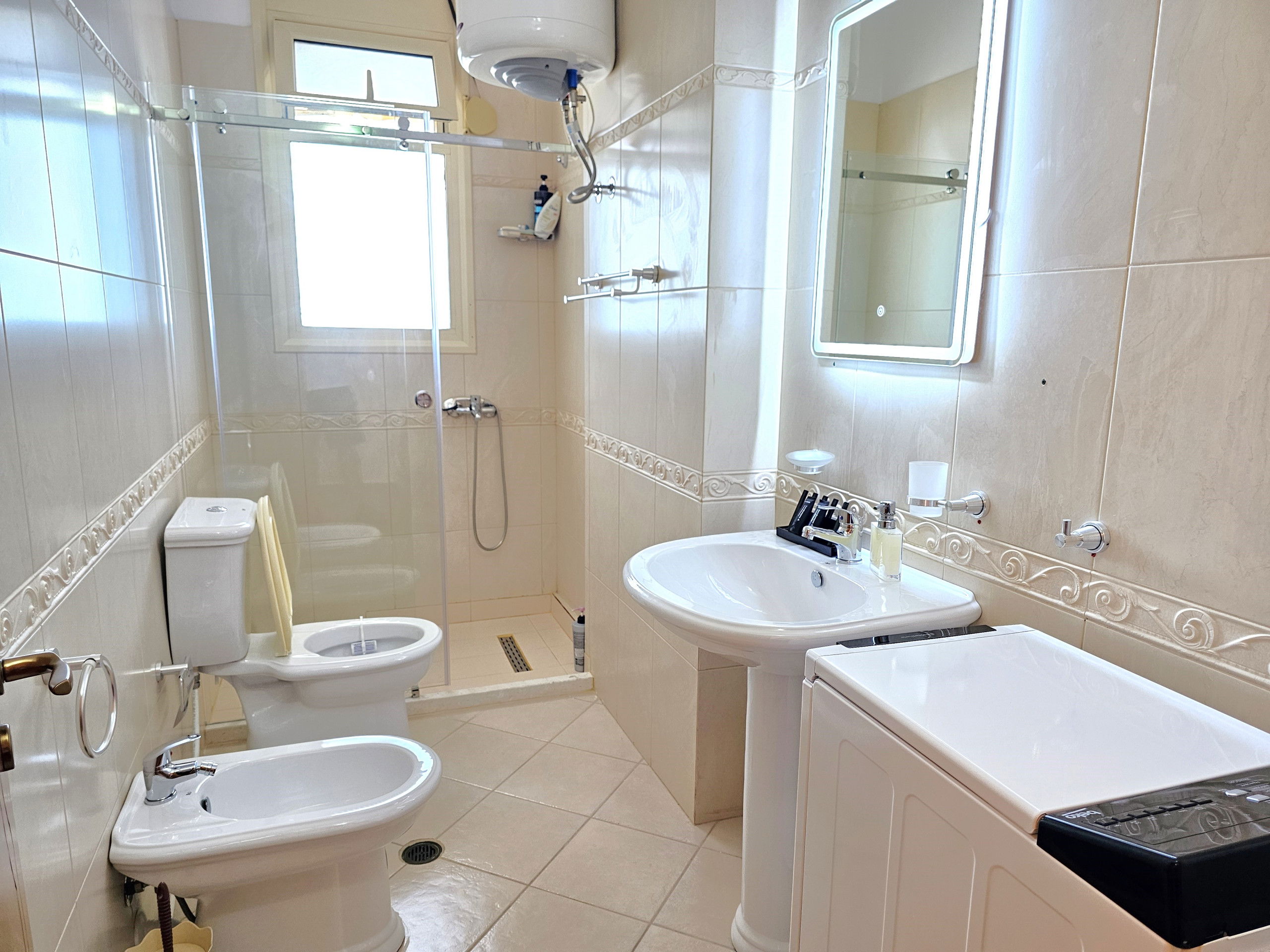 The American-style kitchen is a highlight, fully equipped with modern appliances including an induction cooktop, fridge, freezer, washing machine, dry machine, coffee machine, oven, toaster, and kettle. Perfect for preparing delightful meals during your stay. High-speed WiFi and a TV are available for entertainment and connectivity.